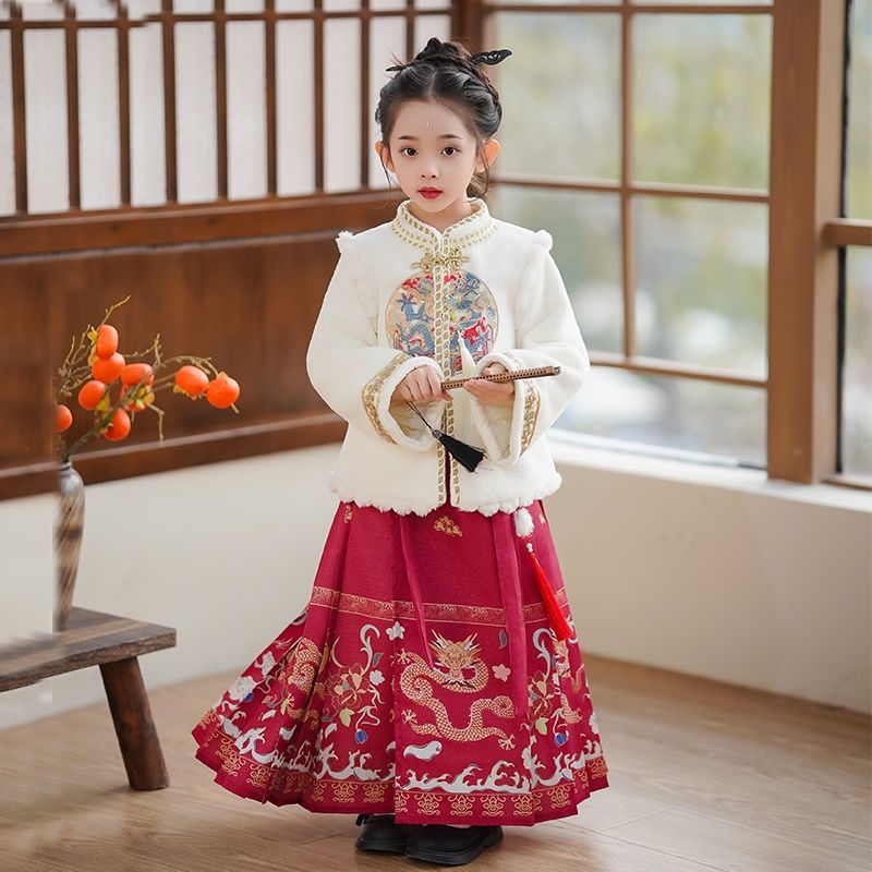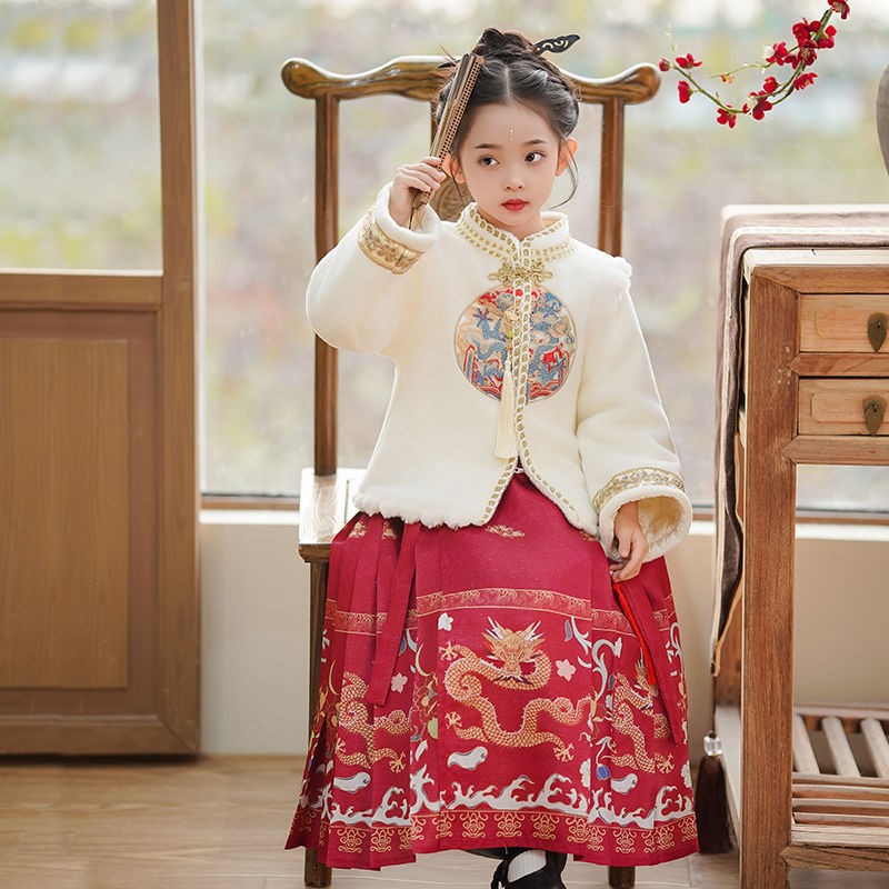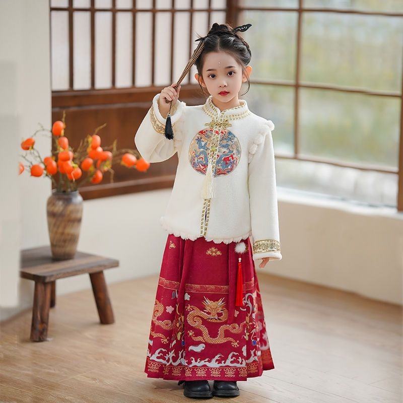 드래곤과 피닉스 청샹 말 얼굴 치마 소녀 겨울 한푸 기모 어린이 치마 원피스 2024 년 새 드래곤 년 옷