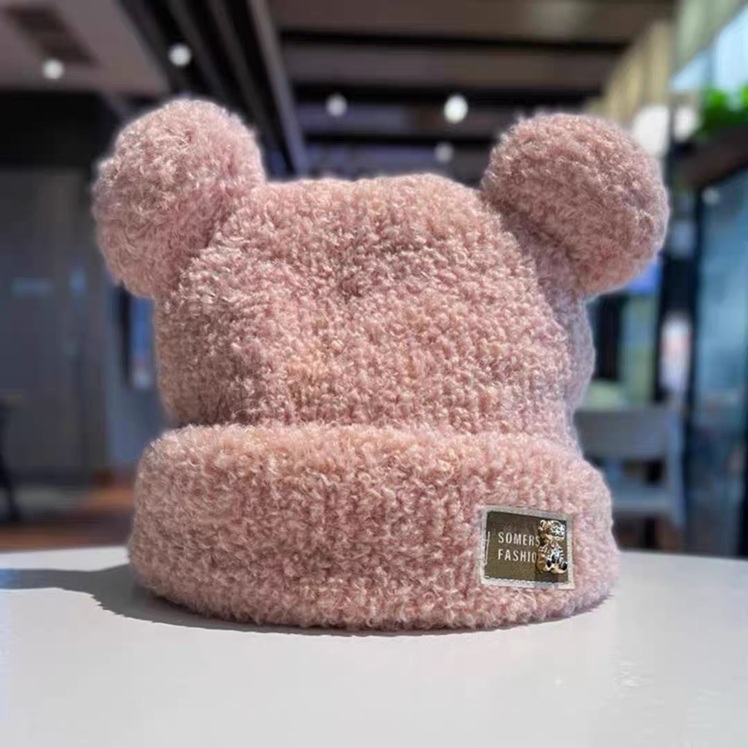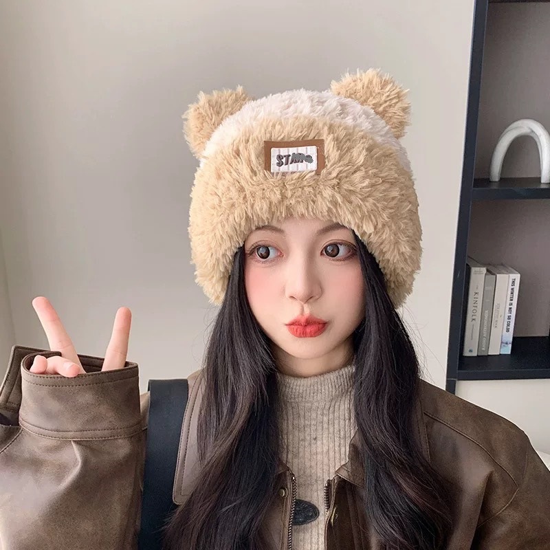 귀여운 곰돌이 모직 모자 여성용 겨울 2025년 인기 플러시 따뜻한 모자 가을 겨울 큰 머리 둘레 니트 모자