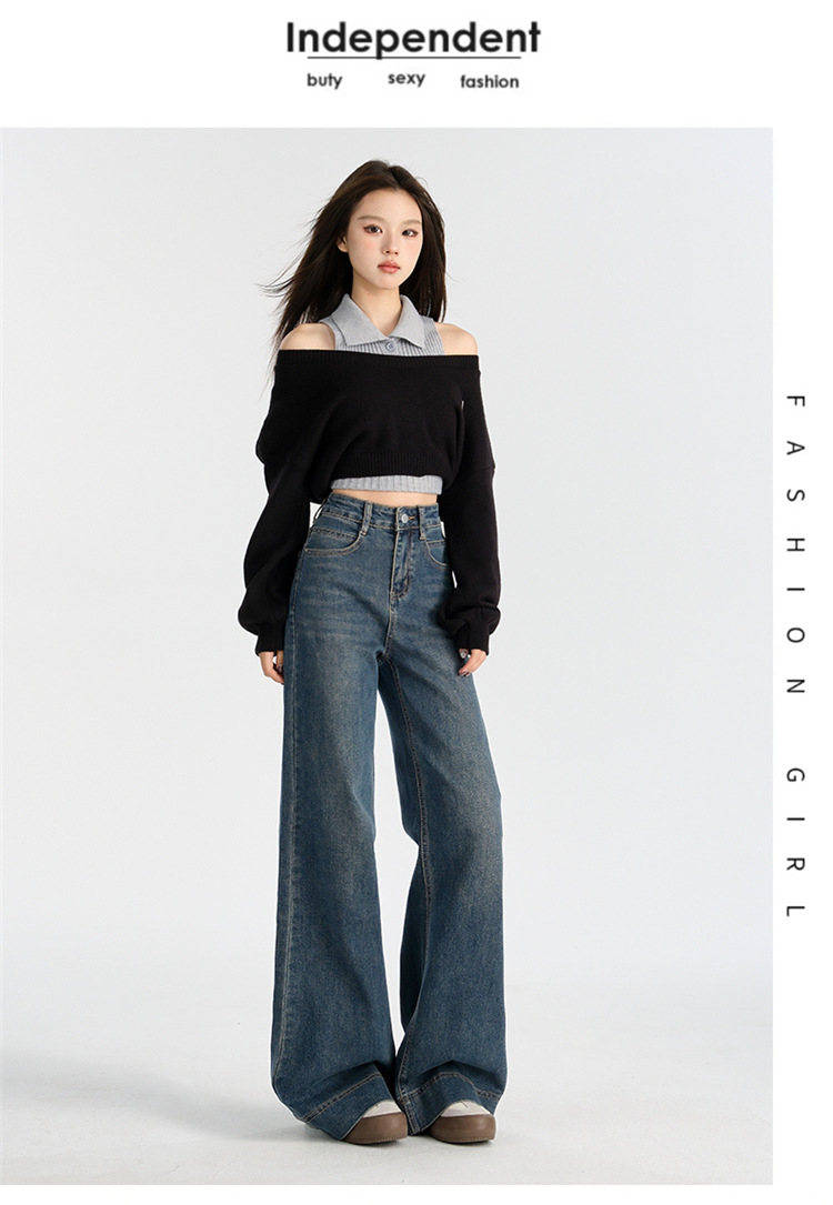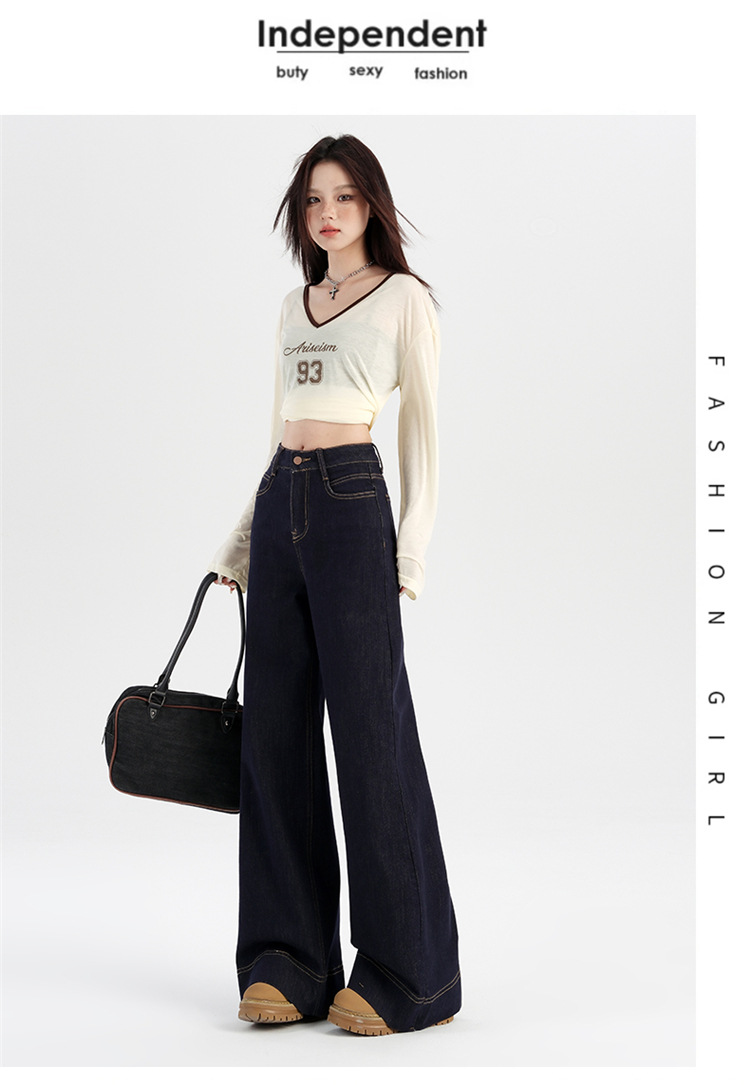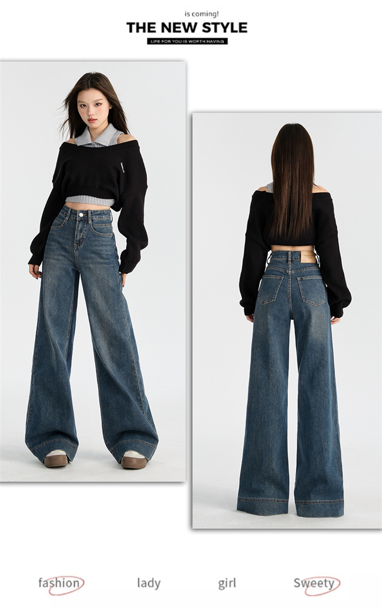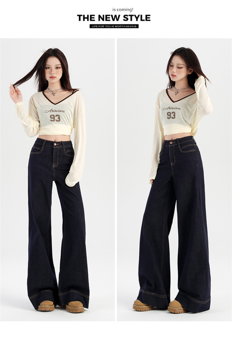 미국 타닌 블루 기모 청바지 여성의 가을과 겨울 새로운 스파이스 소녀 디자인 센스 스트레치 걸레 루즈 큰 플레어 바지