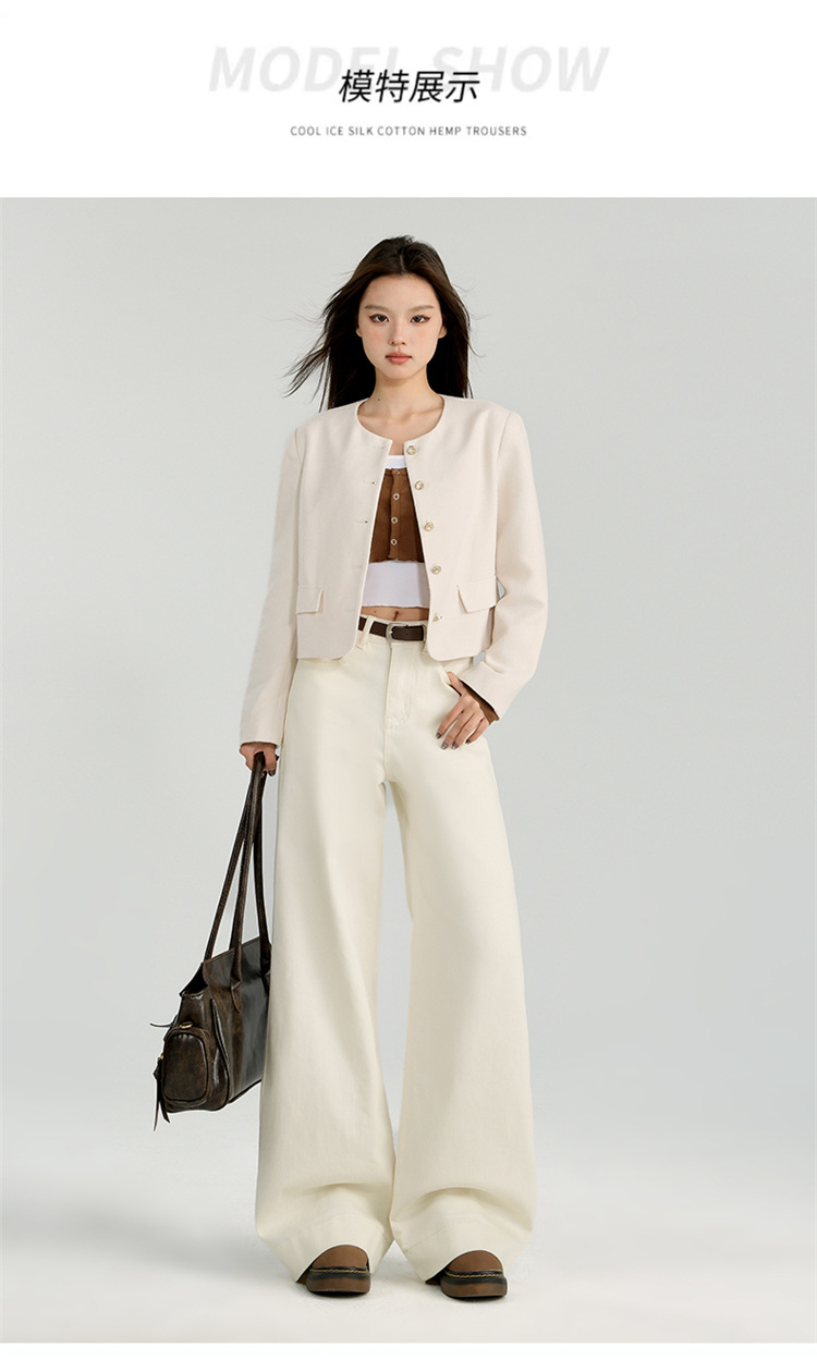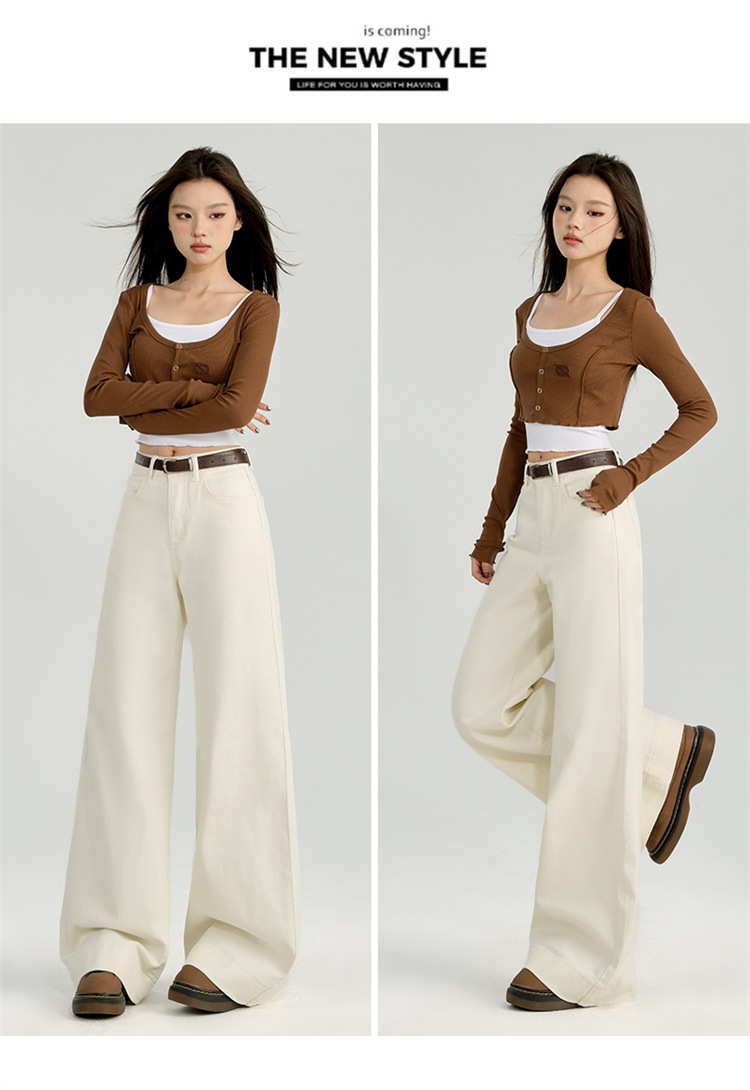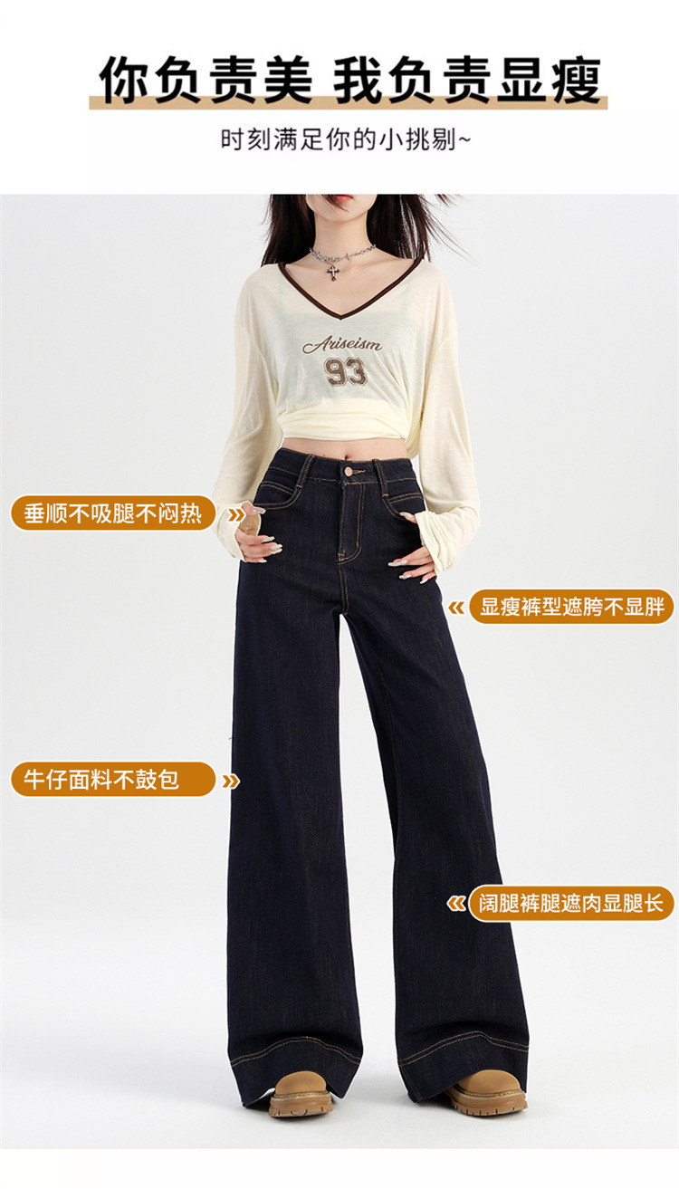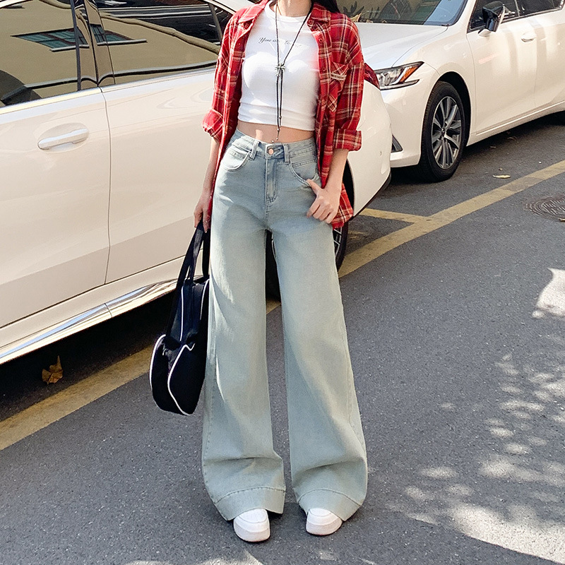 미국 타닌 블루 기모 청바지 여성의 가을과 겨울 새로운 스파이스 소녀 디자인 센스 스트레치 걸레 루즈 큰 플레어 바지
