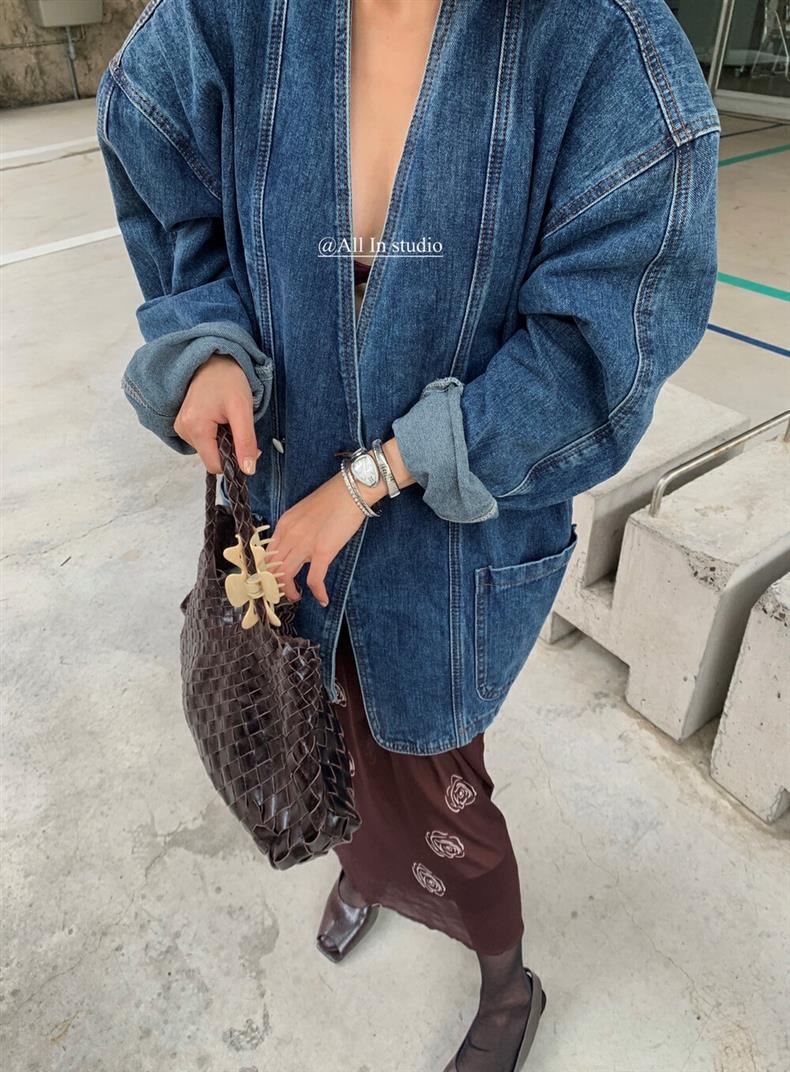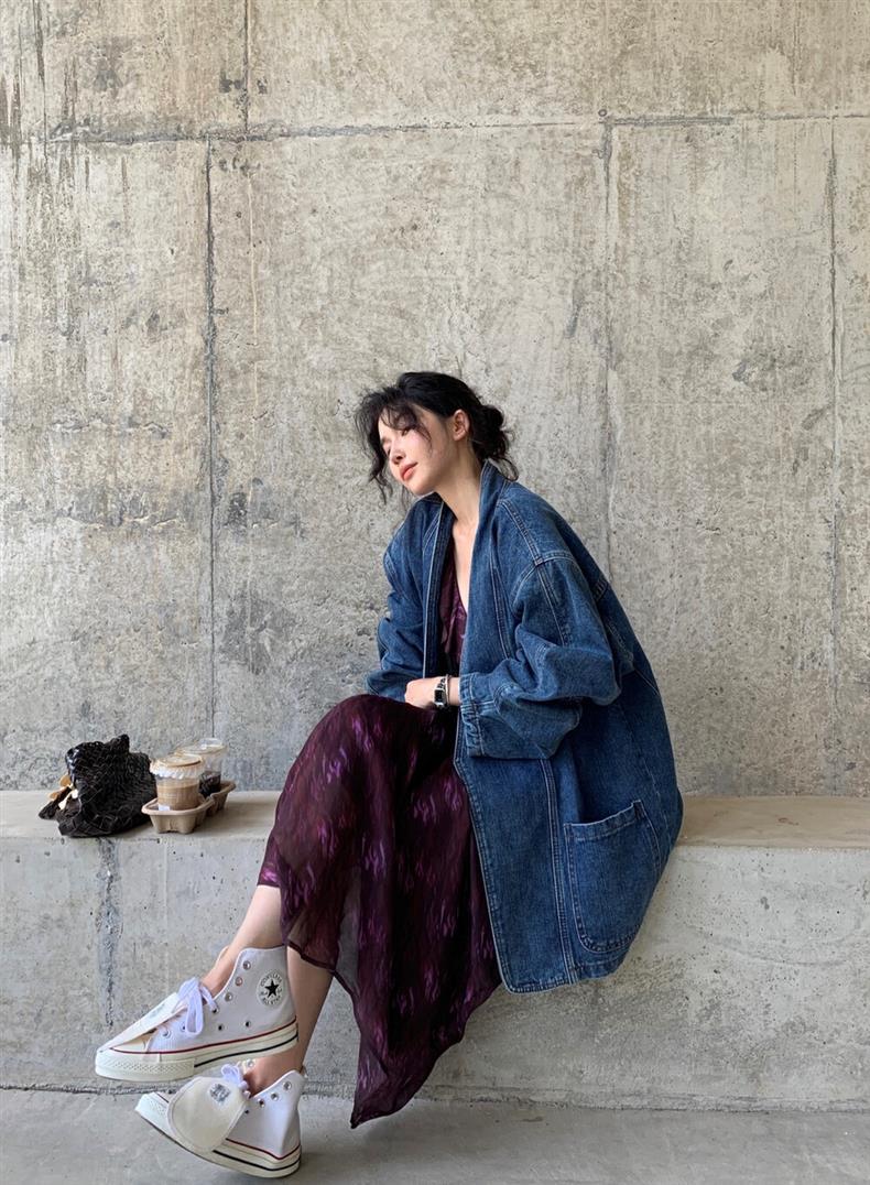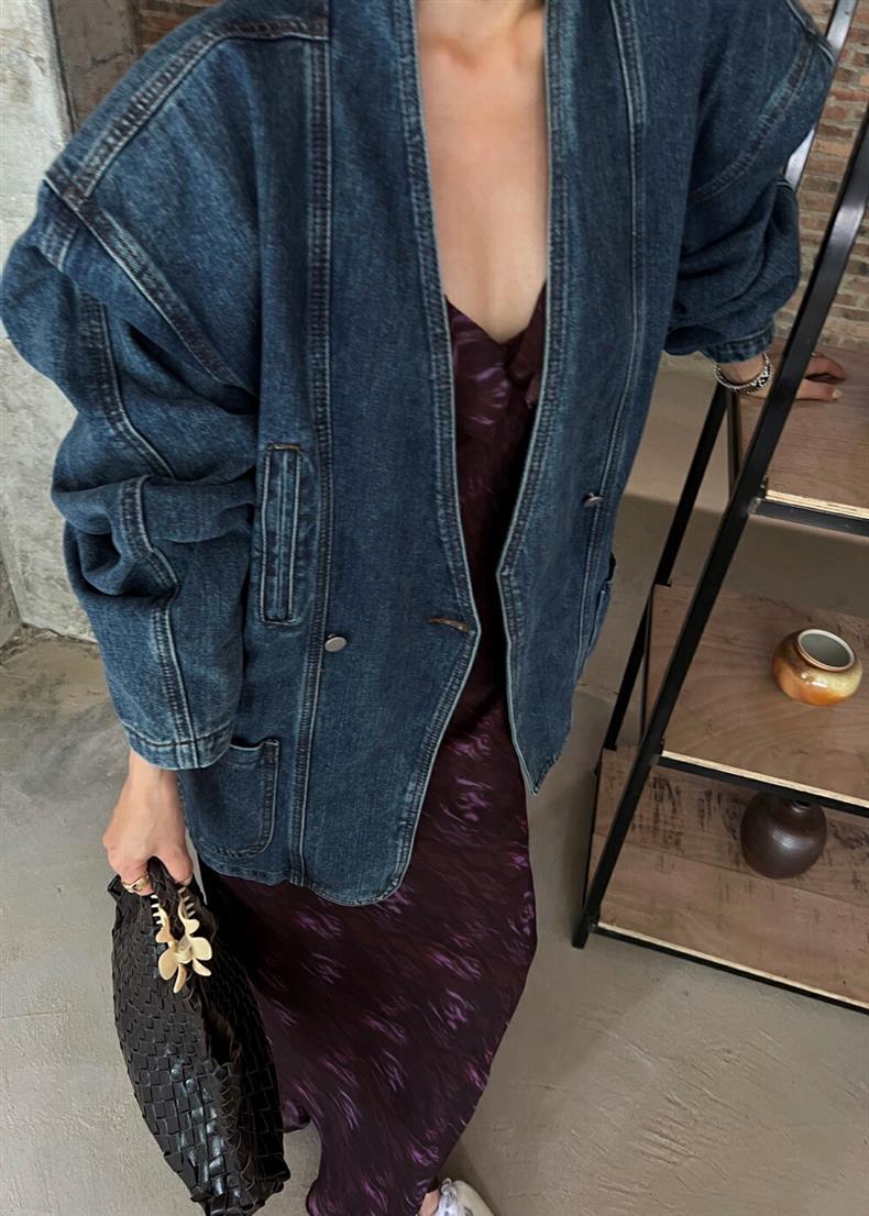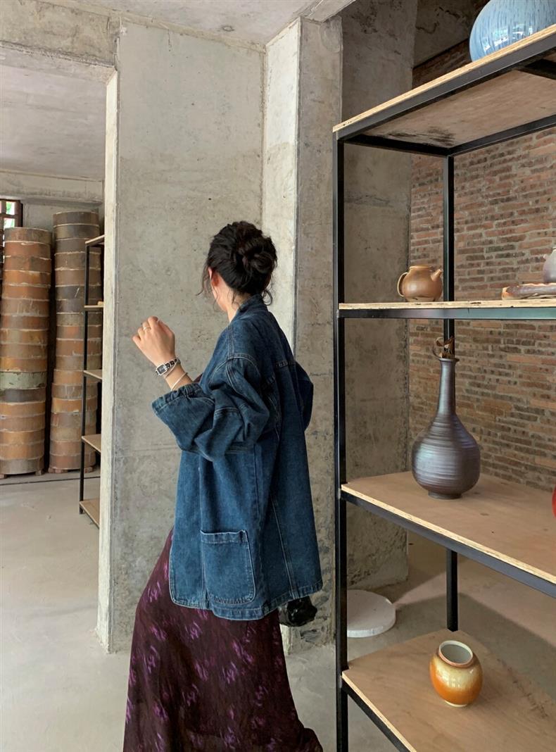 2025 년 이른 봄 새로운 레트로 스트리트 스타일의 느슨한 디자인 센스 더블 브레스트 패드 숄더 데님 코트 여성용 재킷 탑