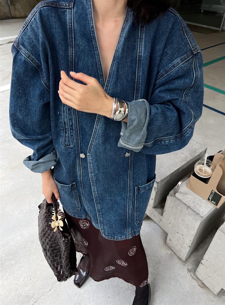2025 년 이른 봄 새로운 레트로 스트리트 스타일의 느슨한 디자인 센스 더블 브레스트 패드 숄더 데님 코트 여성용 재킷 탑스토어 가기