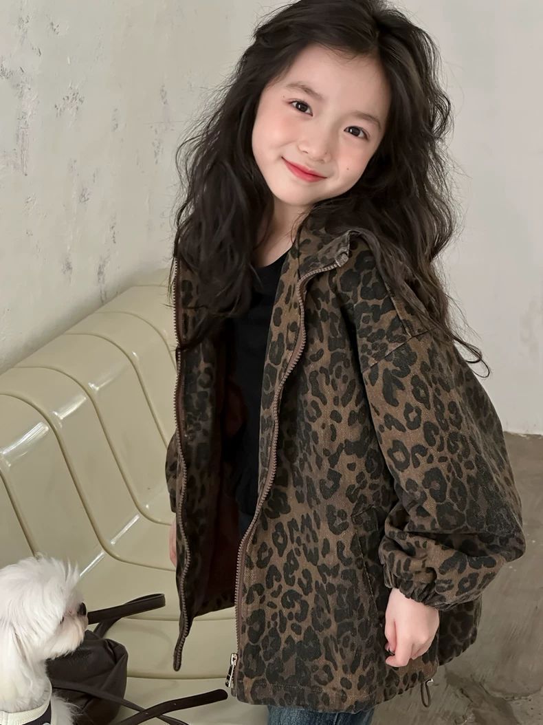 여아 아동용 코트 가을 겨울 신상 한국 스타일 홍콩풍 중대형 아동 캐주얼 만능 레오파드 프린트 지퍼 코트스토어 가기