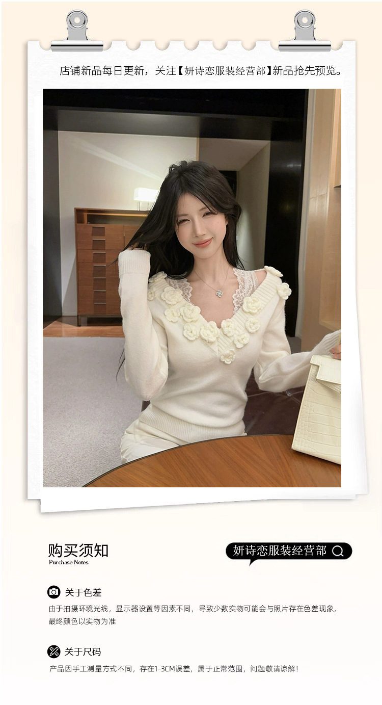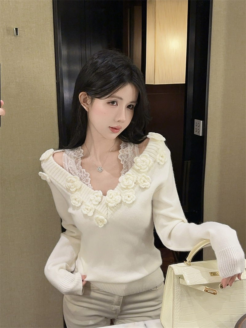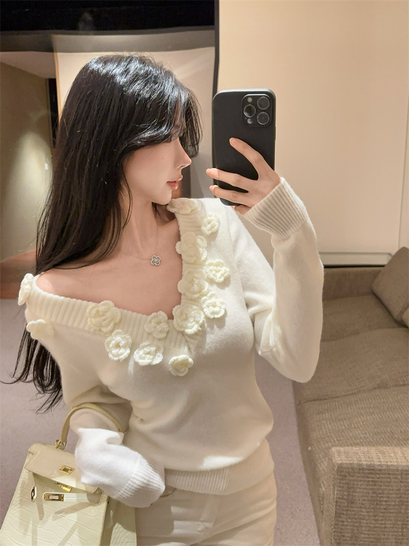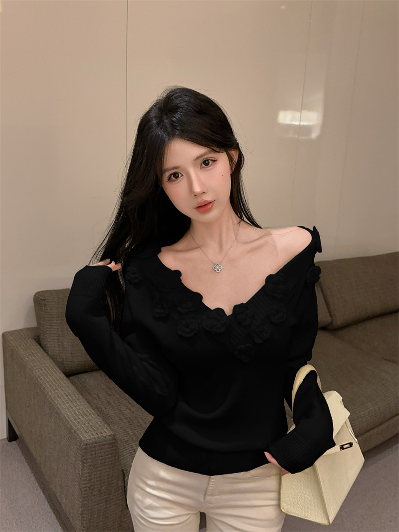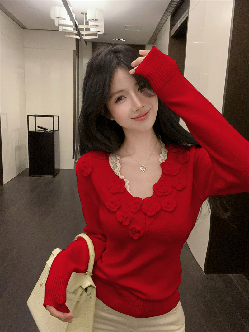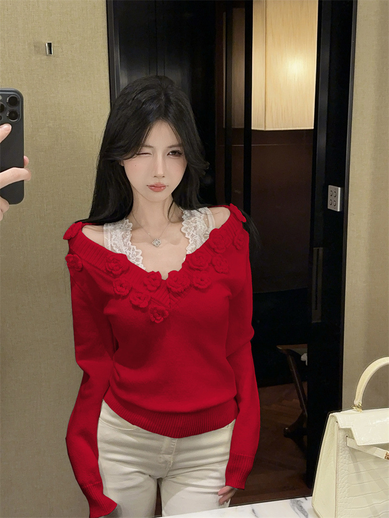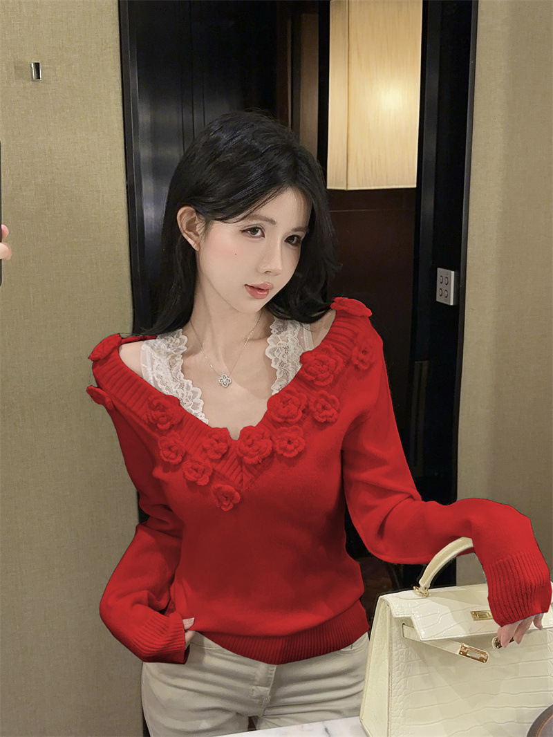 크리스마스 붉은 꽃 오프 숄더 스웨터 여성의 가을과 겨울 디자인 센스 V 넥 스웨터 짧은 분위기스토어 가기