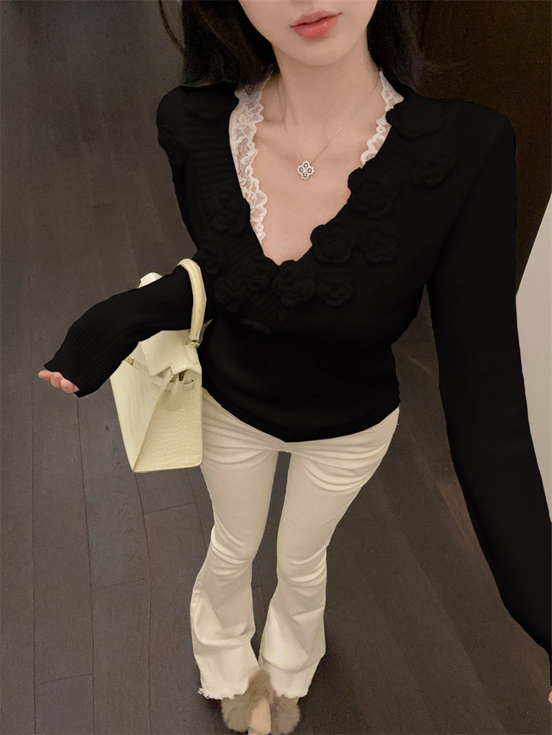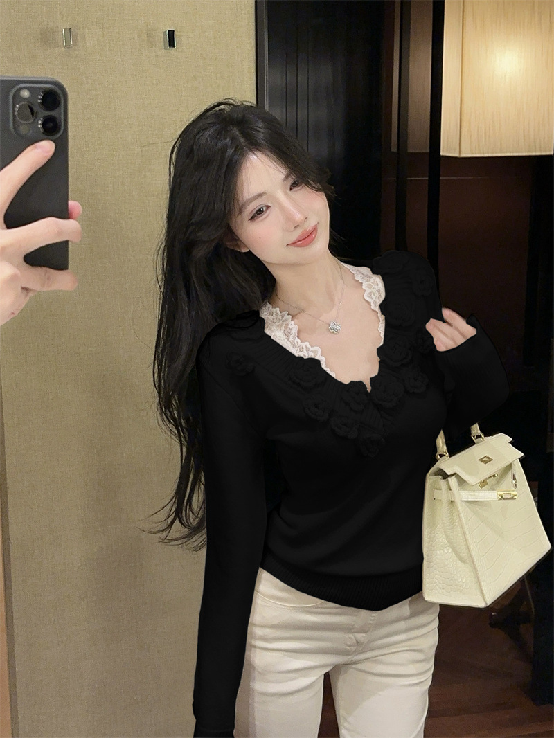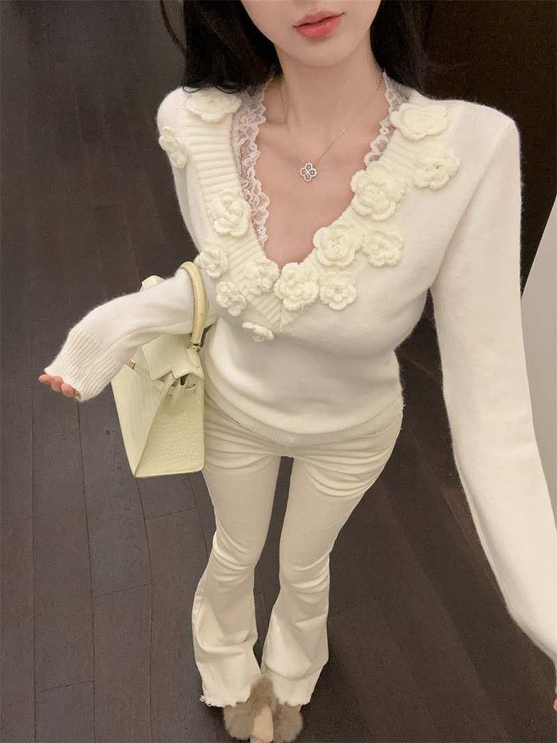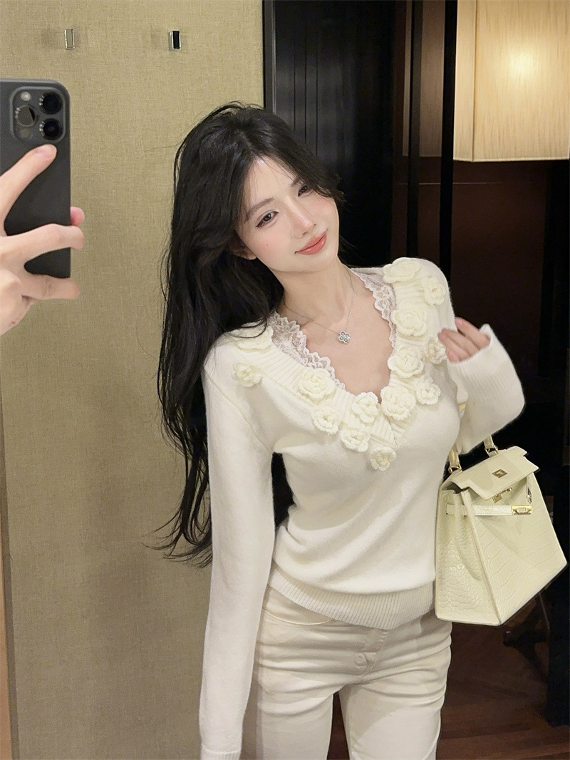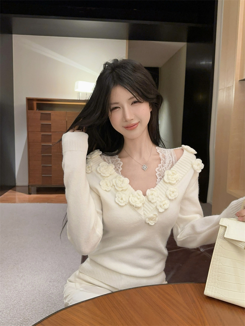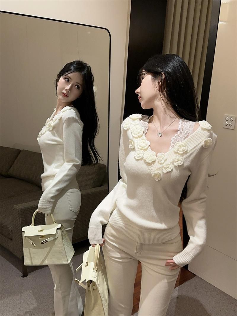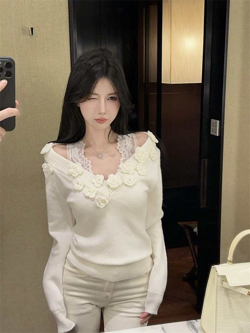 크리스마스 붉은 꽃 오프 숄더 스웨터 여성의 가을과 겨울 디자인 센스 V 넥 스웨터 짧은 분위기스토어 가기