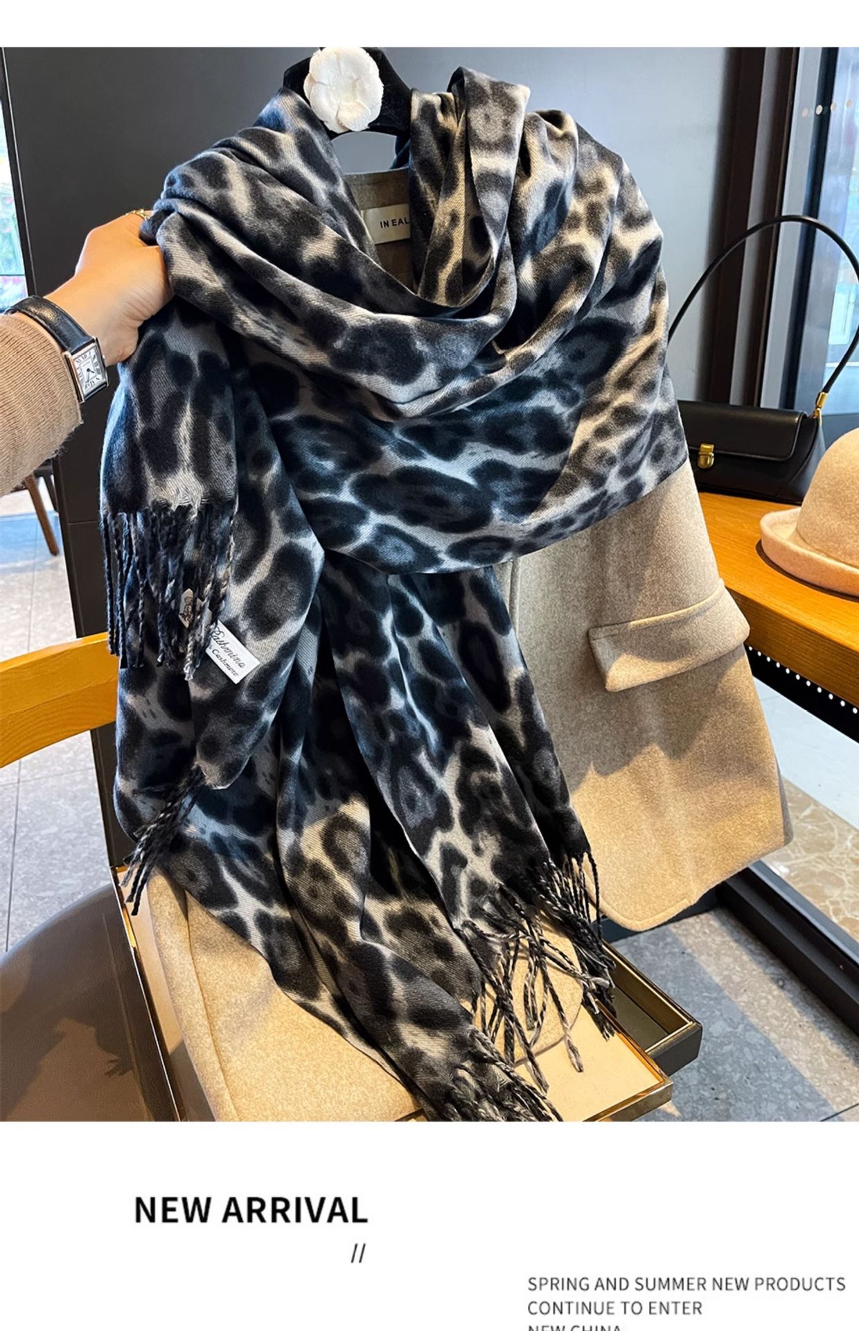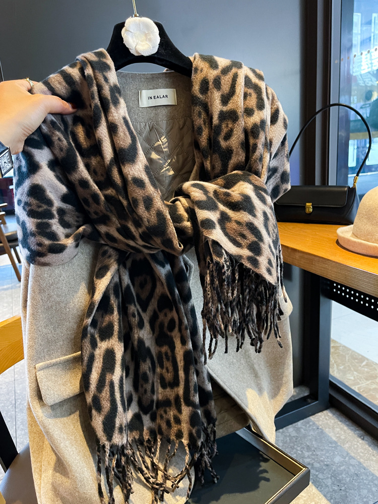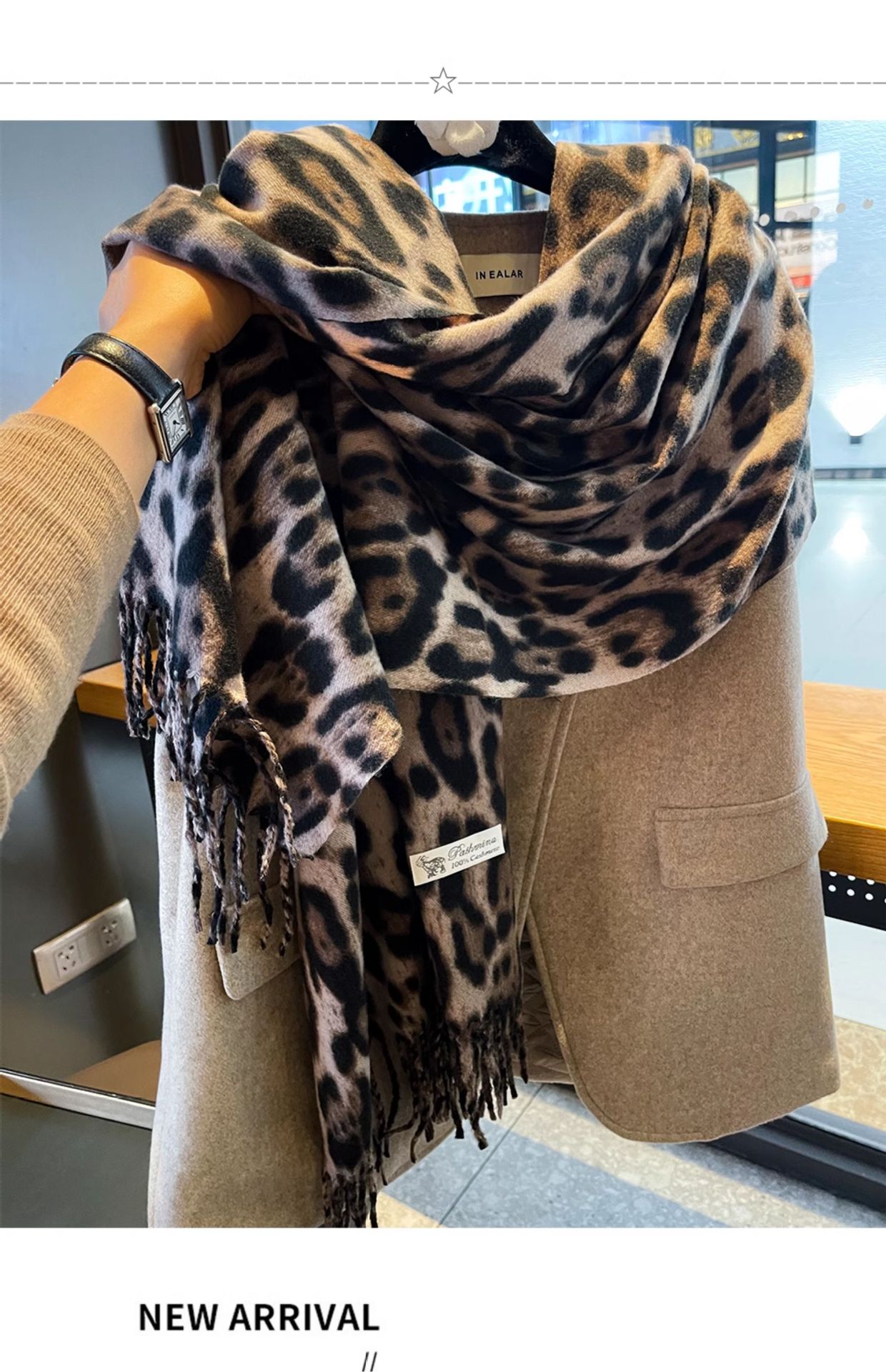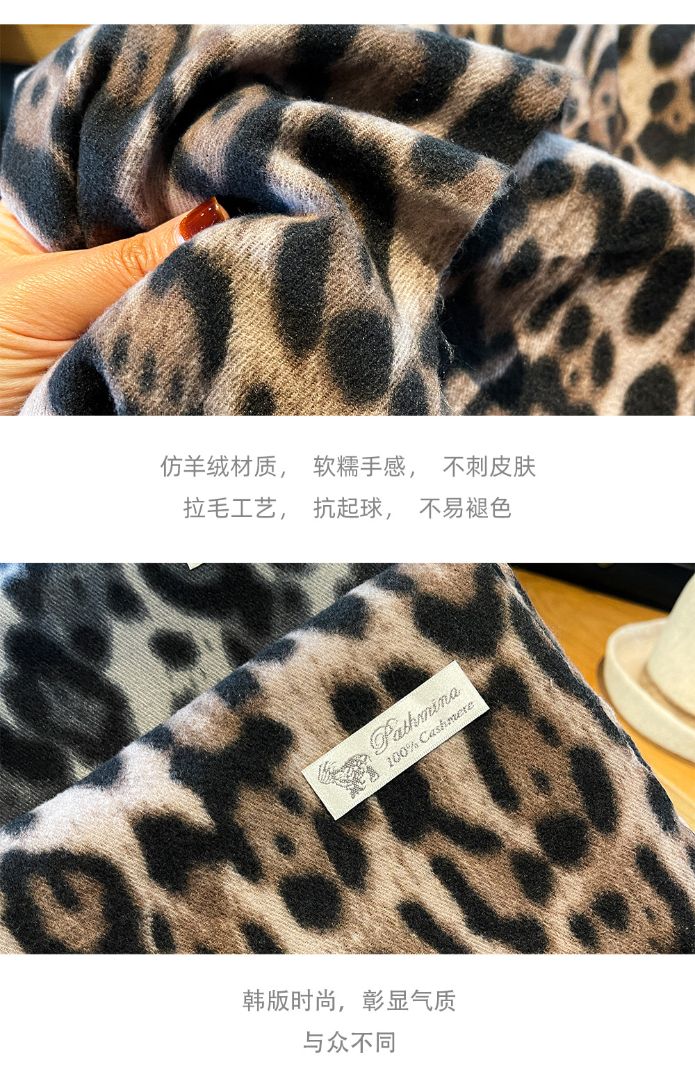 时髦精甜酷豹纹复古流苏仿羊绒保暖围巾女2024冬季辣妹风披肩围脖