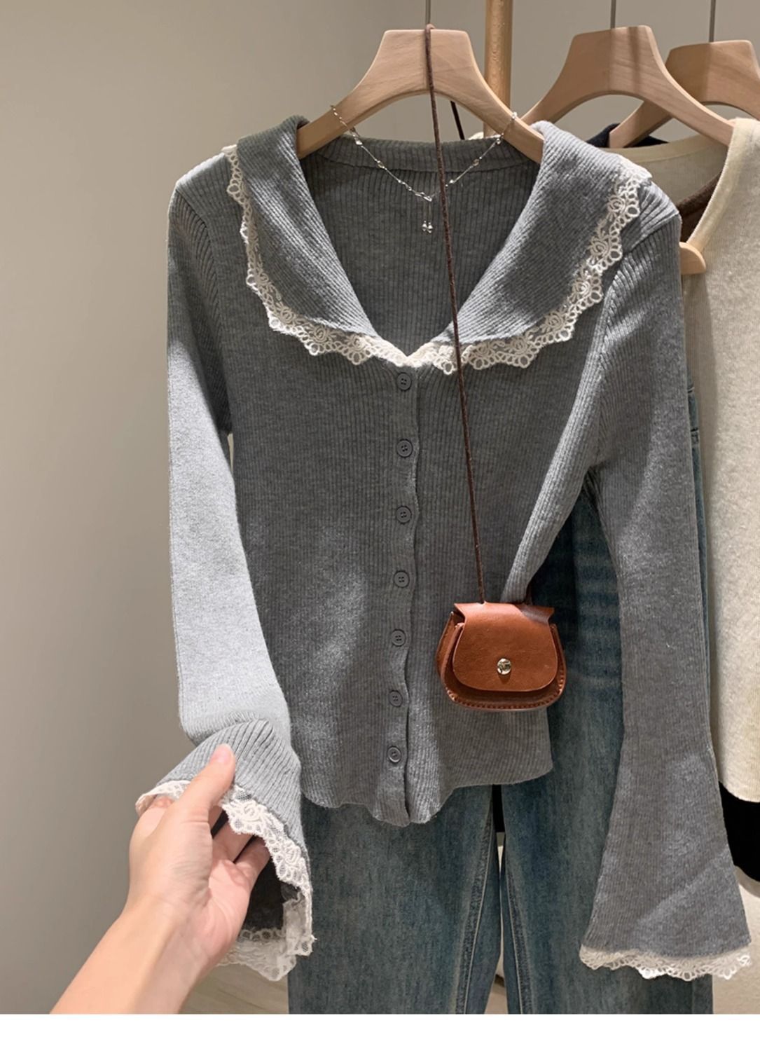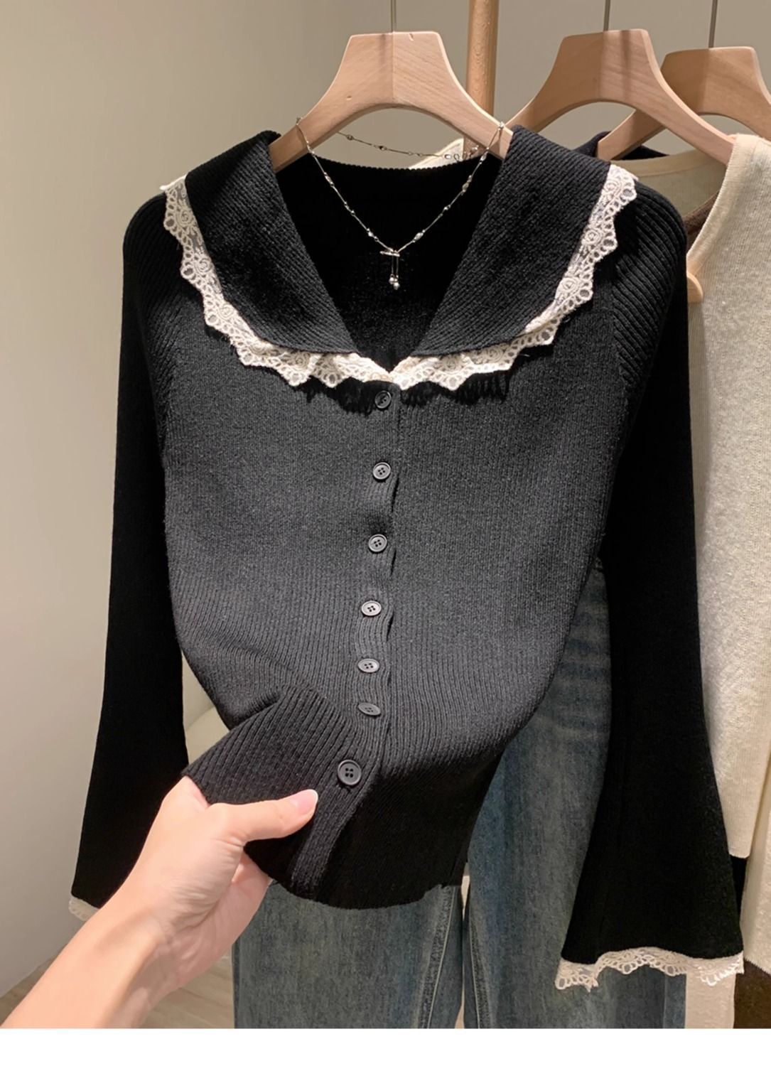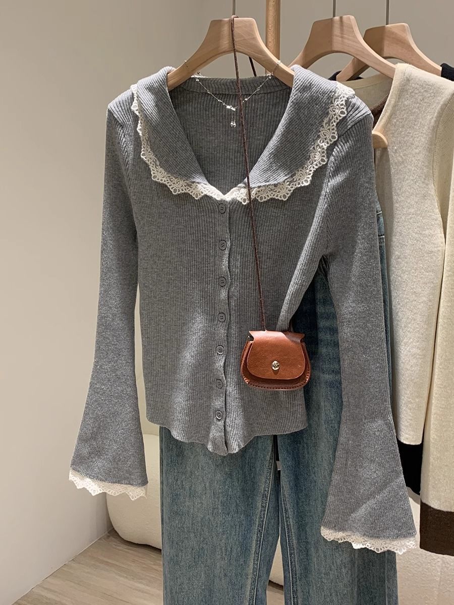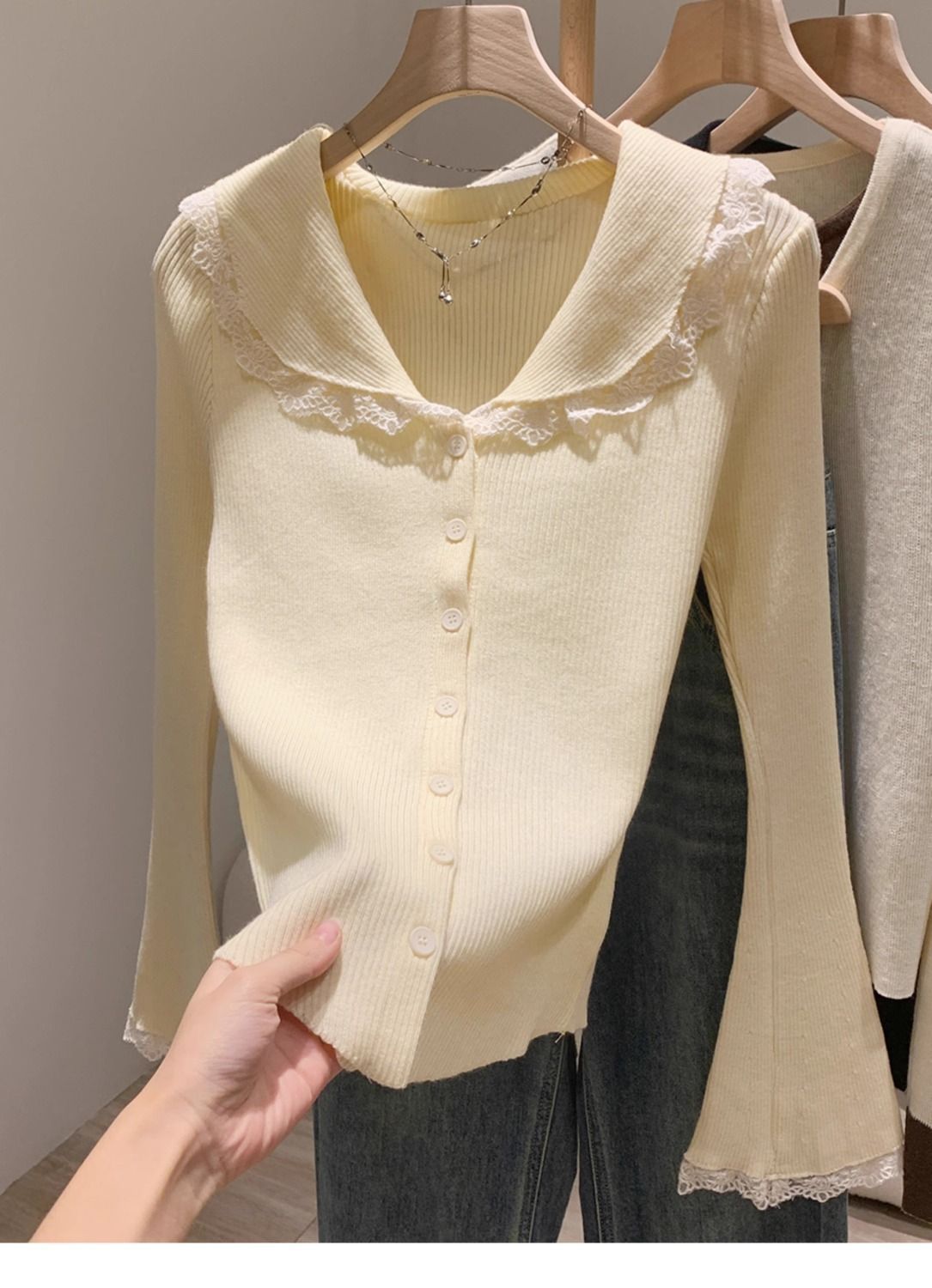 레이스 스티칭 레이스 인형 칼라 니트 카디건 여성용 내복 가을과 겨울 샤넬 스타일 옷깃 스웨터베이스 셔츠 아우터