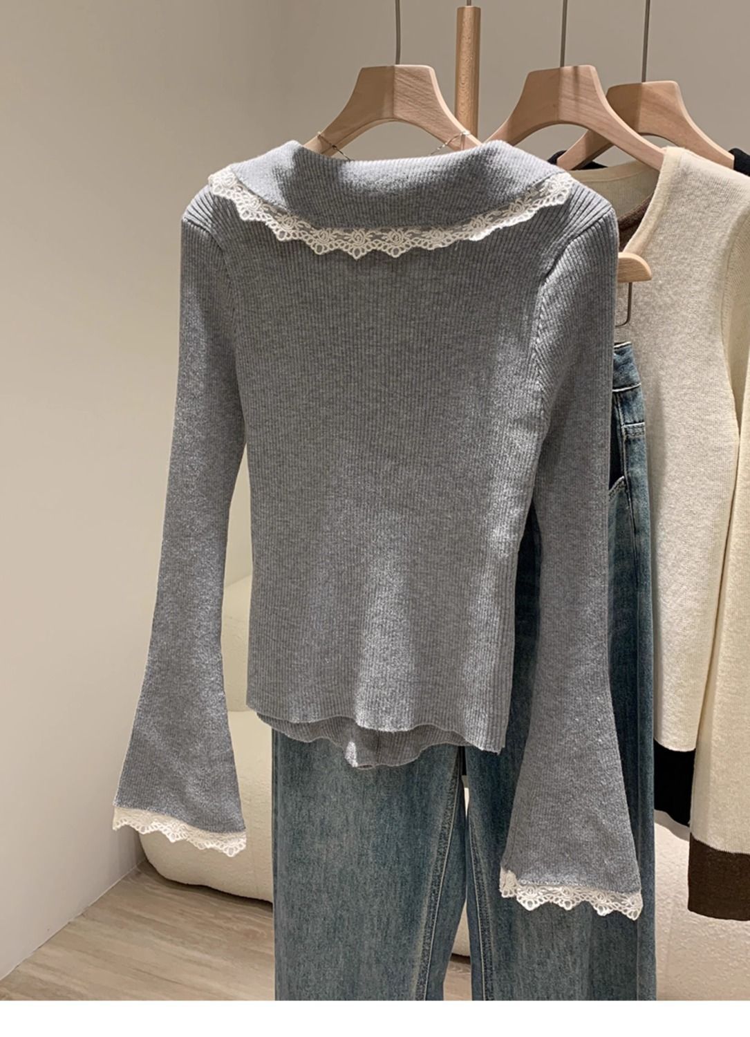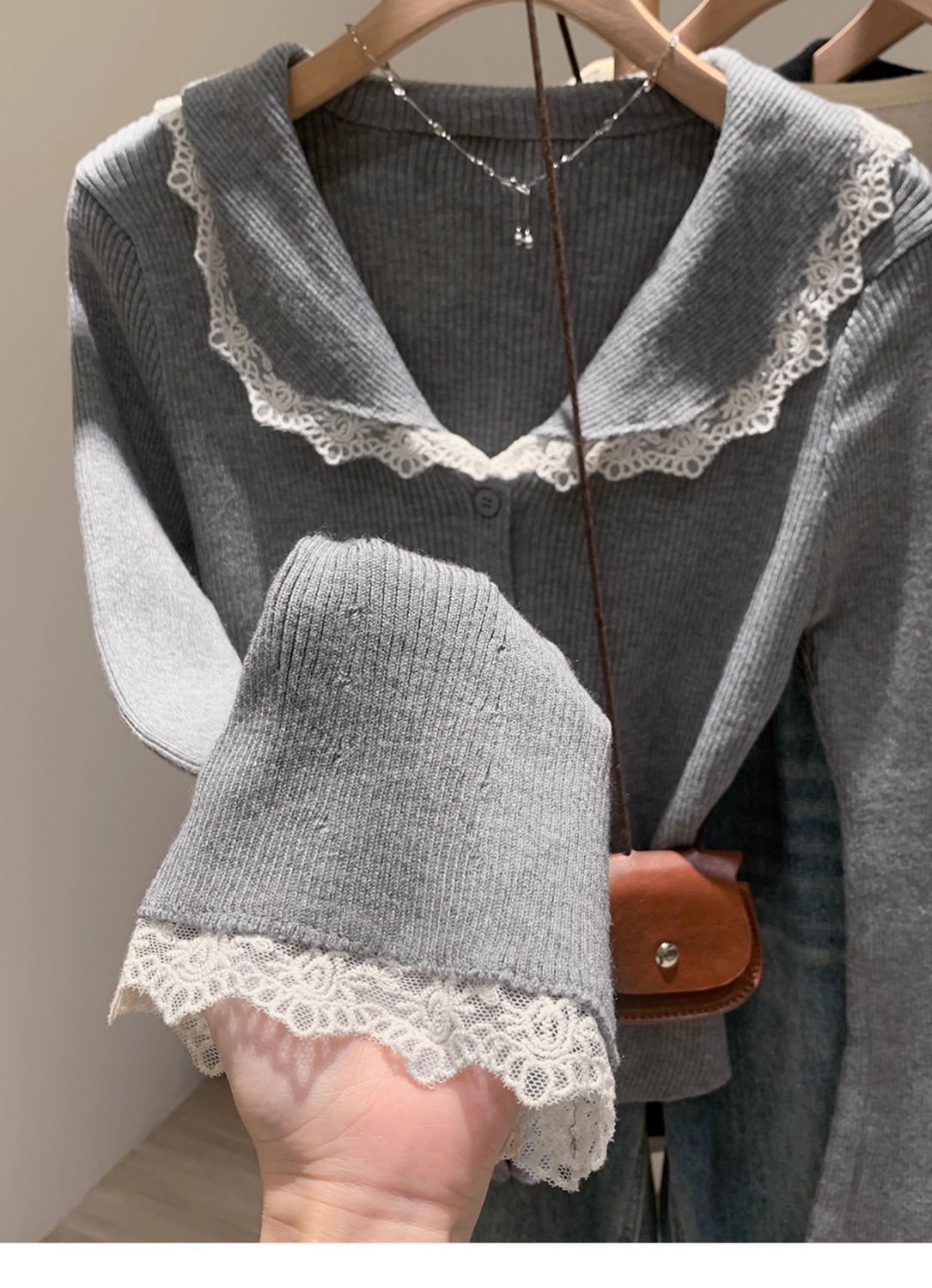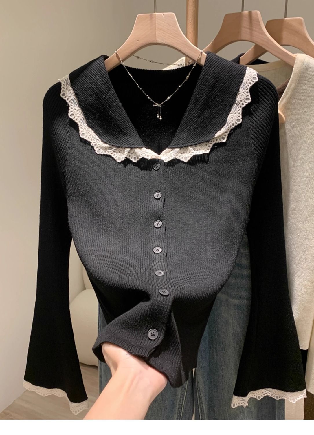 레이스 스티칭 레이스 인형 칼라 니트 카디건 여성용 내복 가을과 겨울 샤넬 스타일 옷깃 스웨터베이스 셔츠 아우터