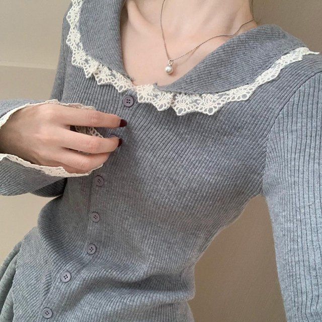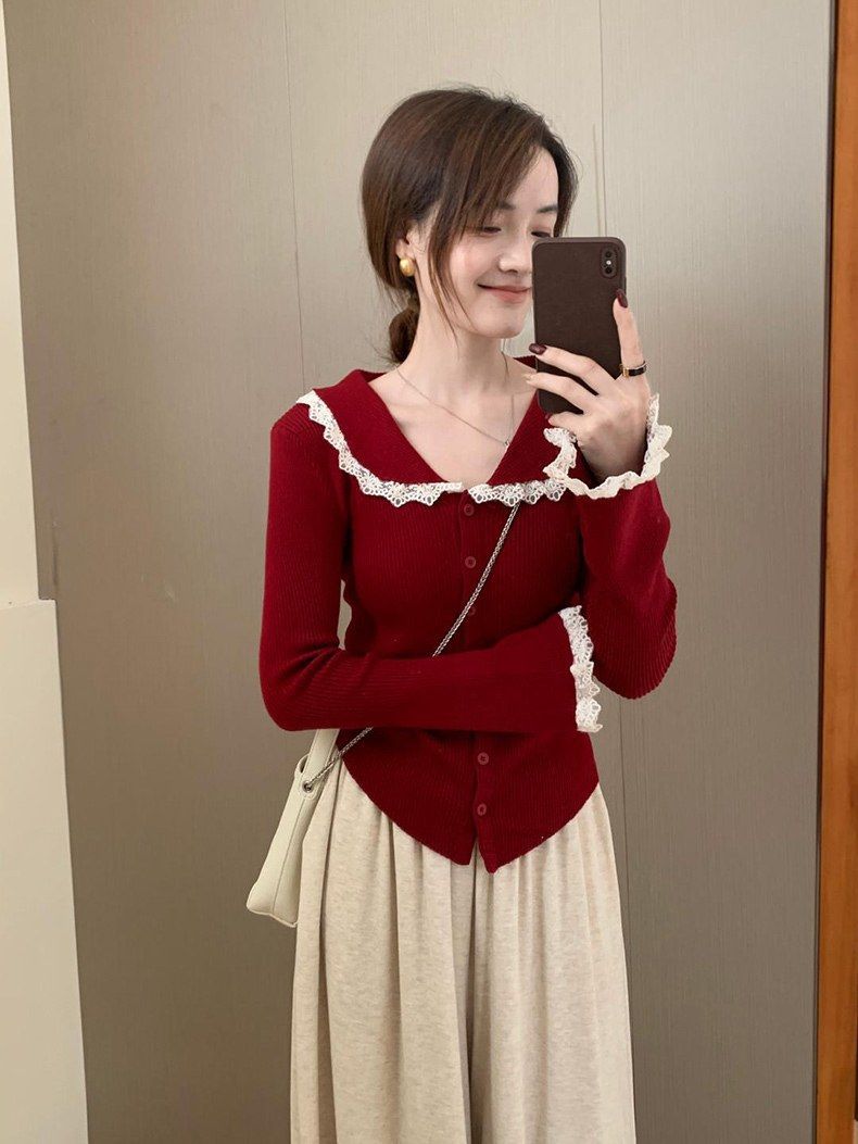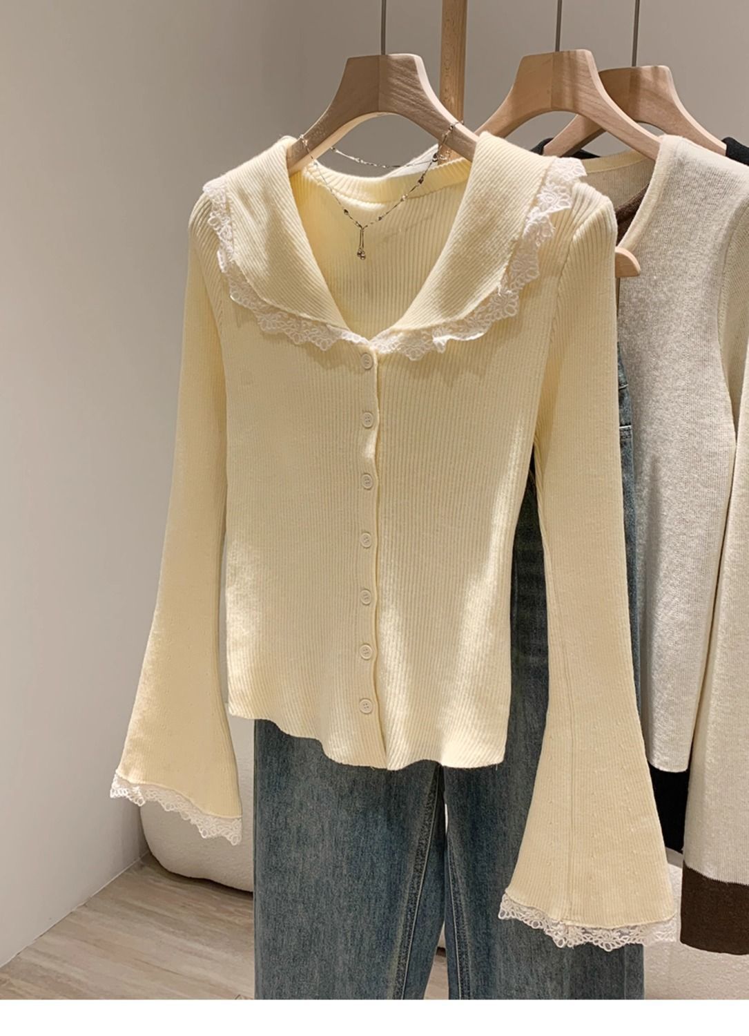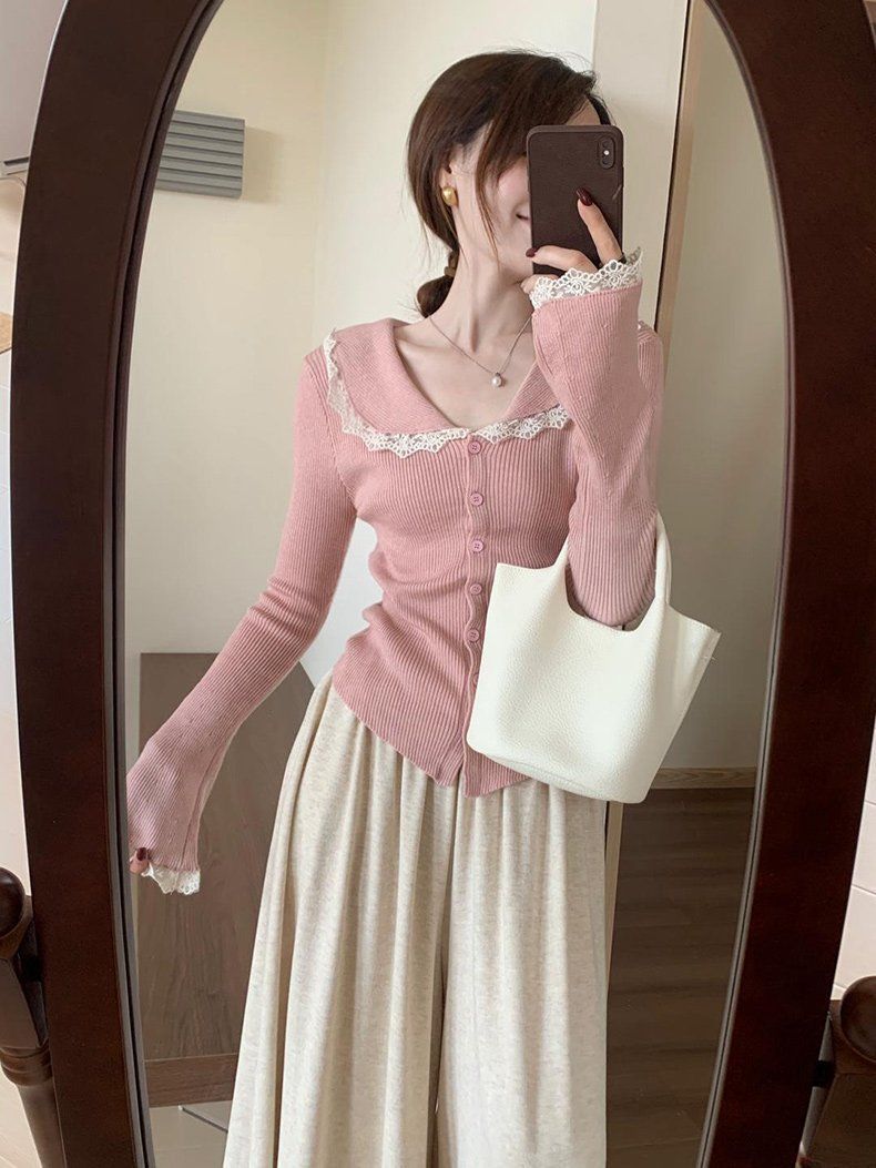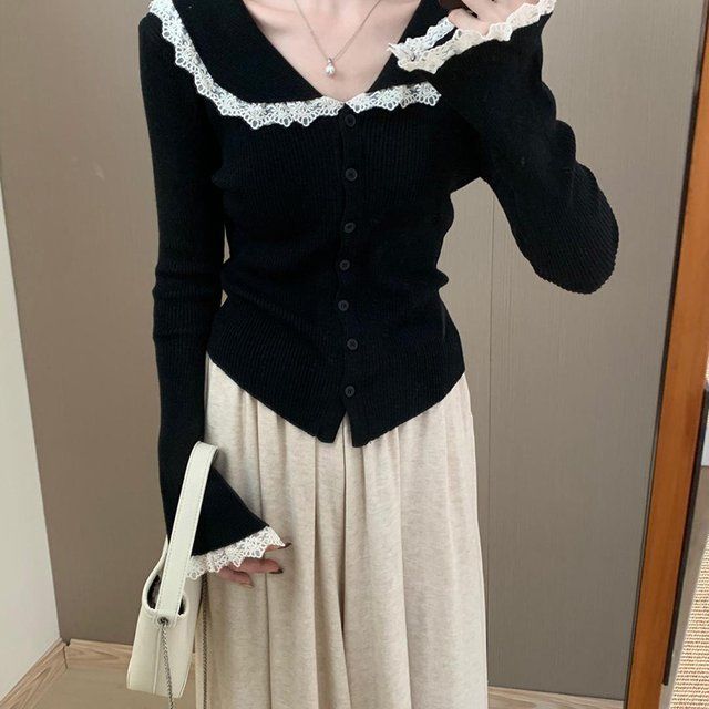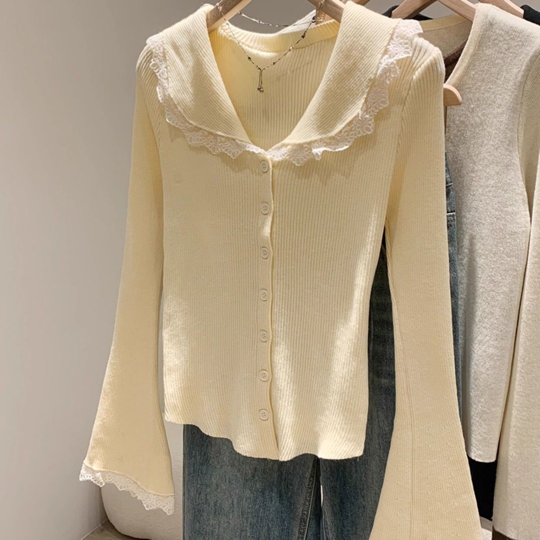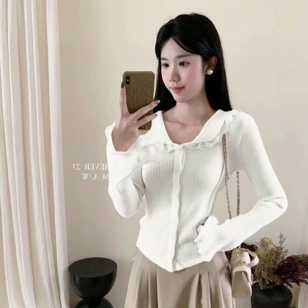 레이스 스티칭 레이스 인형 칼라 니트 카디건 여성용 내복 가을과 겨울 샤넬 스타일 옷깃 스웨터베이스 셔츠 아우터스토어 가기