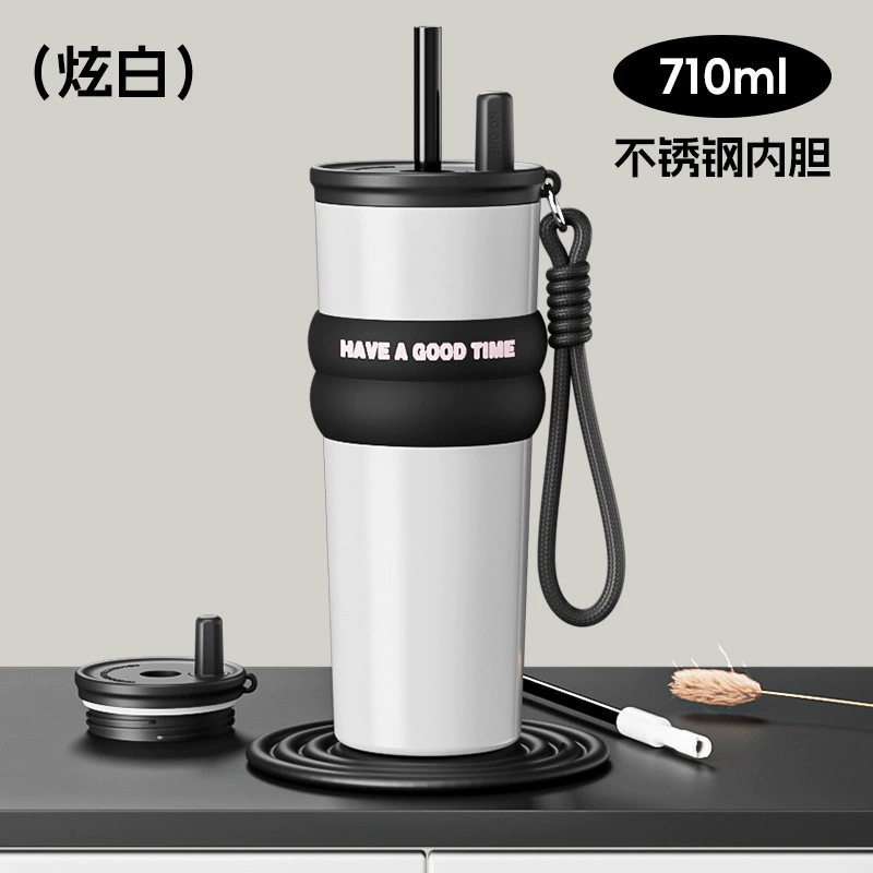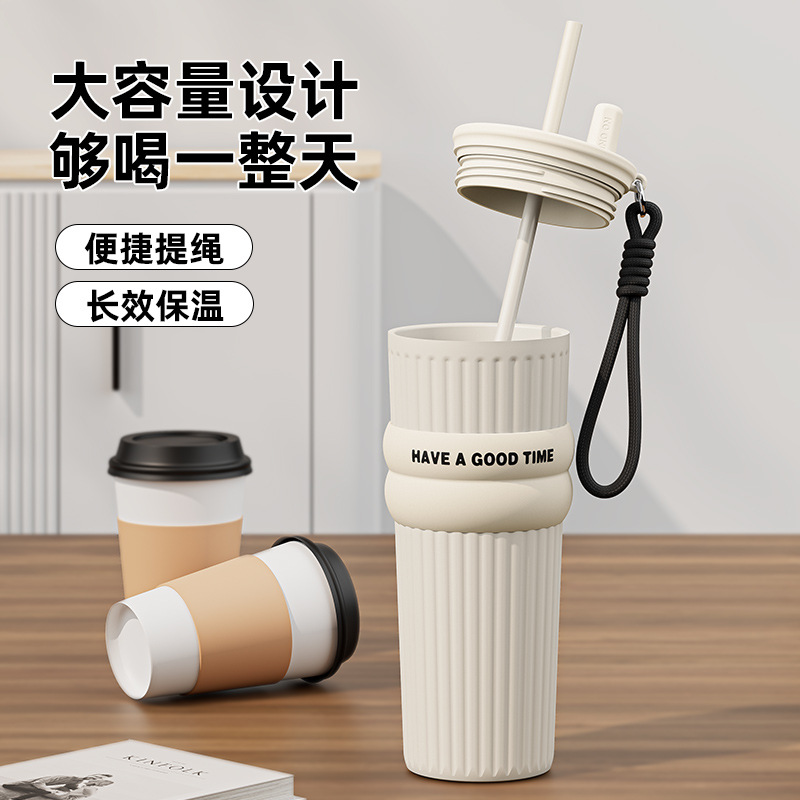 밀짚 보온병 컵 여성의 2024 새로운 대용량 컵 스테인레스 스틸 라이너 냉수 새로운 커피 컵스토어 가기