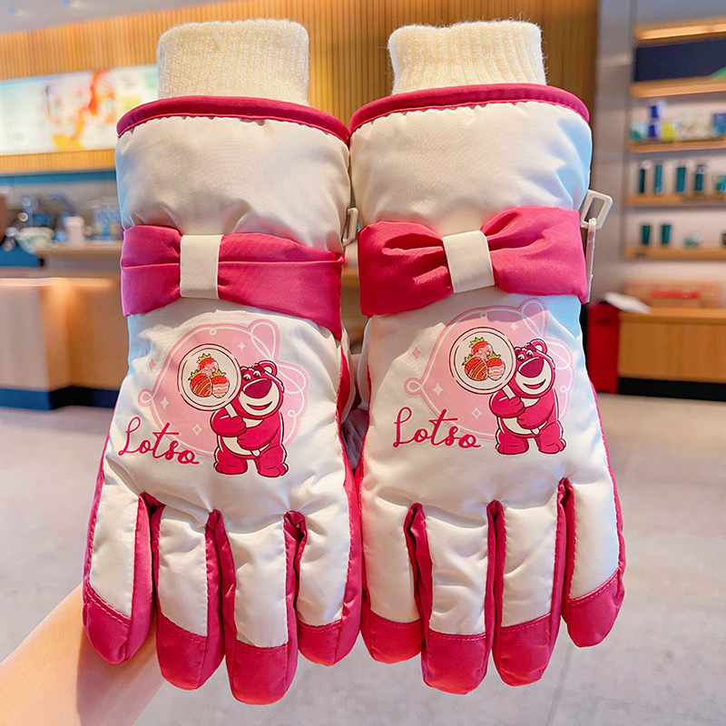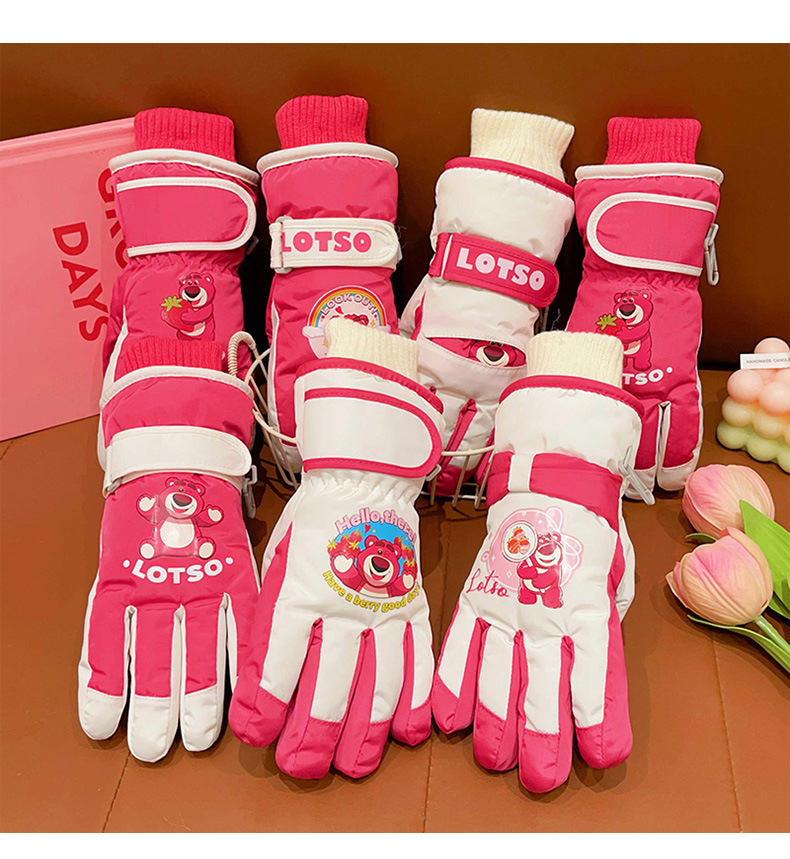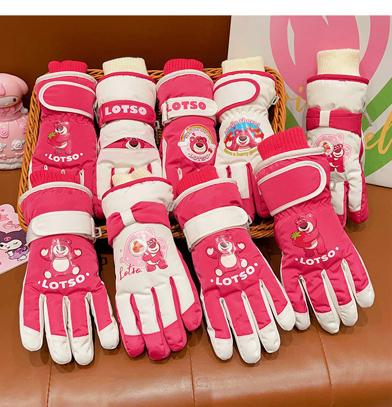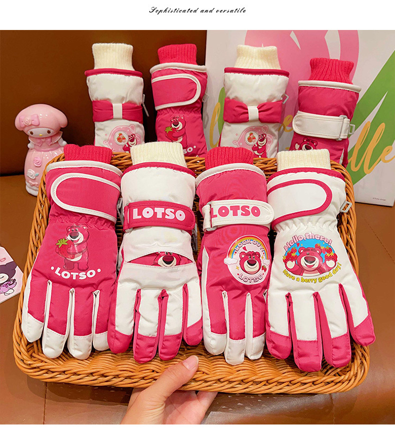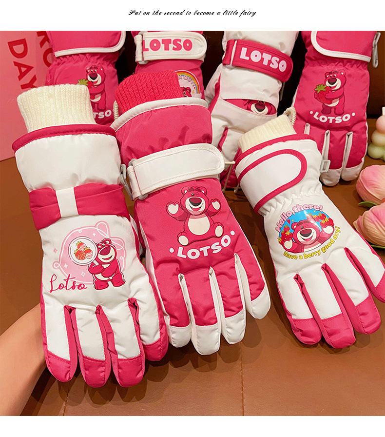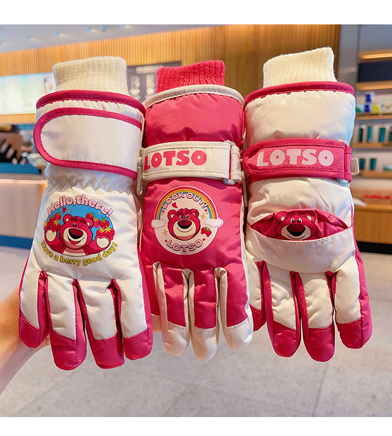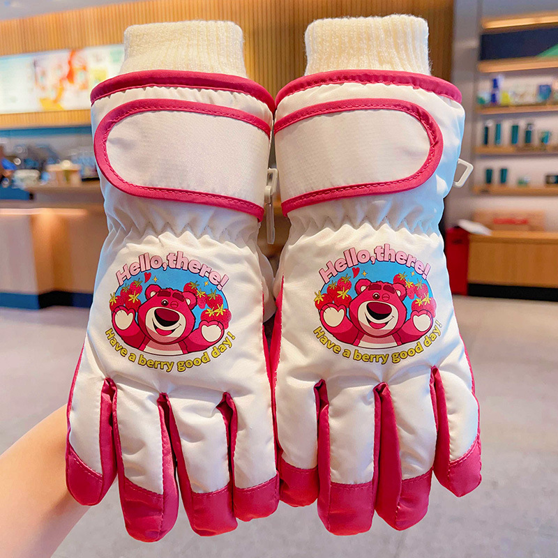 정품 딸기 곰 어린이 스키 장갑 소녀 따뜻한 기모 승마 소녀 방수 부동액 스노우 장갑