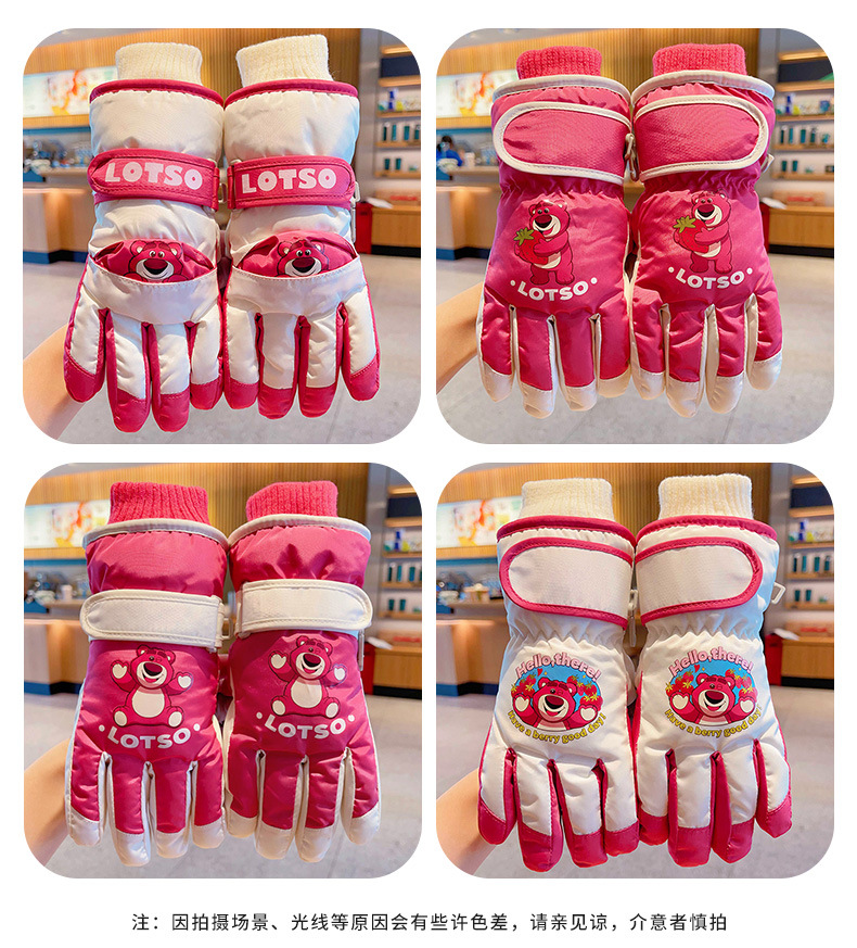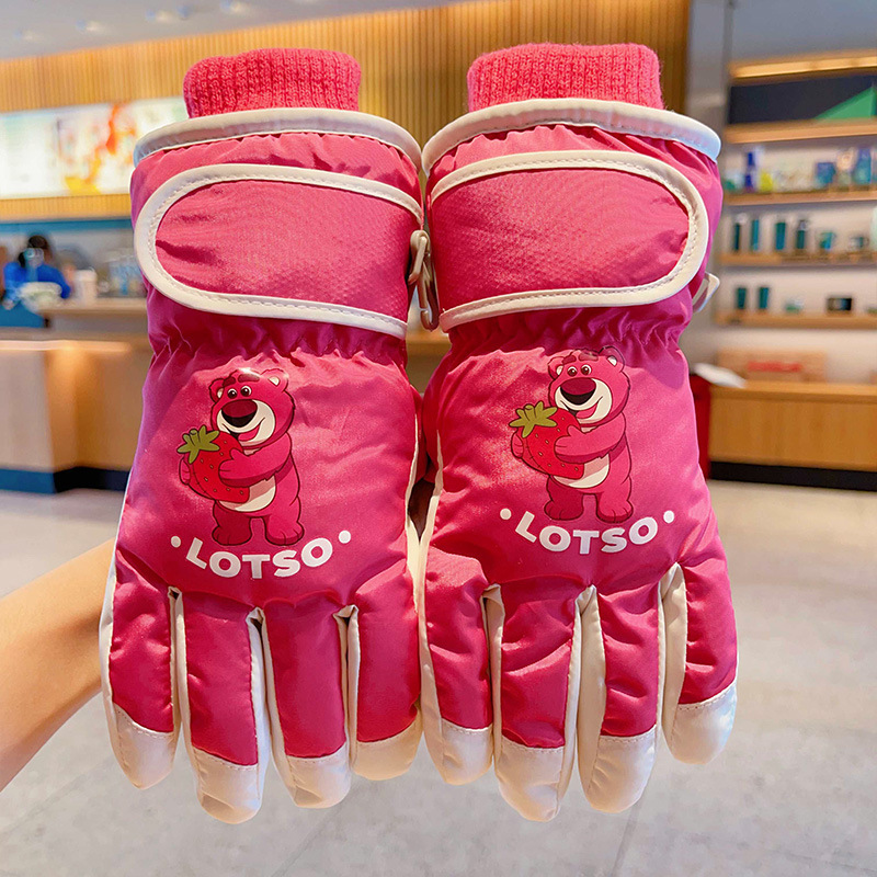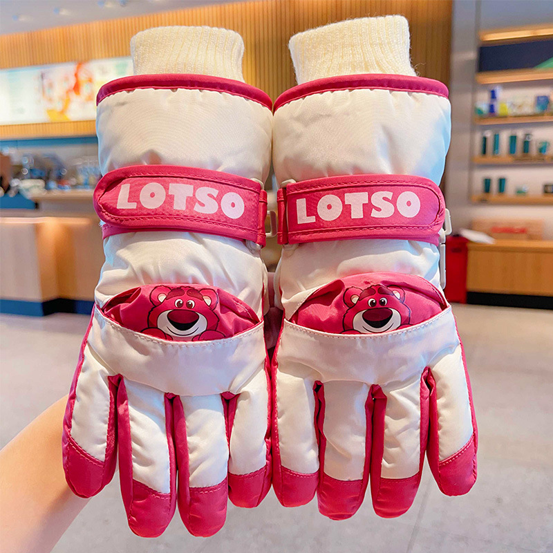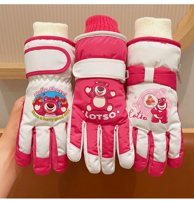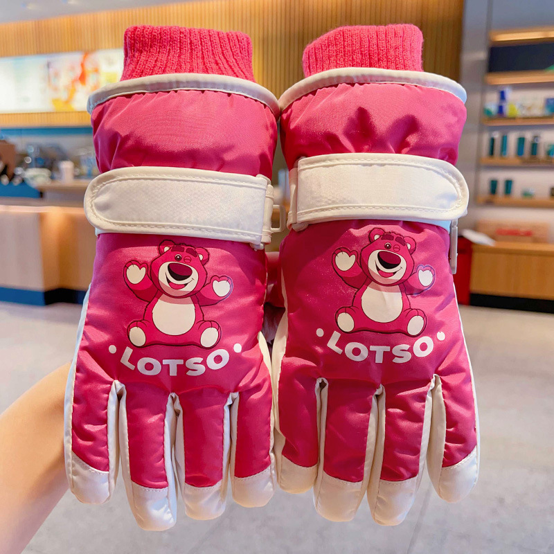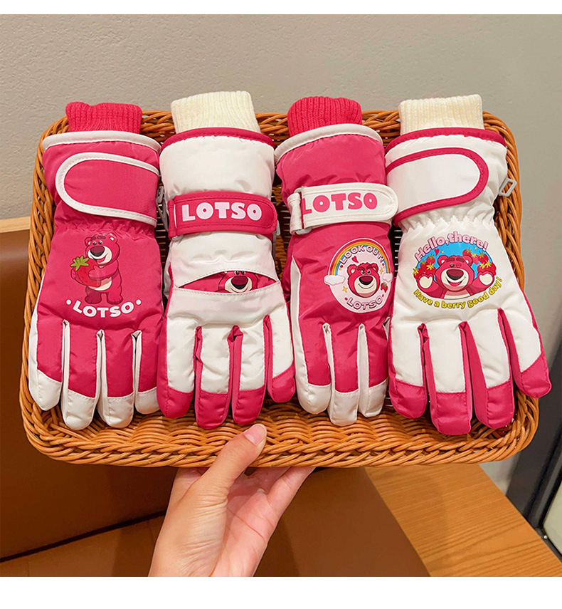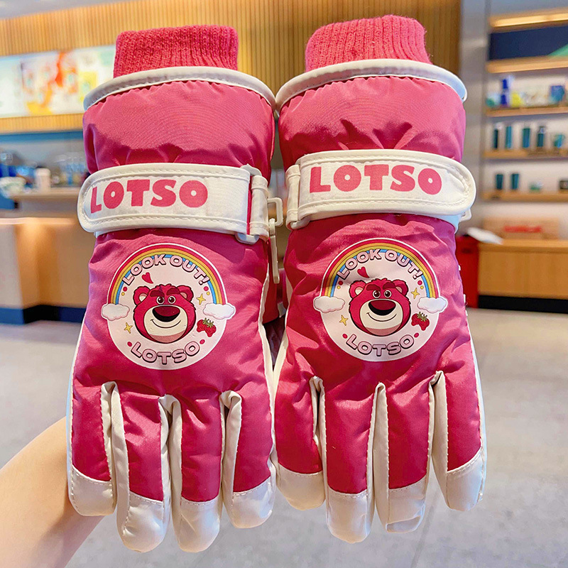 정품 딸기 곰 어린이 스키 장갑 소녀 따뜻한 기모 승마 소녀 방수 부동액 스노우 장갑