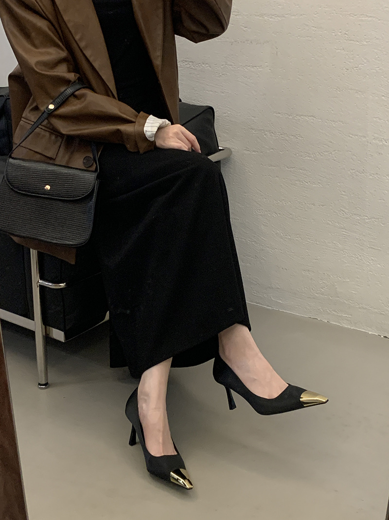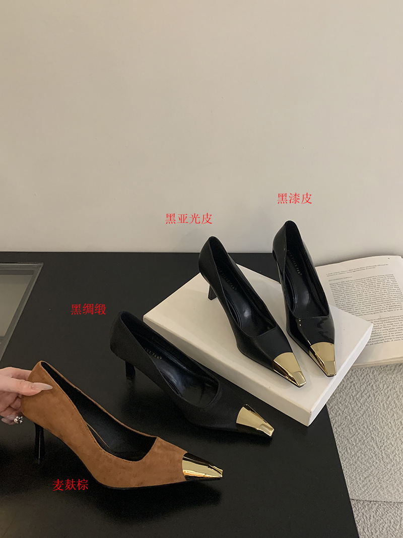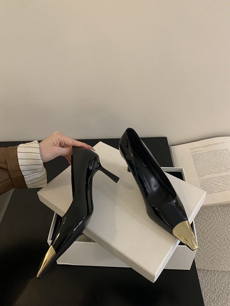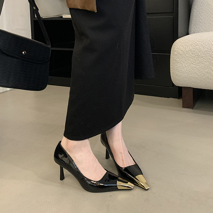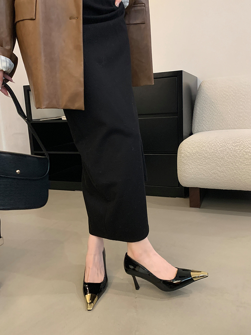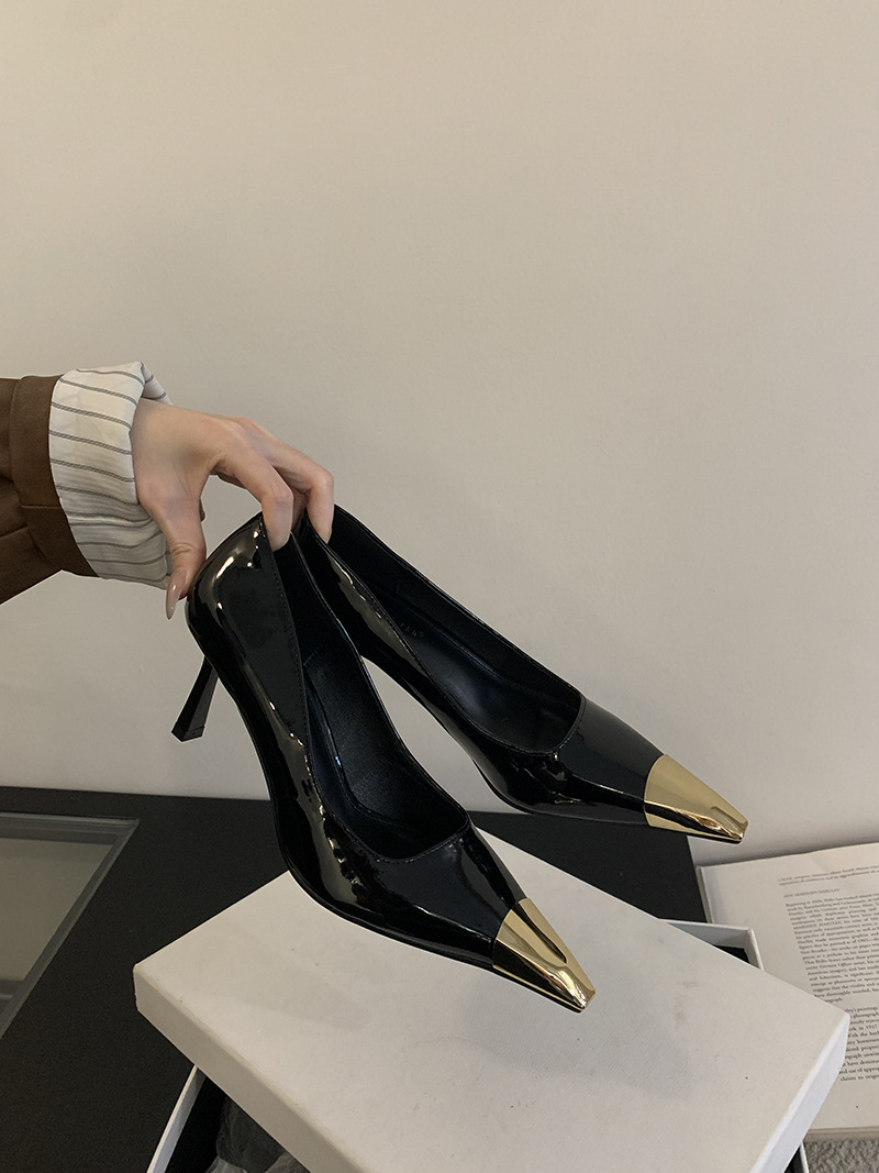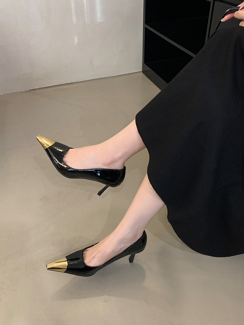 얕은 입 싱글 레이어 신발 스틸레토 힐 2025 봄 새로운 유럽과 미국 패션 금속 발가락 기질 로얄 자매 스타일 뾰족한 발가락 하이힐스토어 가기