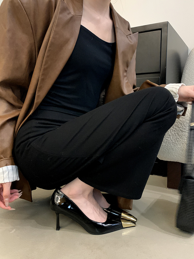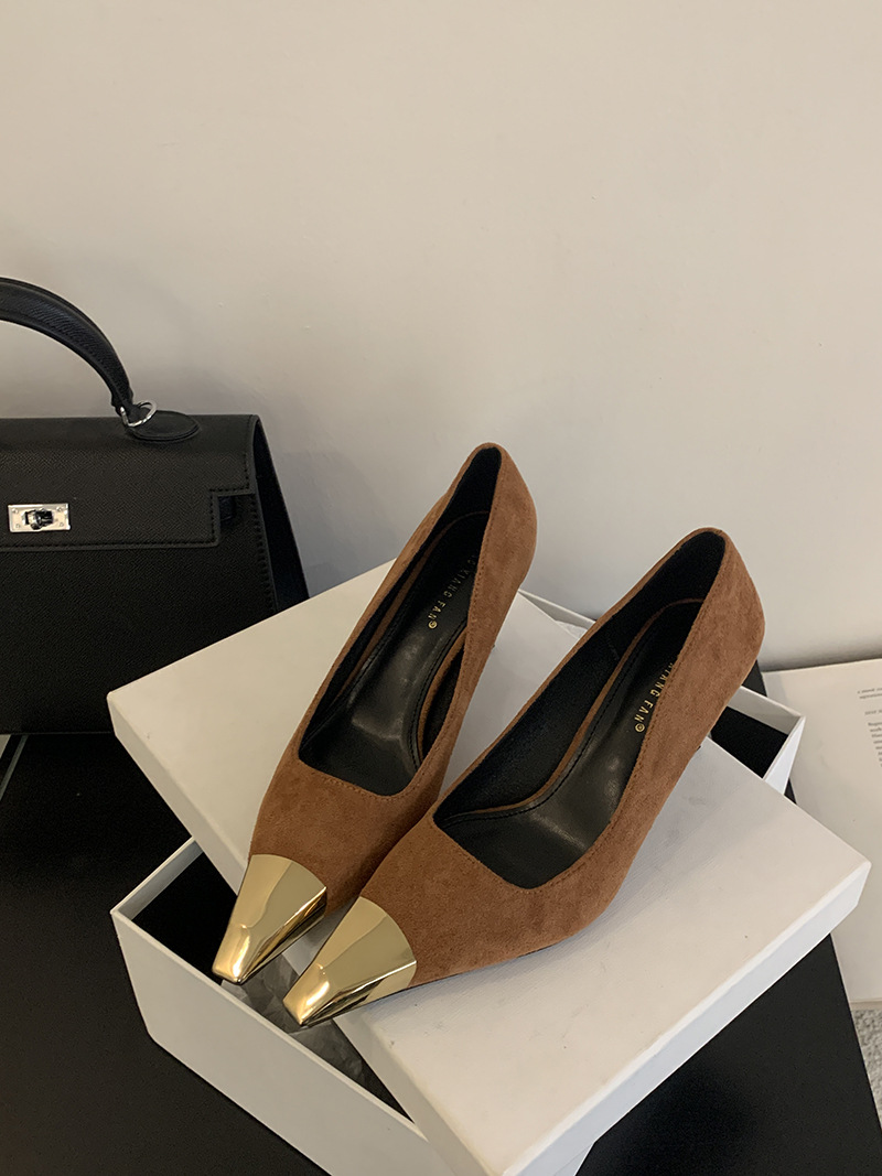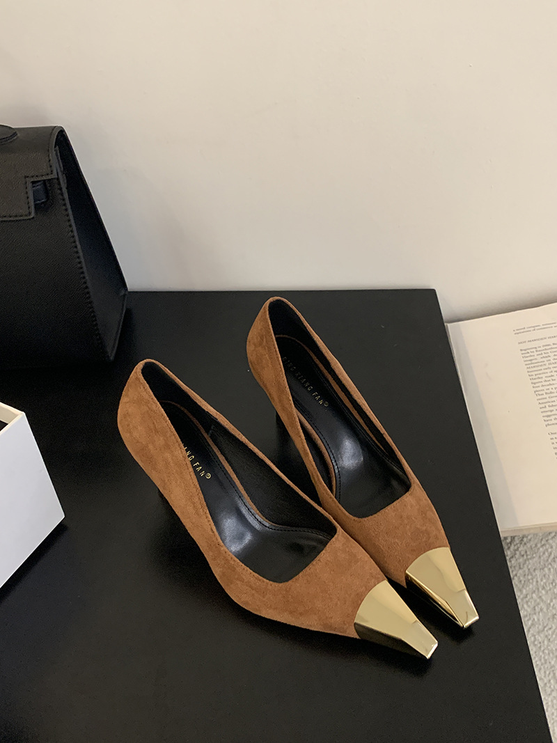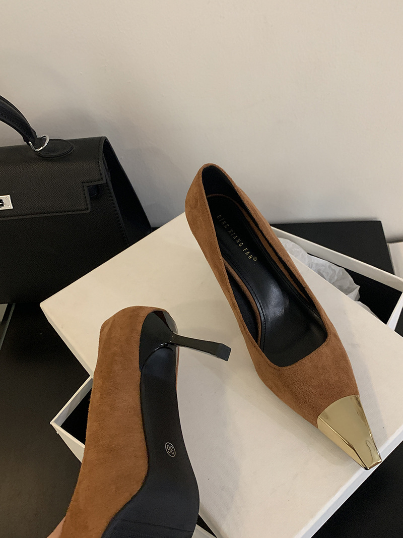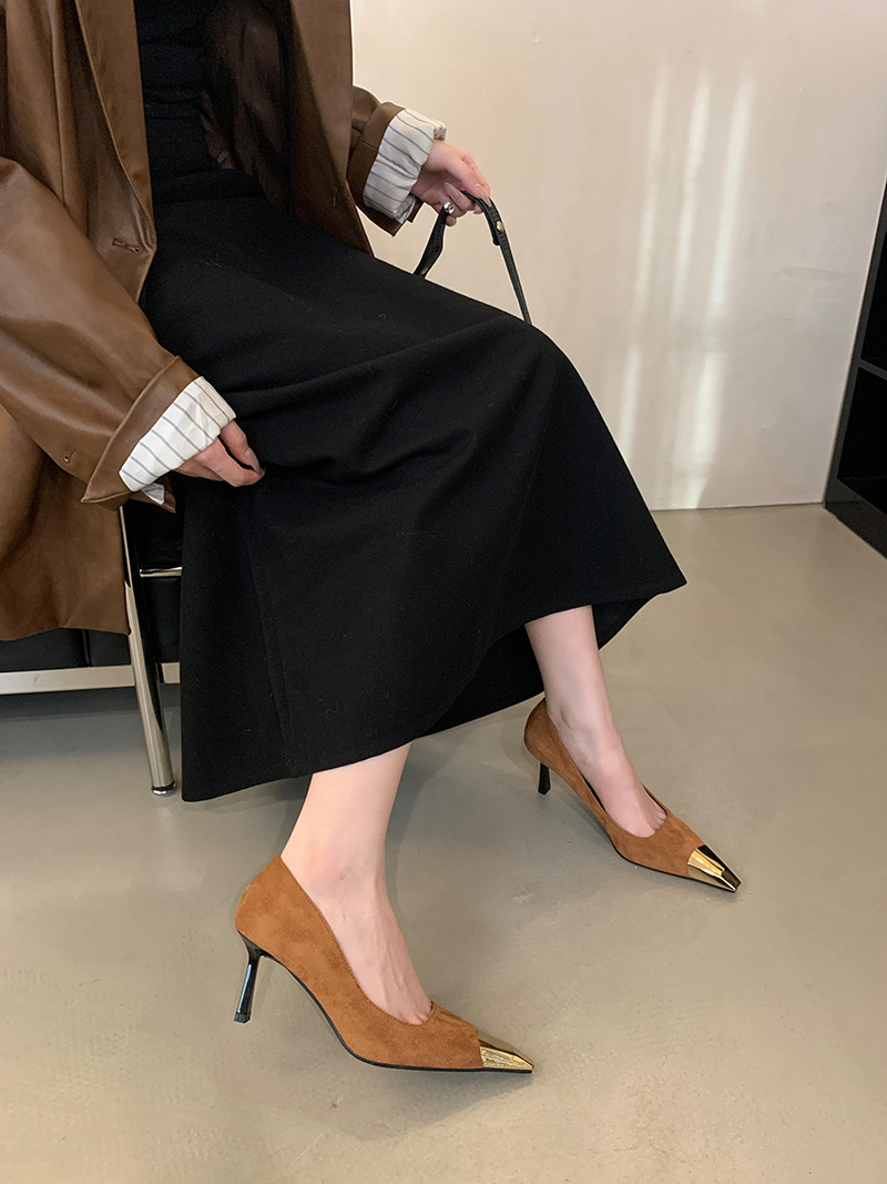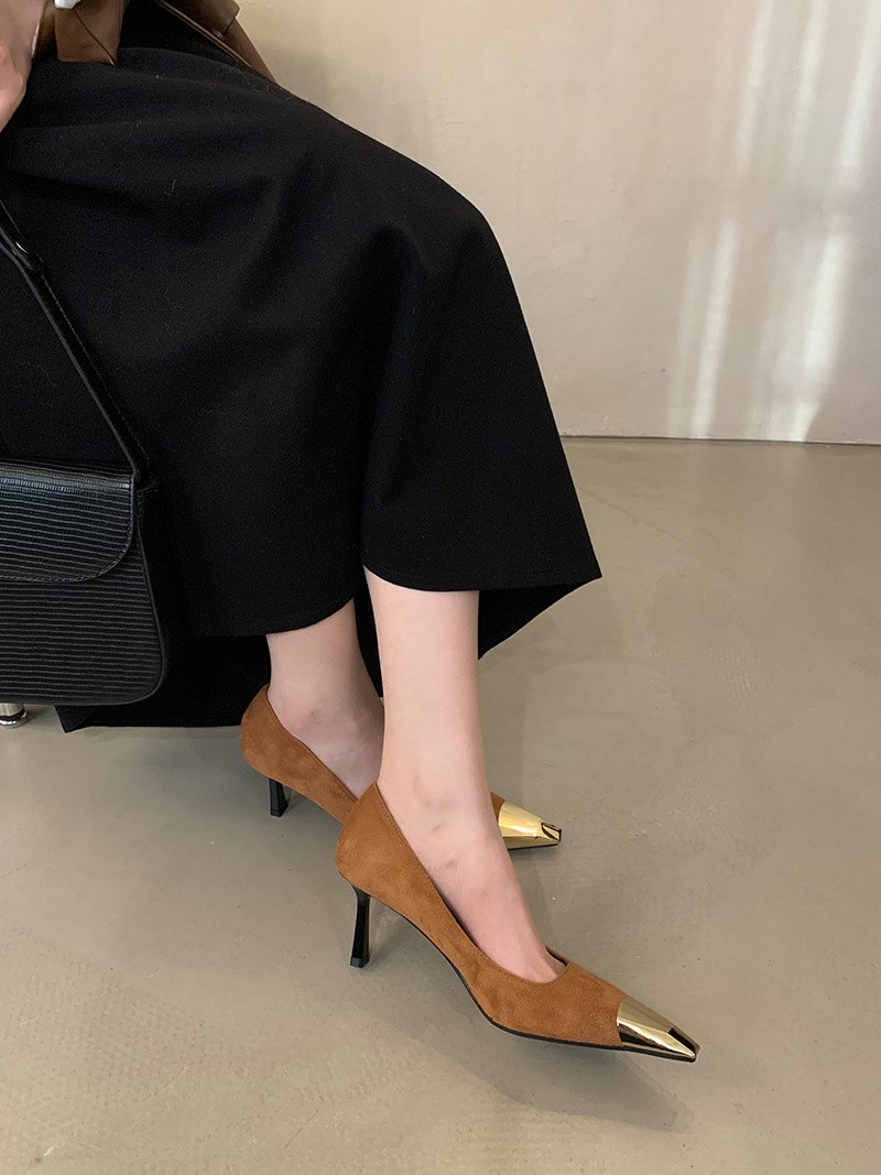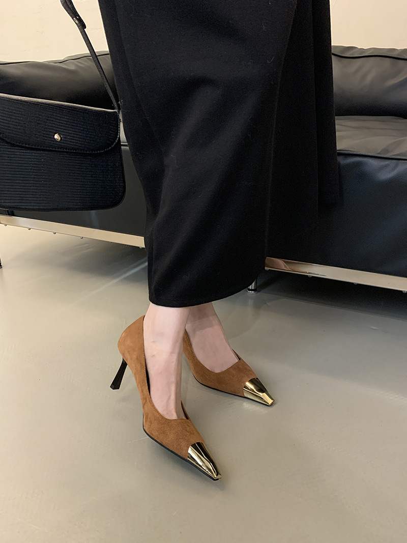 얕은 입 싱글 레이어 신발 스틸레토 힐 2025 봄 새로운 유럽과 미국 패션 금속 발가락 기질 로얄 자매 스타일 뾰족한 발가락 하이힐스토어 가기