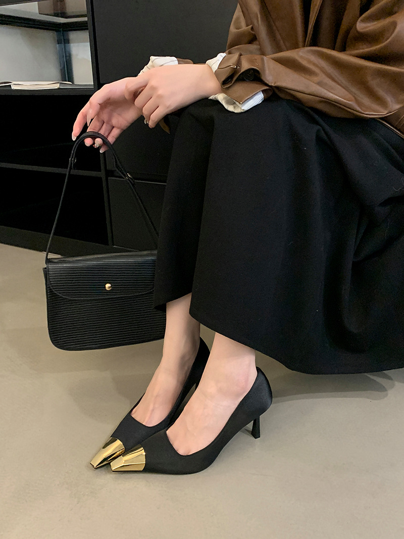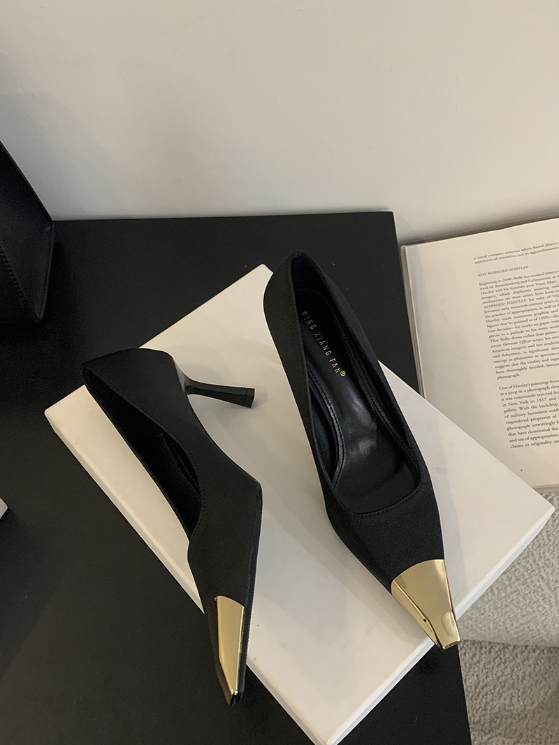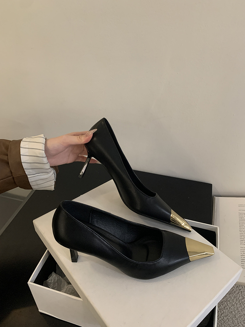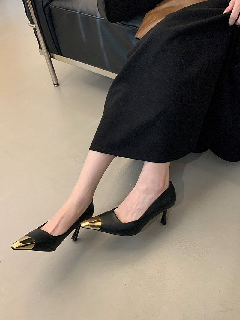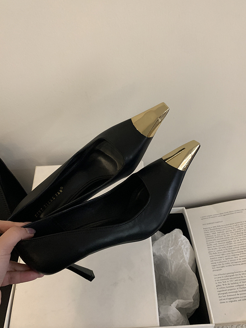 얕은 입 싱글 레이어 신발 스틸레토 힐 2025 봄 새로운 유럽과 미국 패션 금속 발가락 기질 로얄 자매 스타일 뾰족한 발가락 하이힐