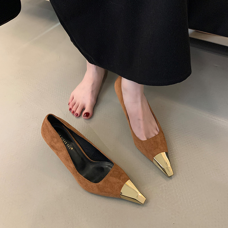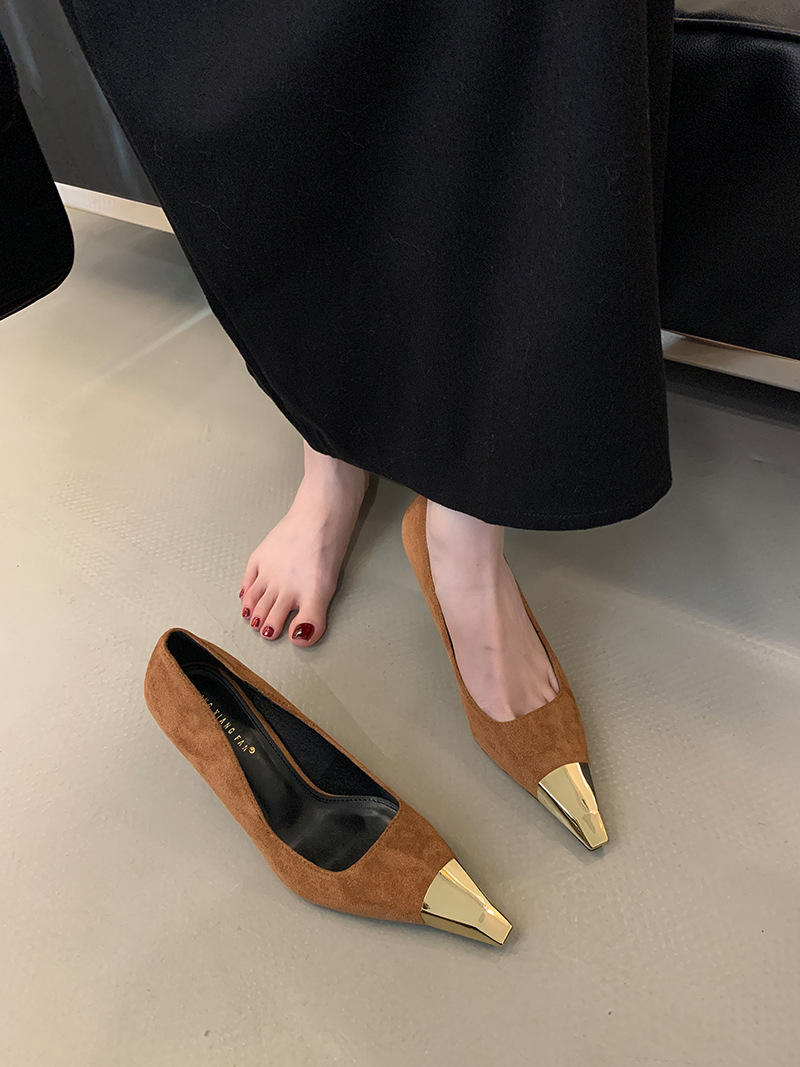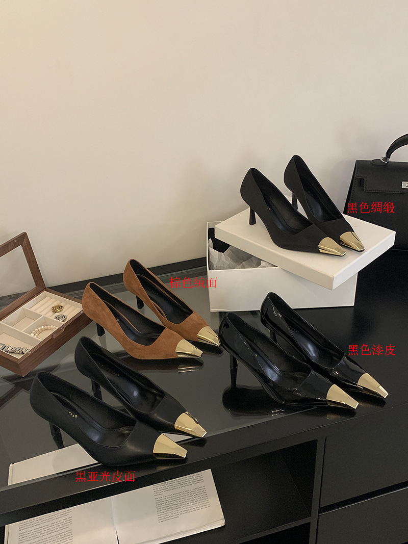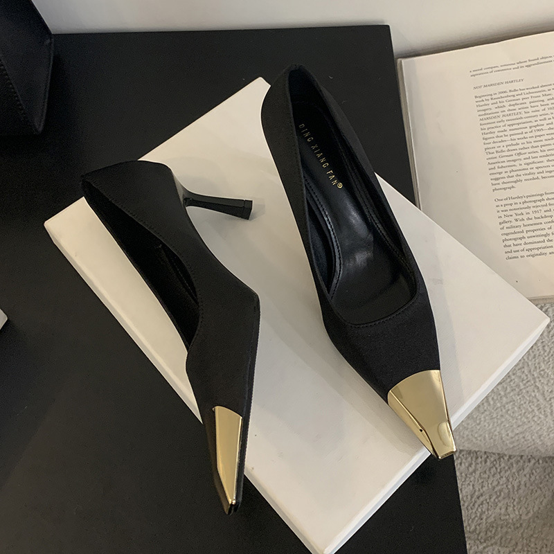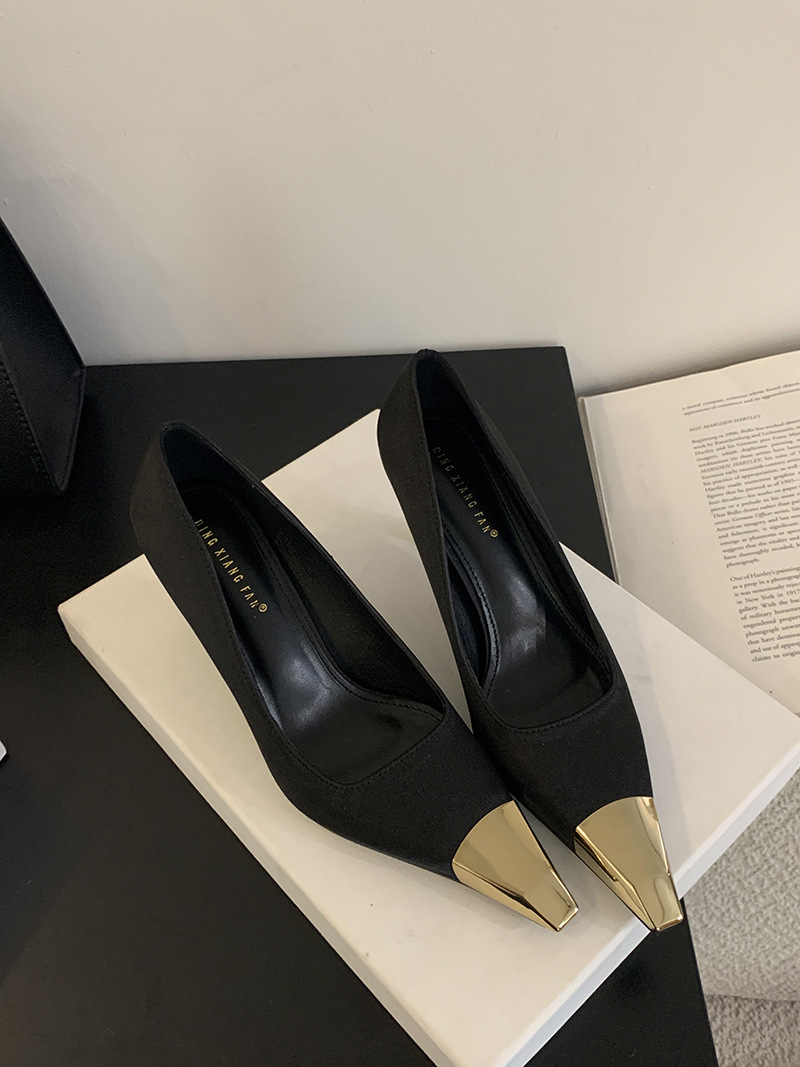 얕은 입 싱글 레이어 신발 스틸레토 힐 2025 봄 새로운 유럽과 미국 패션 금속 발가락 기질 로얄 자매 스타일 뾰족한 발가락 하이힐