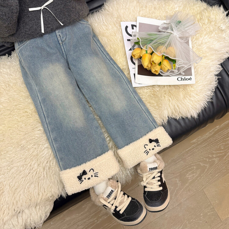 소녀 바지 기모 어린이 청바지 2024 새로운 소녀 스타일 두꺼운 바지 아기 캐주얼 바지