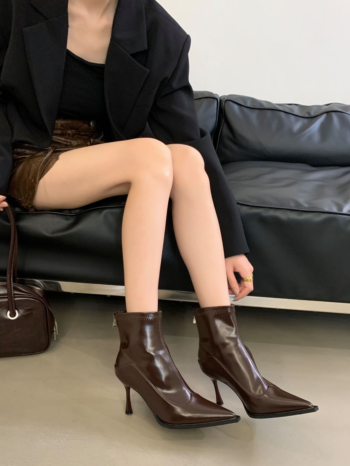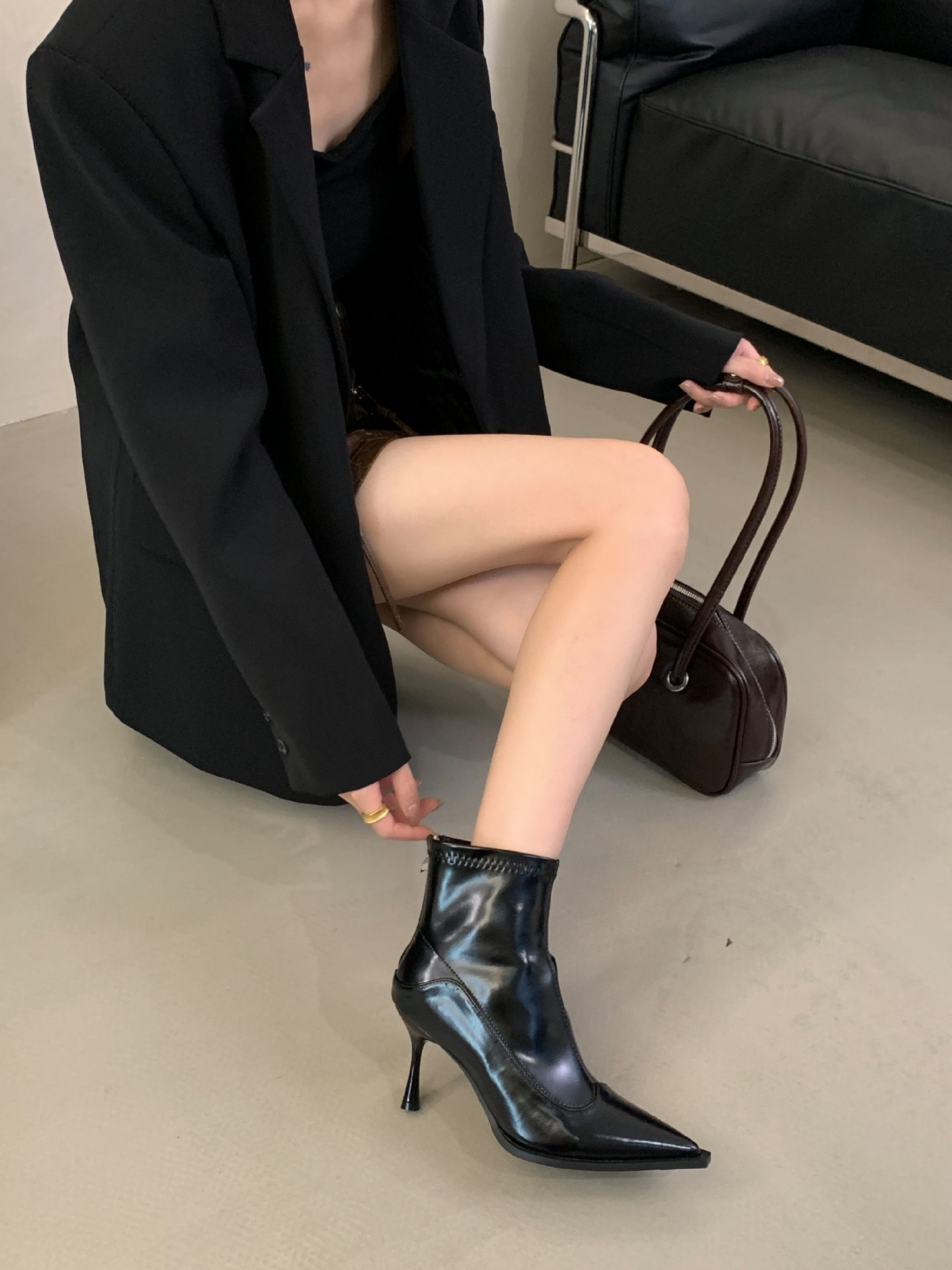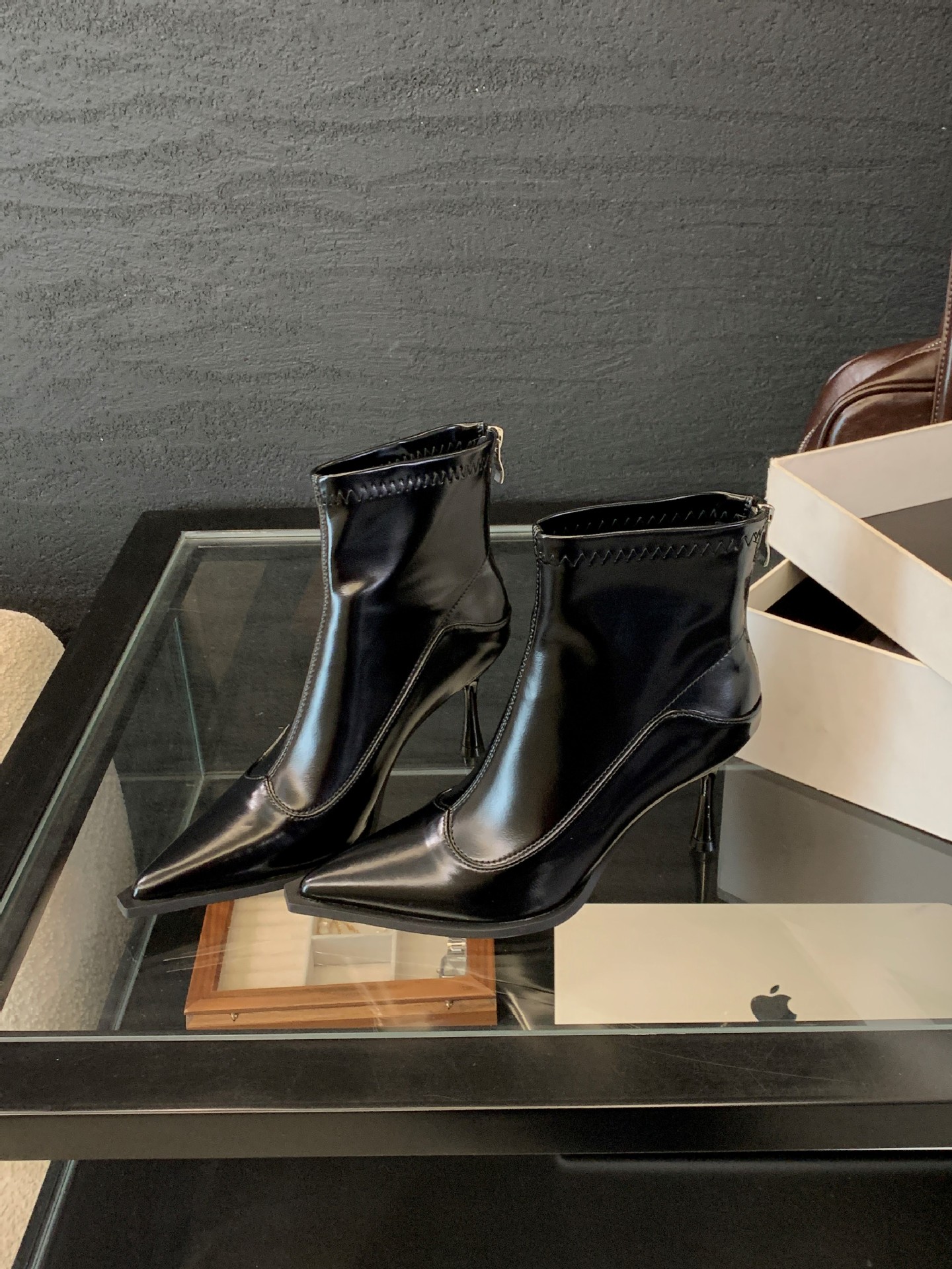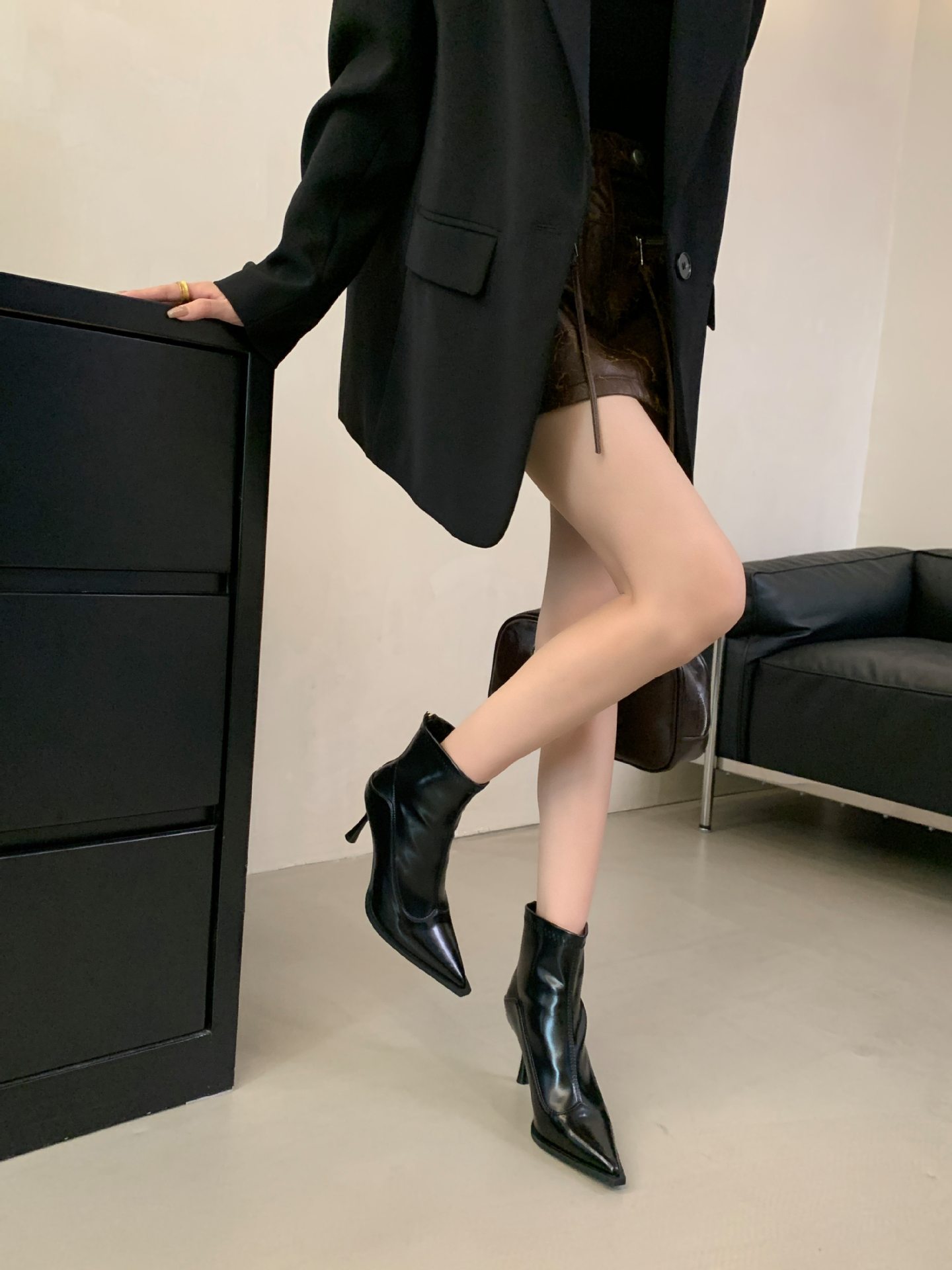 6918-1/9890-6 한국판 2025 봄 슬림 부츠 얇은 굽 하이힐 뾰족코 우아한 부드러운 가죽 뒷지퍼 숏부츠스토어 가기