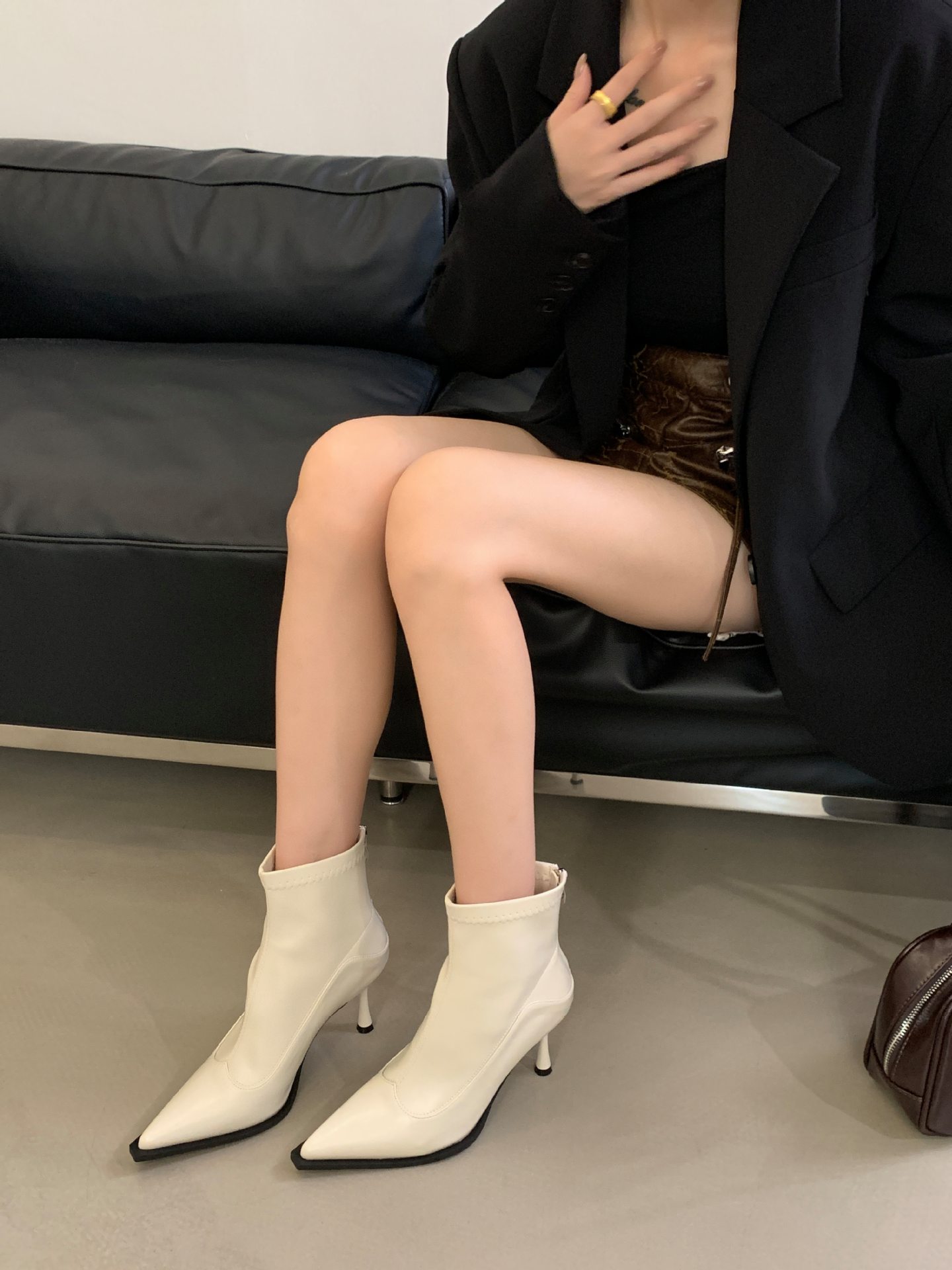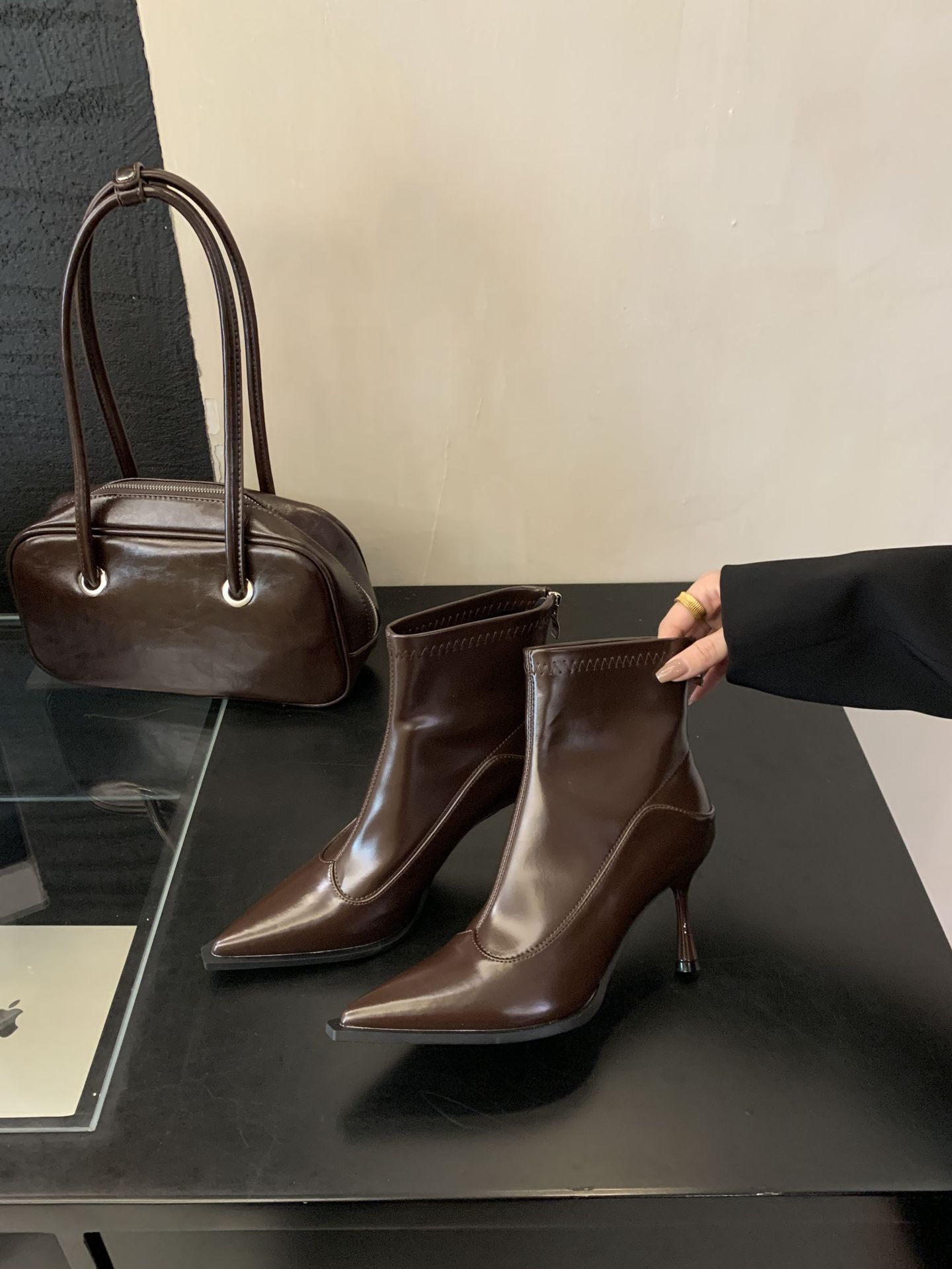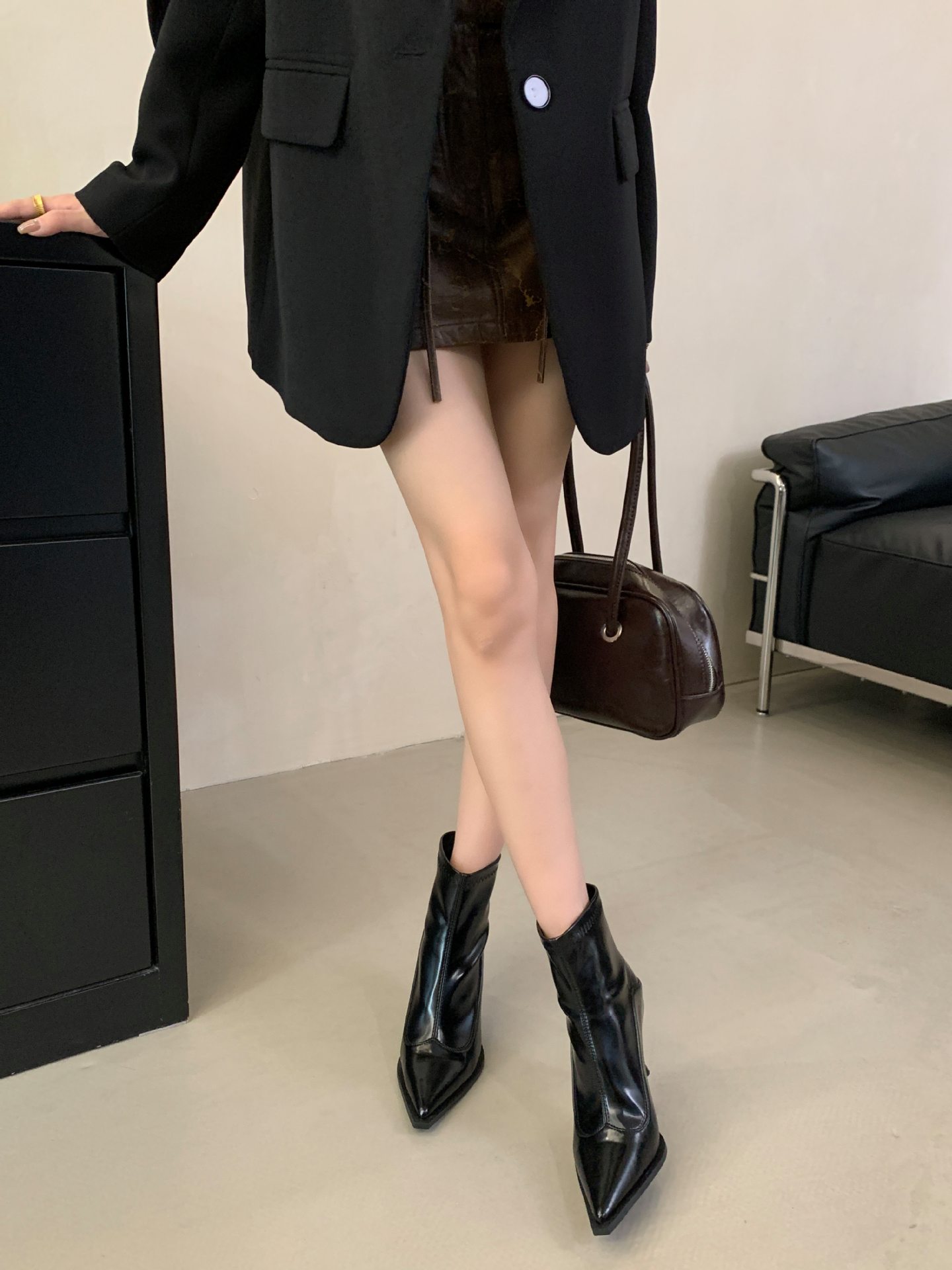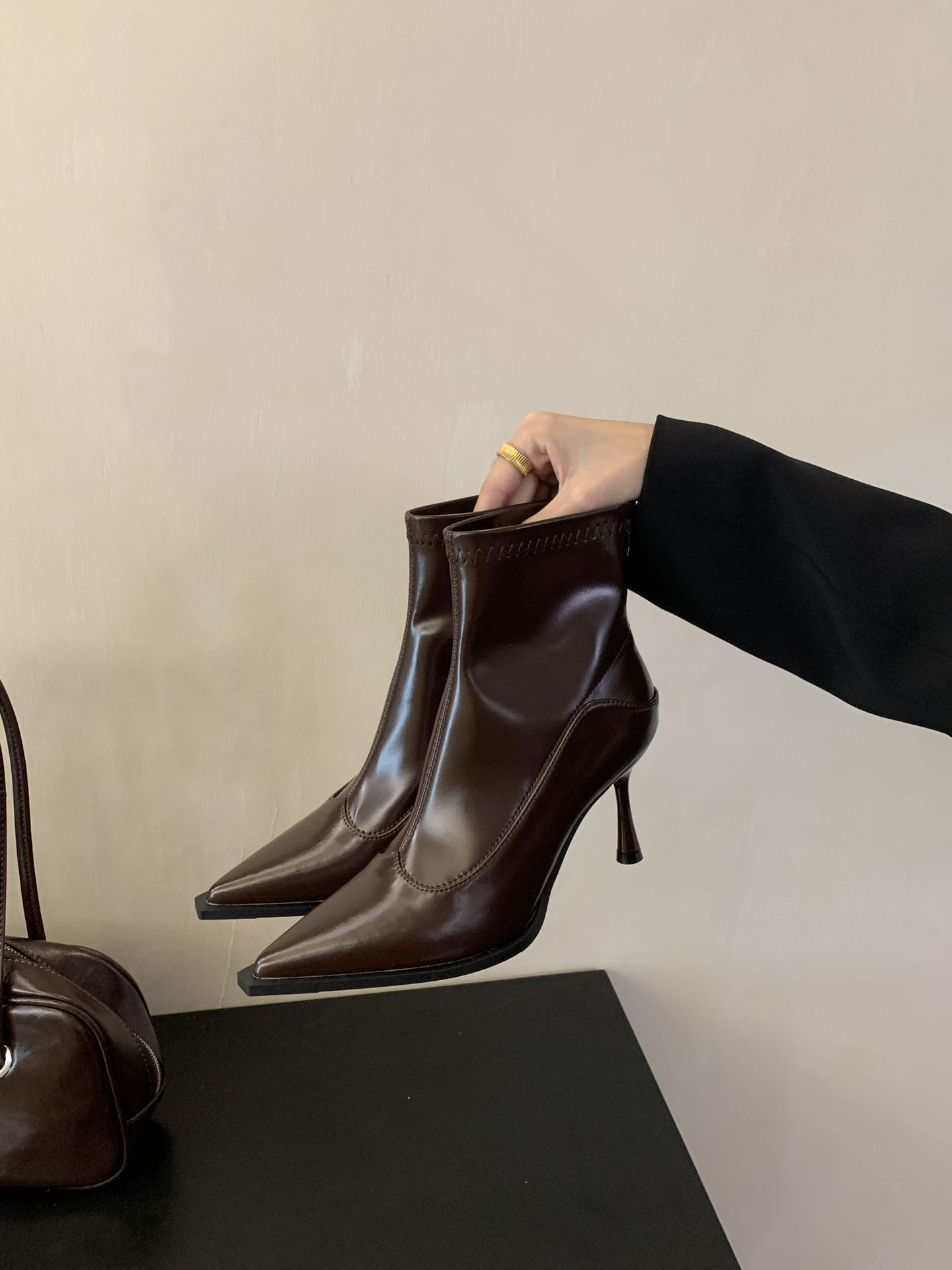 6918-1/9890-6 한국판 2025 봄 슬림 부츠 얇은 굽 하이힐 뾰족코 우아한 부드러운 가죽 뒷지퍼 숏부츠스토어 가기