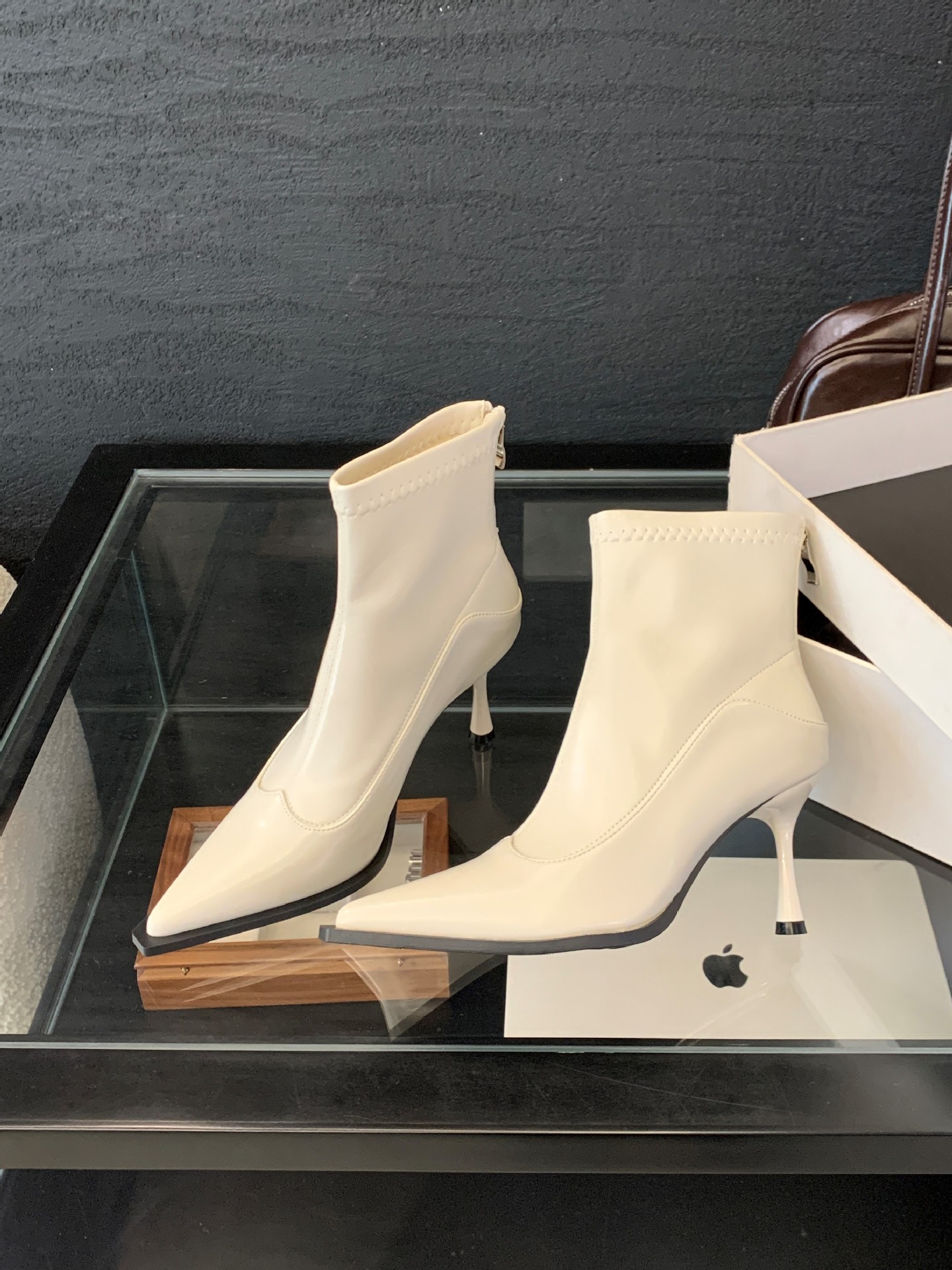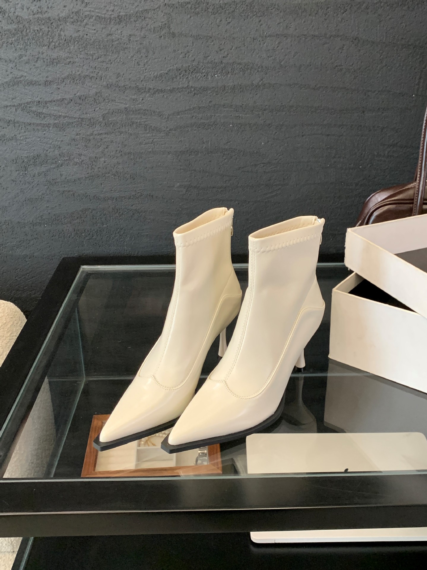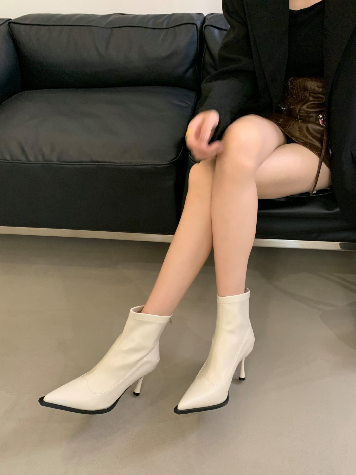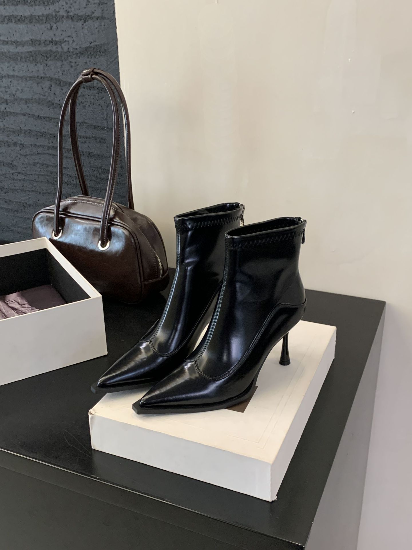 6918-1/9890-6 한국판 2025 봄 슬림 부츠 얇은 굽 하이힐 뾰족코 우아한 부드러운 가죽 뒷지퍼 숏부츠스토어 가기