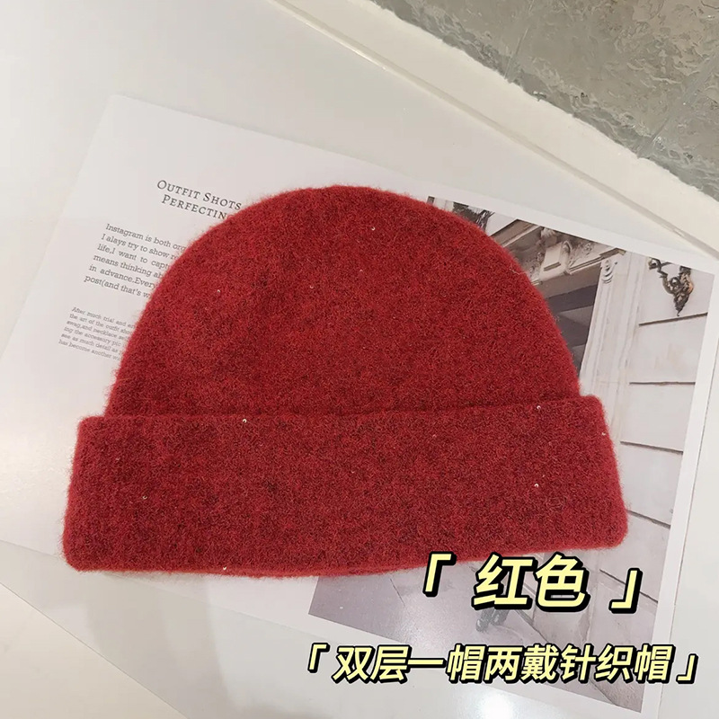 가을과 겨울 새 양모 블렌드 니트 모자 여성용 빅 헤드 힙 올 매치 더블 레이어 따뜻한 두꺼운 모자