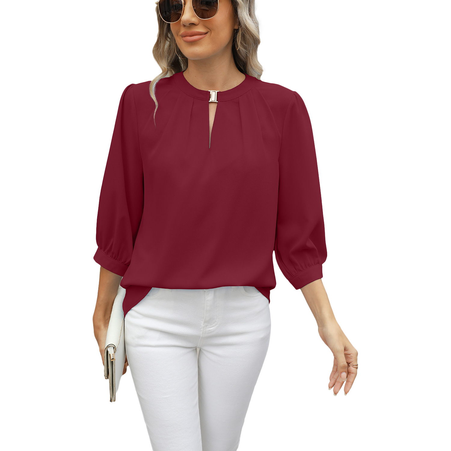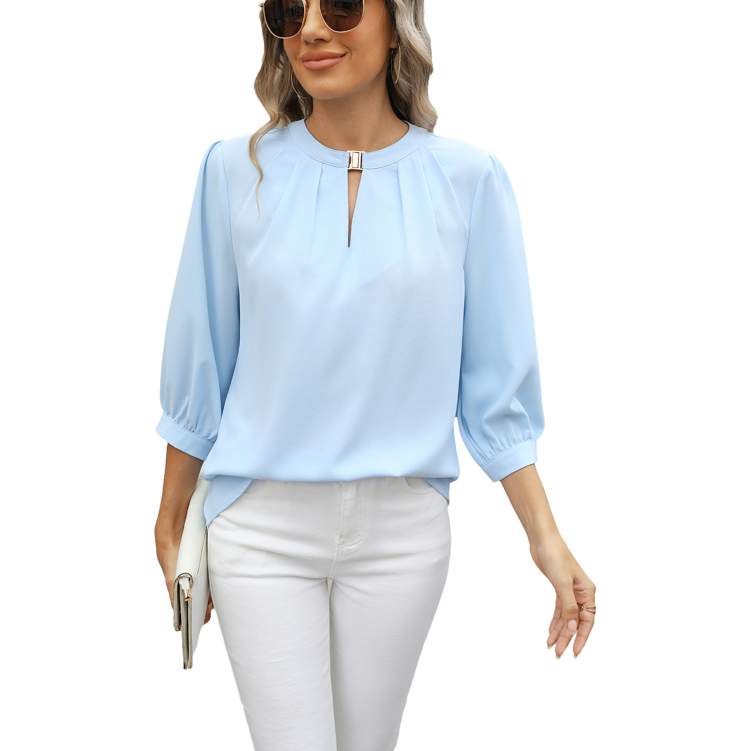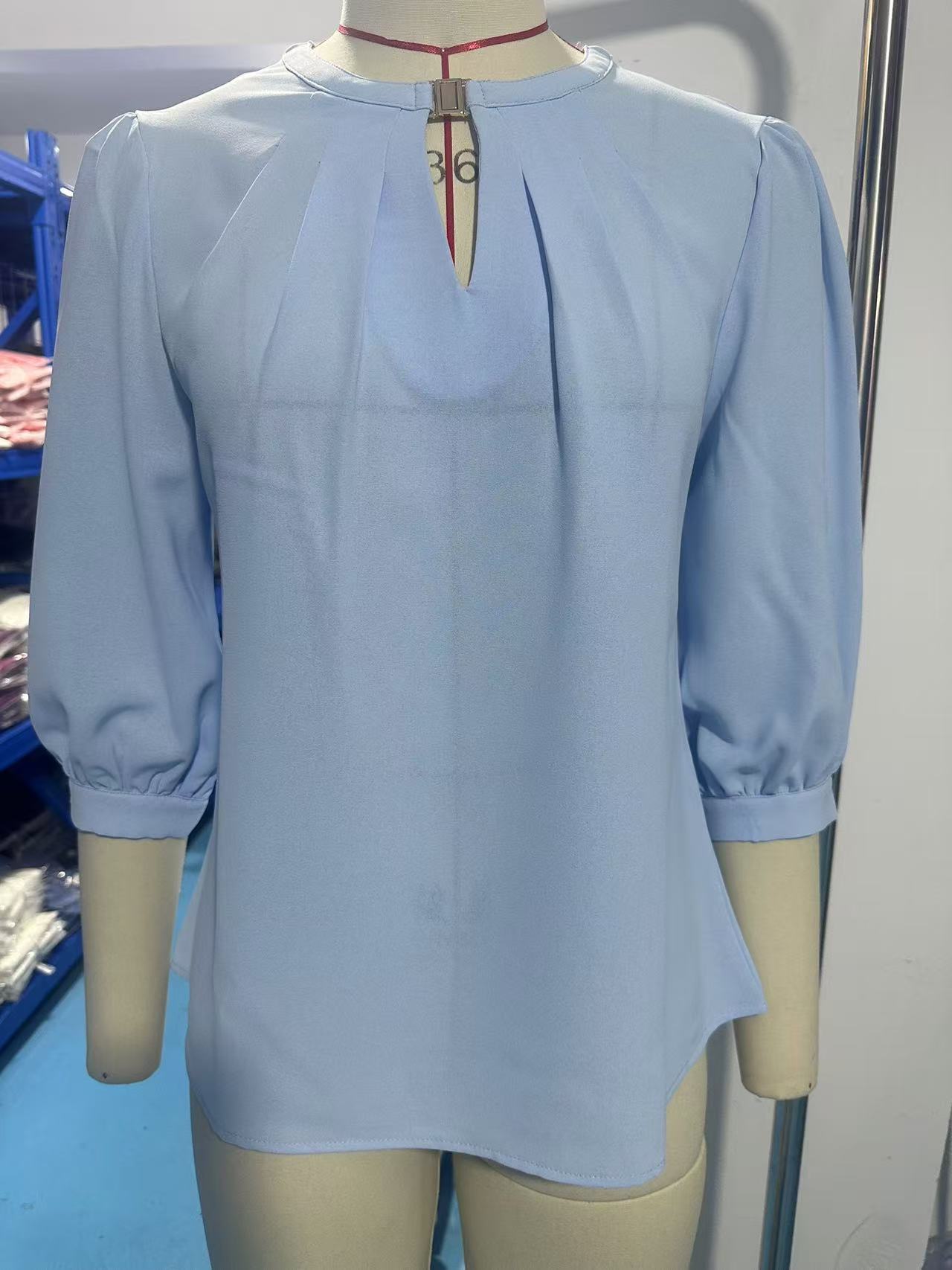 유럽과 미국의 국경 간 여성 2025 아마존 봄과 여름 새로운 키홀 V 넥 7 포인트 슬리브 느슨한 쉬폰 셔츠 탑