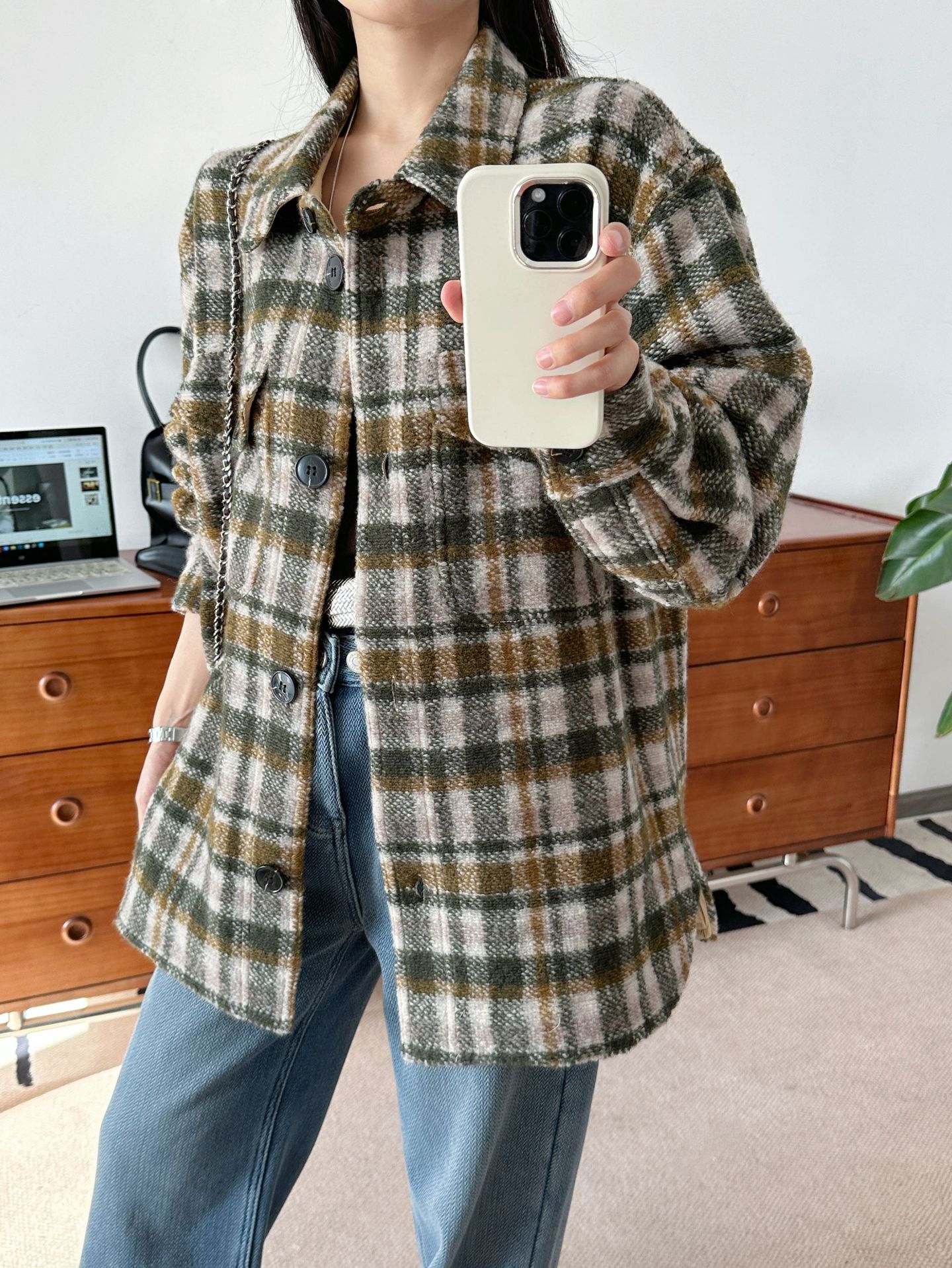 法式小众2024秋冬潮线经典款翻领格纹短款毛呢大衣中性外套