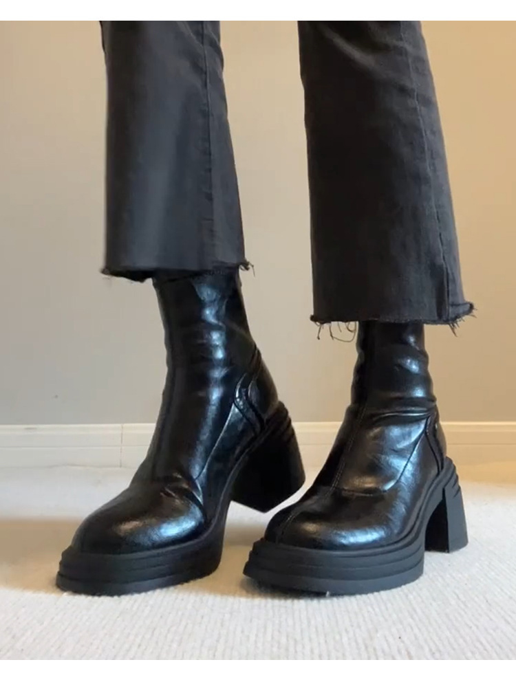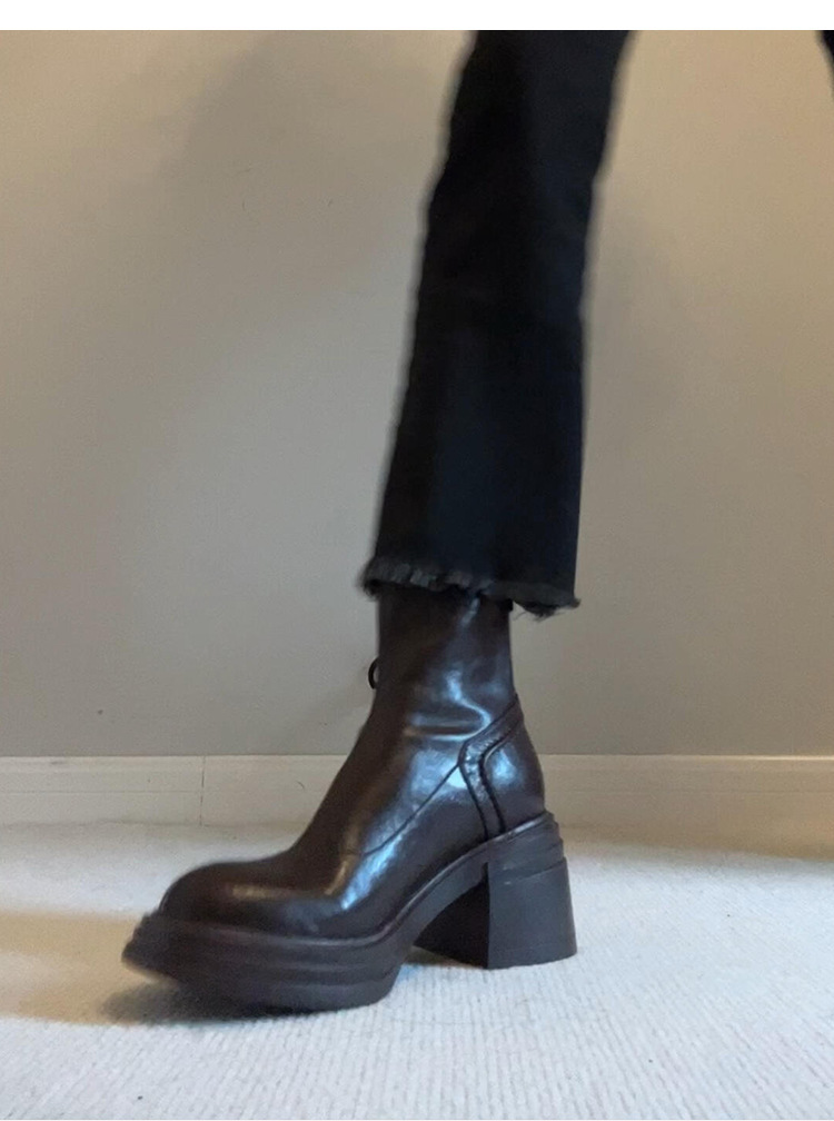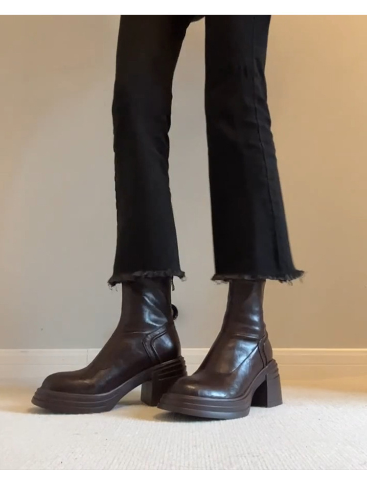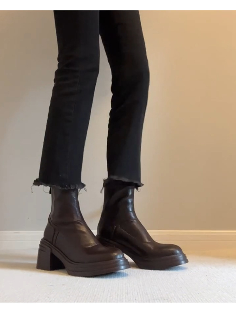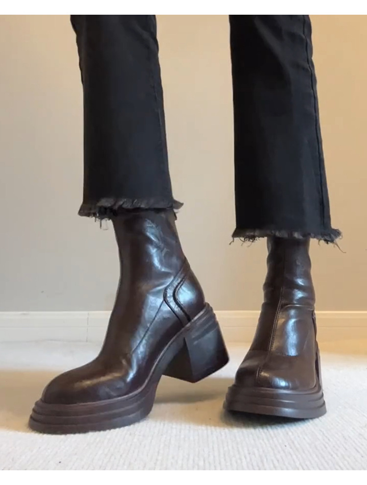 Cowhide 버전 ~ 다크 브라운 레트로 정품 가죽 두꺼운 바닥 상승 마틴 부츠 여성용 간단한 리어 지퍼 두꺼운 힐 레트로 얇은 부츠스토어 가기
