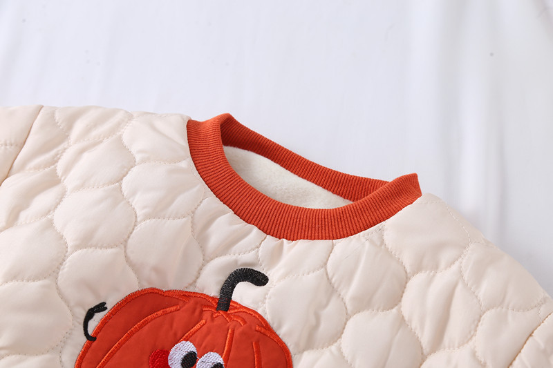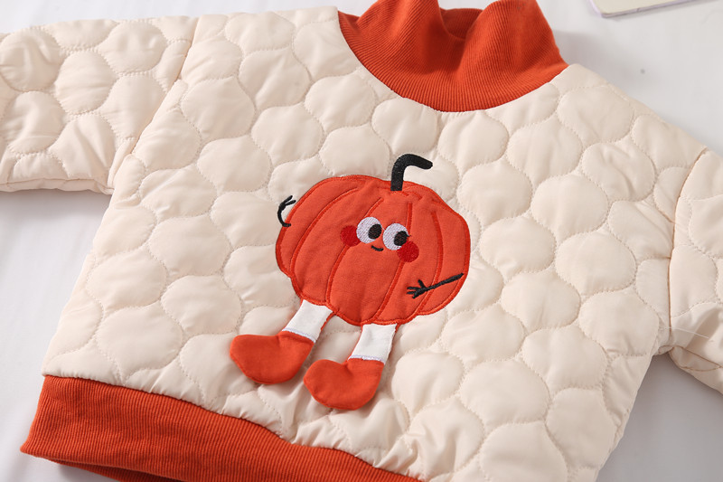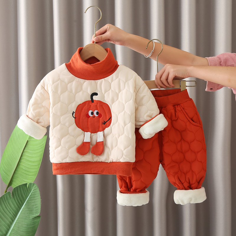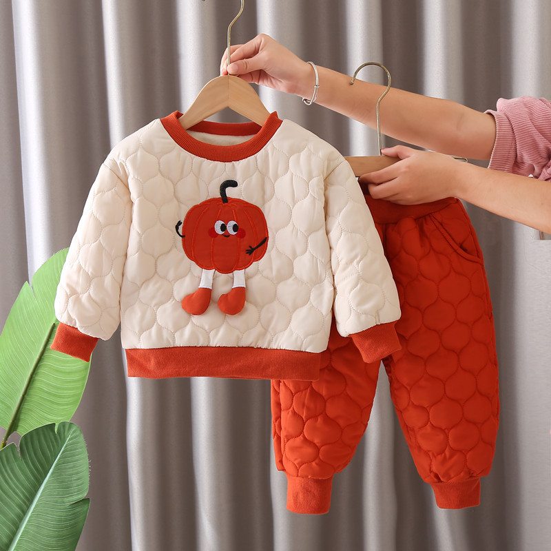 가을과 겨울 2024 새로운 한국 스타일 어린이 착용 호박 만화 두 조각 가을과 겨울 긴팔 남성 및 여성 세트스토어 가기