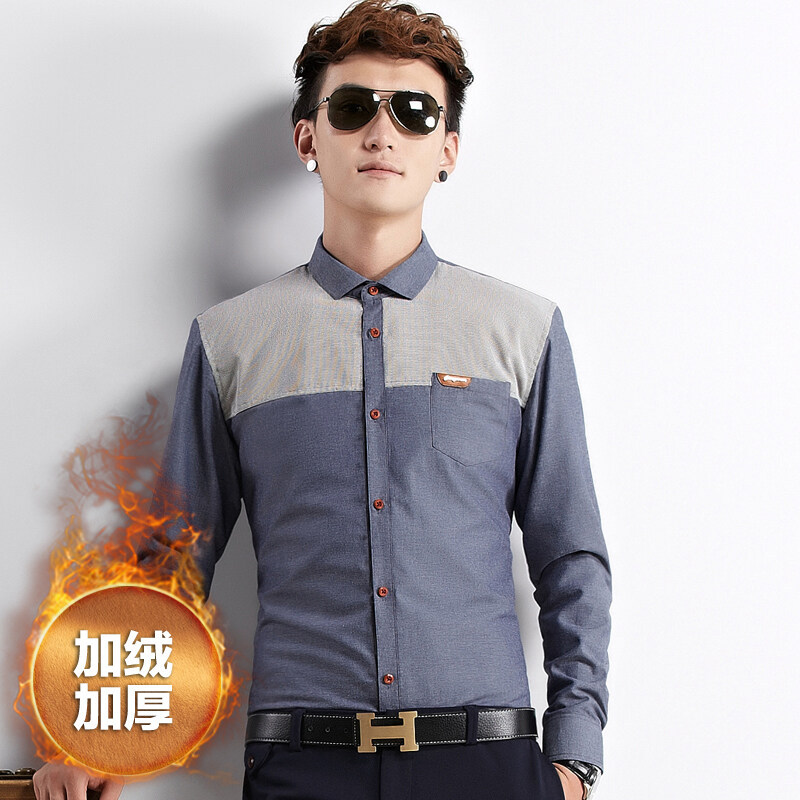 가을과 겨울 기모 긴팔 셔츠 남성용 셔츠 모조 데님 슬림핏 한국 유행 잘 생긴 비즈니스 캐주얼 두꺼운 탑 옷