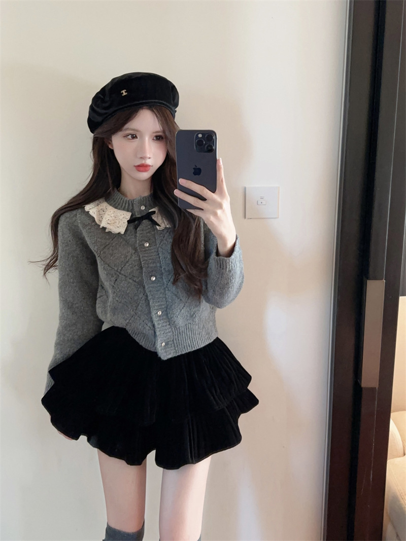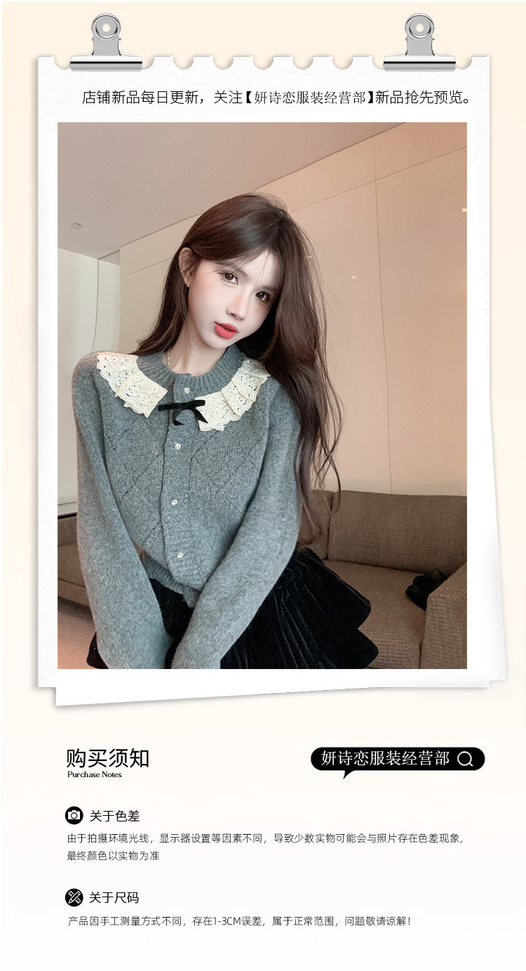 샤넬 스타일 활 니트웨어 여성용 가을과 겨울 프랑스 인형 칼라 레이스 탑 하프 터틀넥 스웨터 카디건 재킷스토어 가기