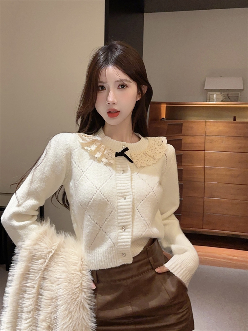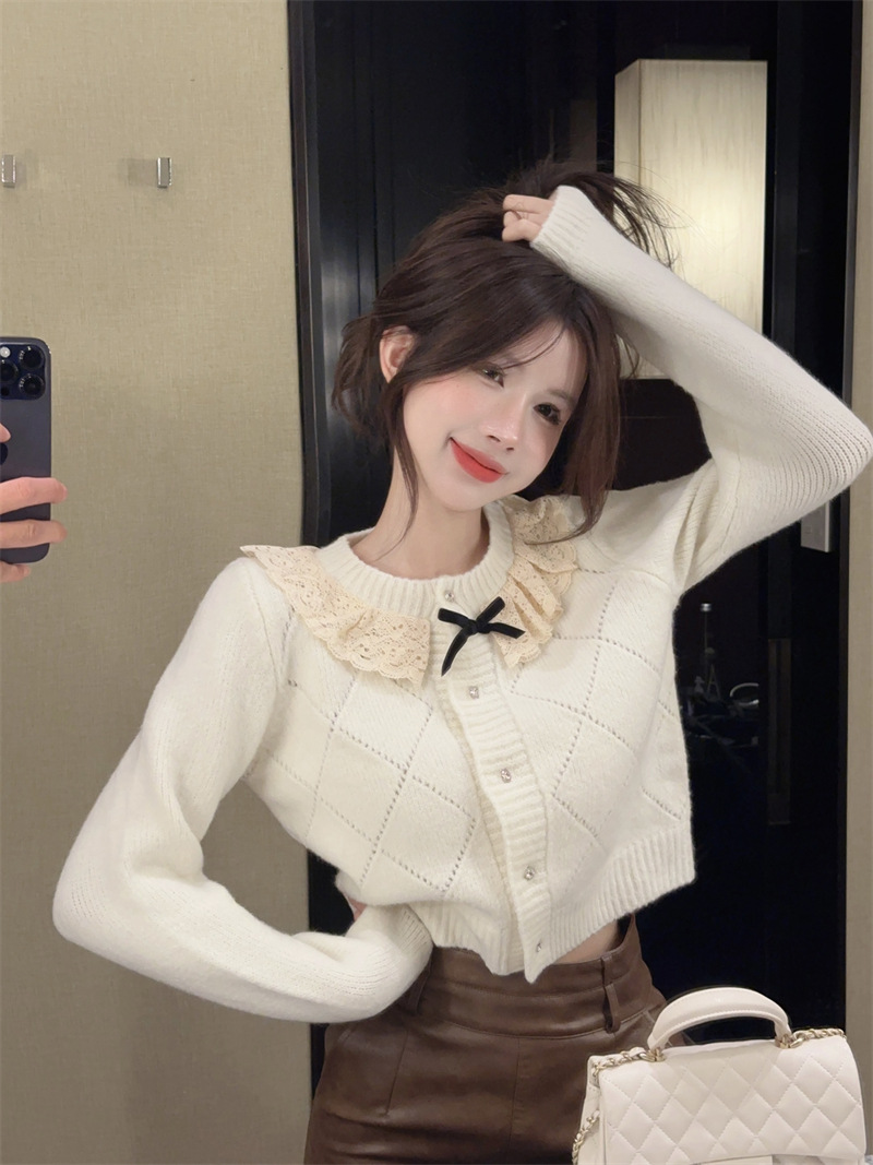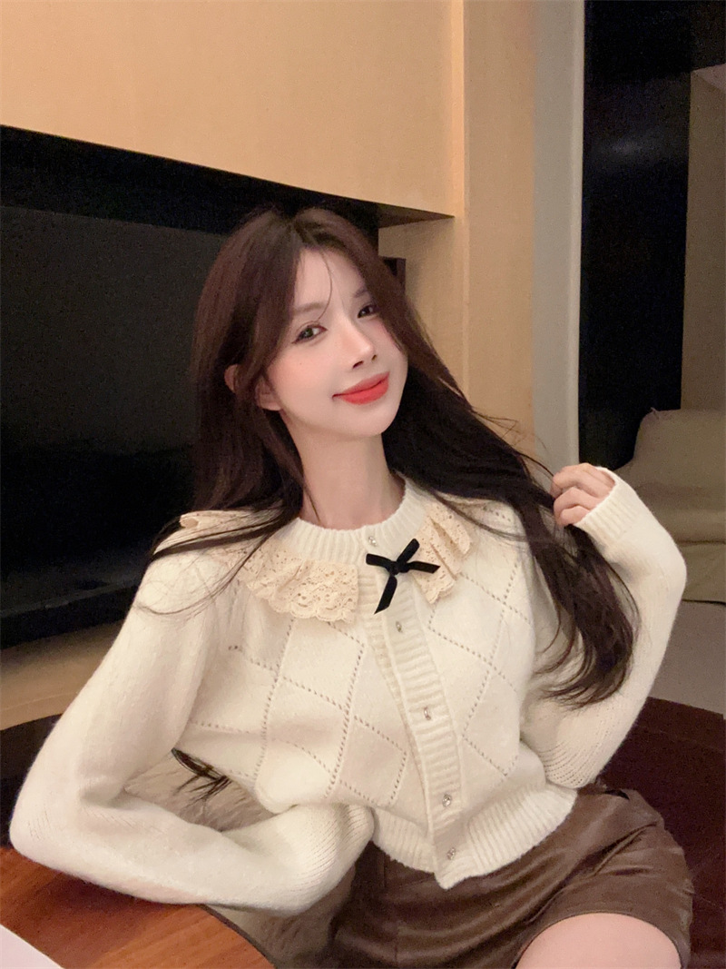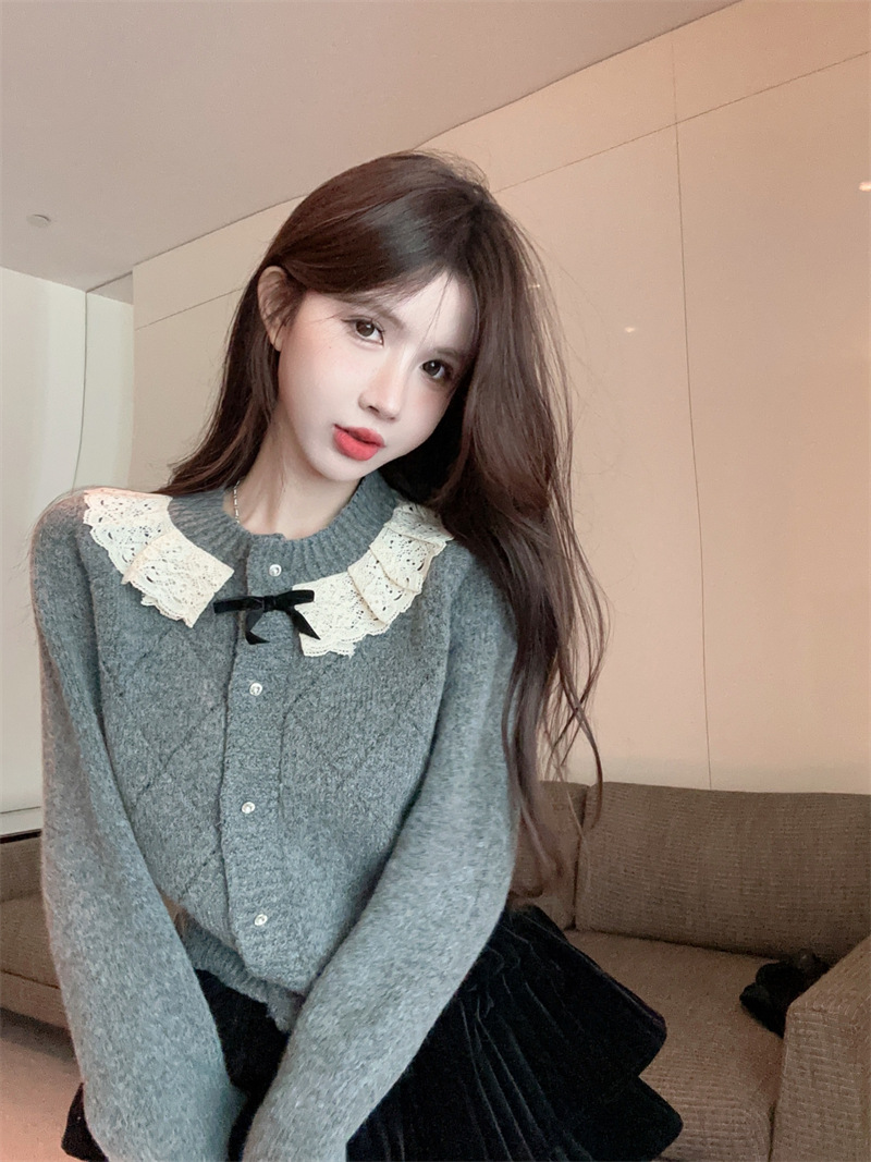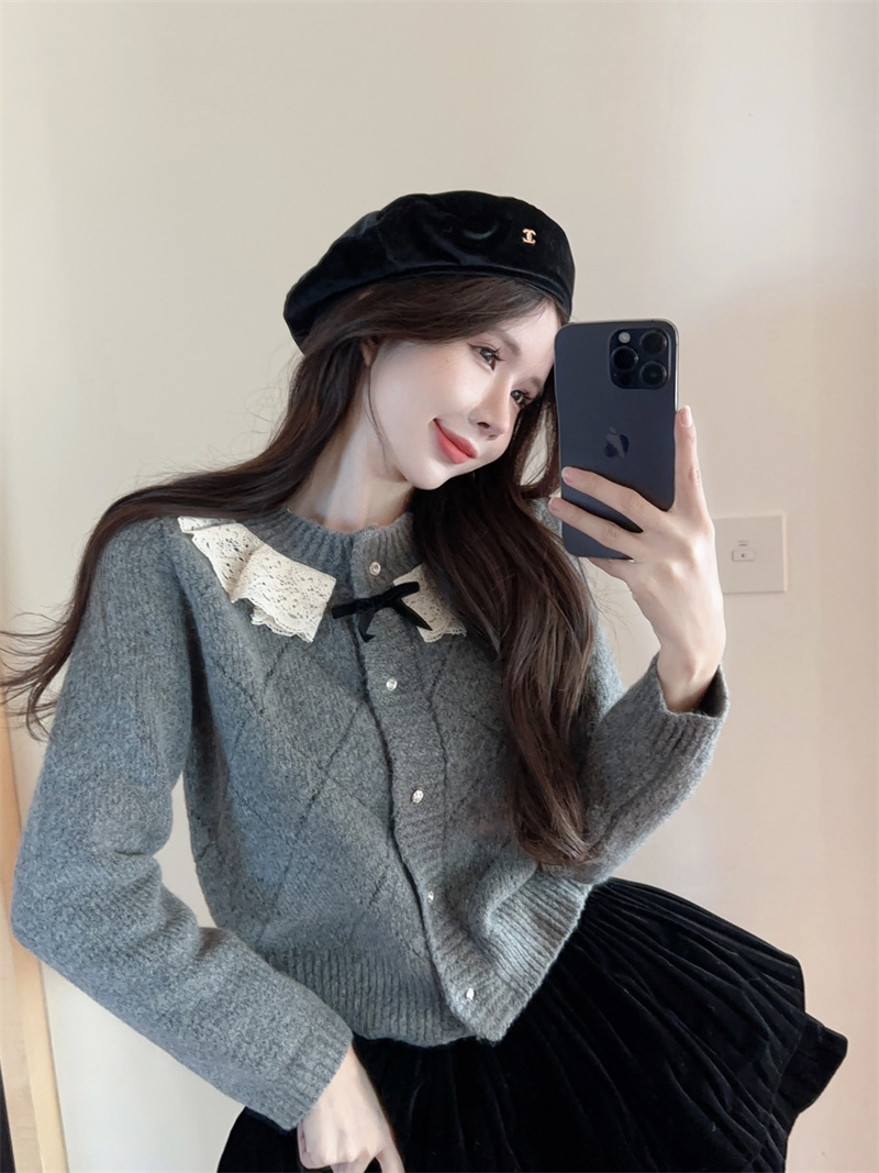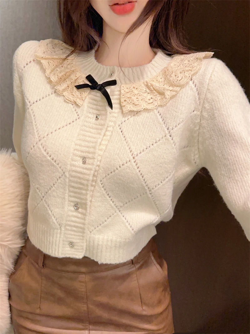 샤넬 스타일 활 니트웨어 여성용 가을과 겨울 프랑스 인형 칼라 레이스 탑 하프 터틀넥 스웨터 카디건 재킷