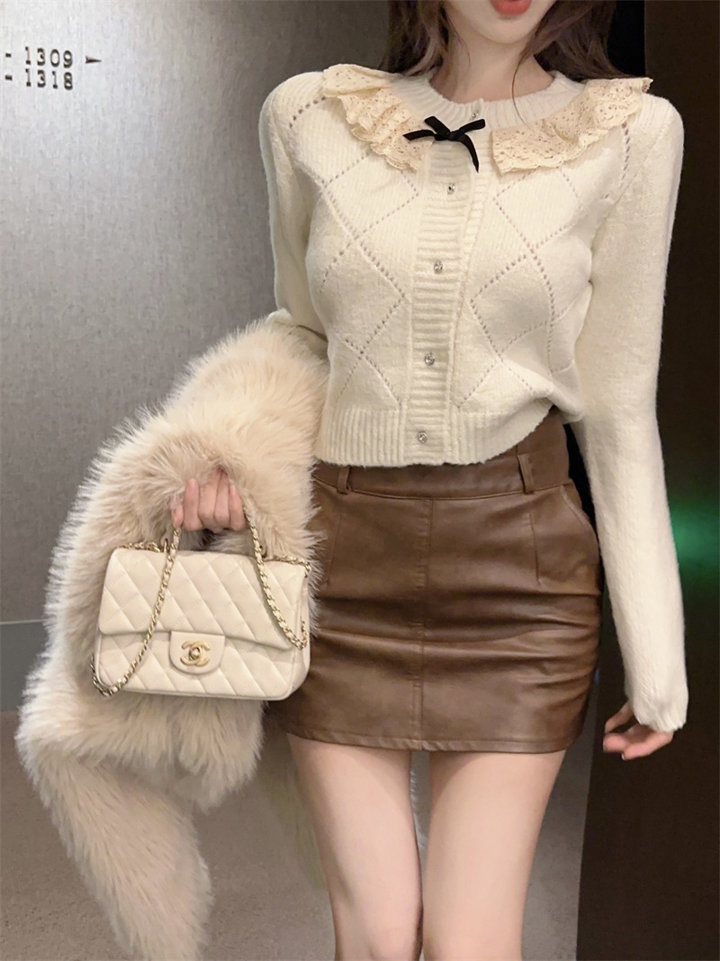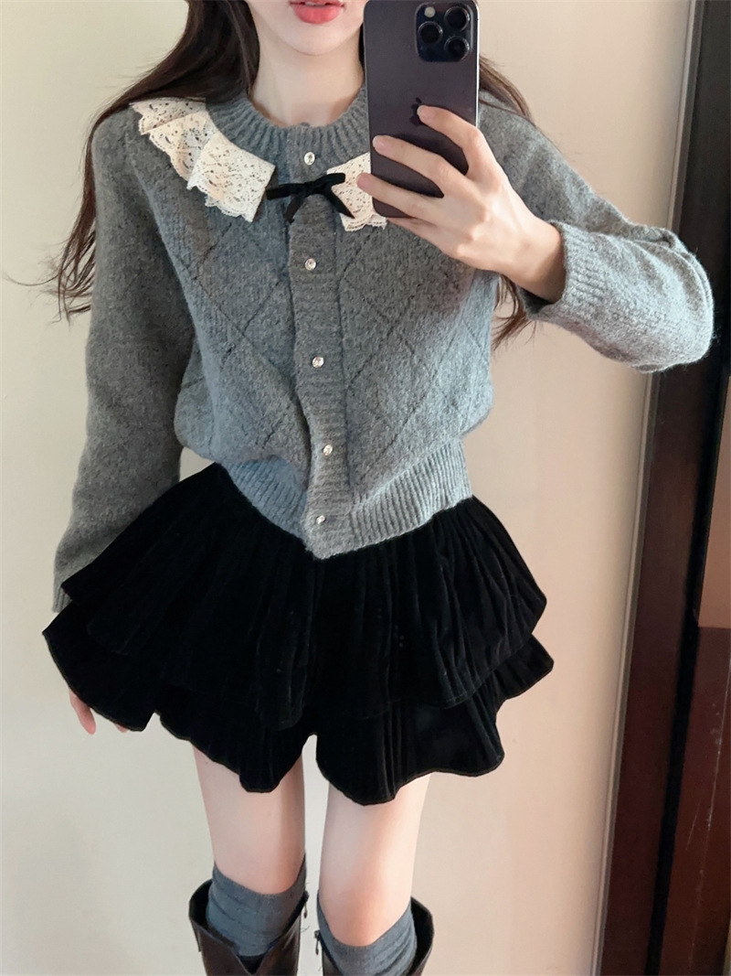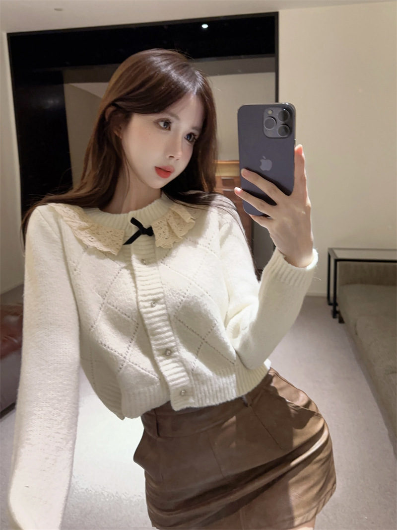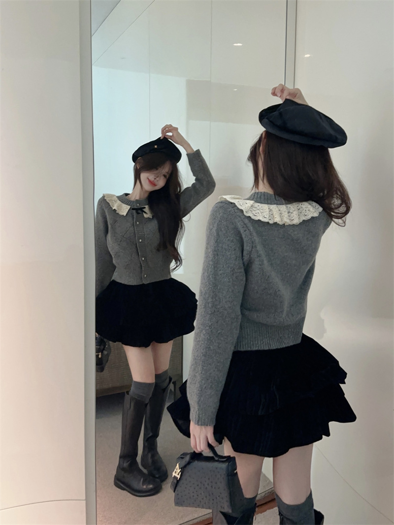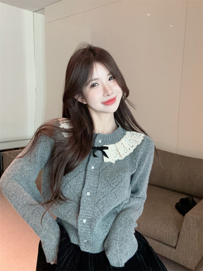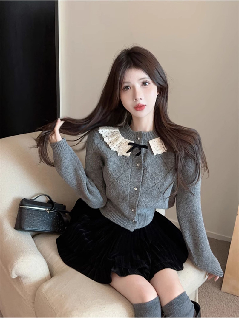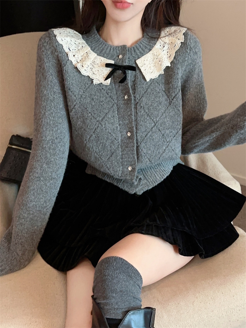샤넬 스타일 활 니트웨어 여성용 가을과 겨울 프랑스 인형 칼라 레이스 탑 하프 터틀넥 스웨터 카디건 재킷