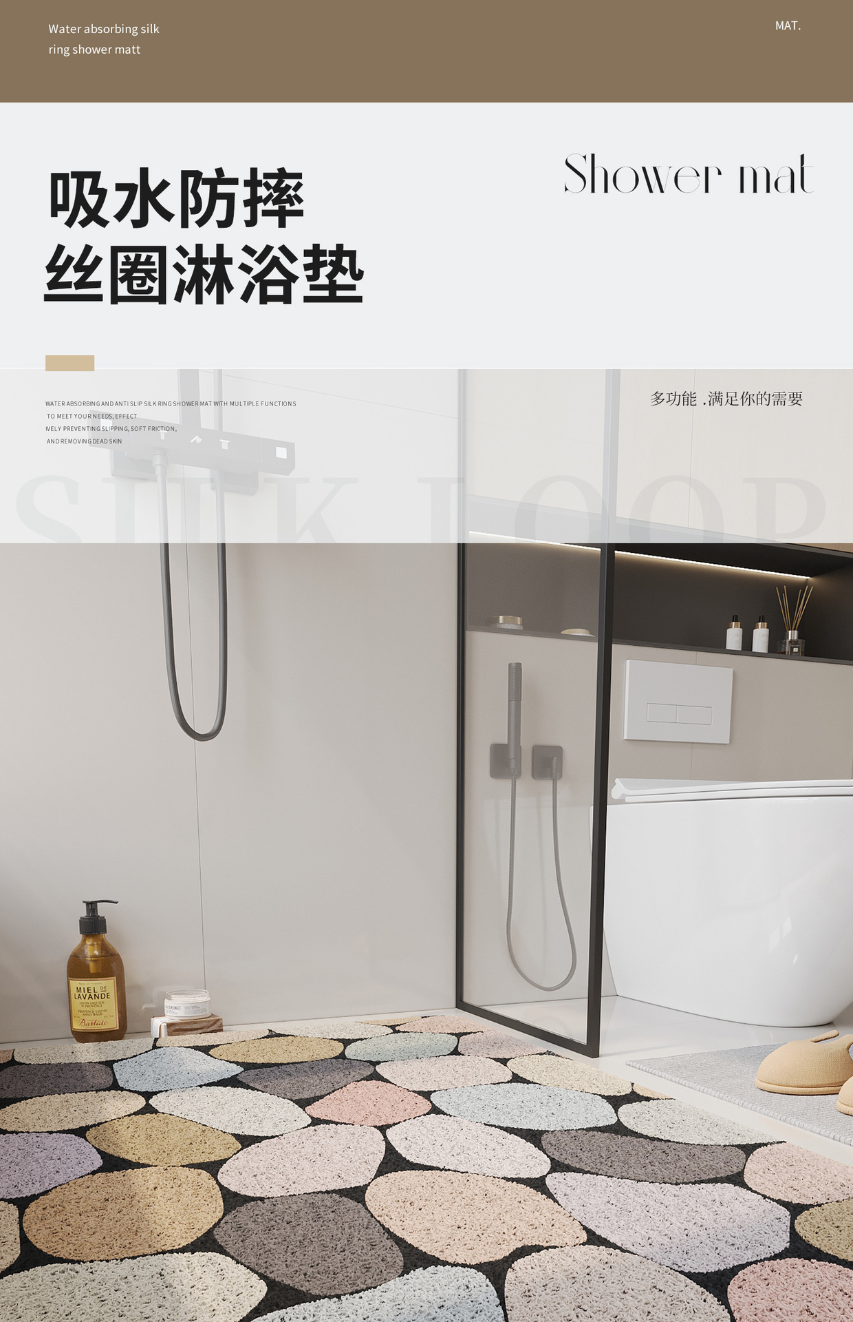샤워 실크 루프 바닥 매트 욕실 욕조 미끄럼 방지 풋 매트 화장실 방수 더티 방지 매트 절단 가능