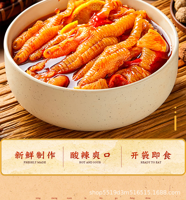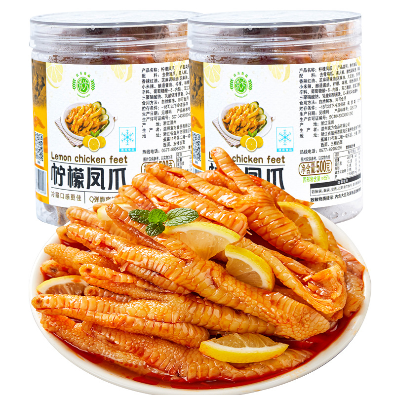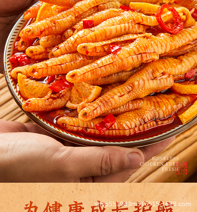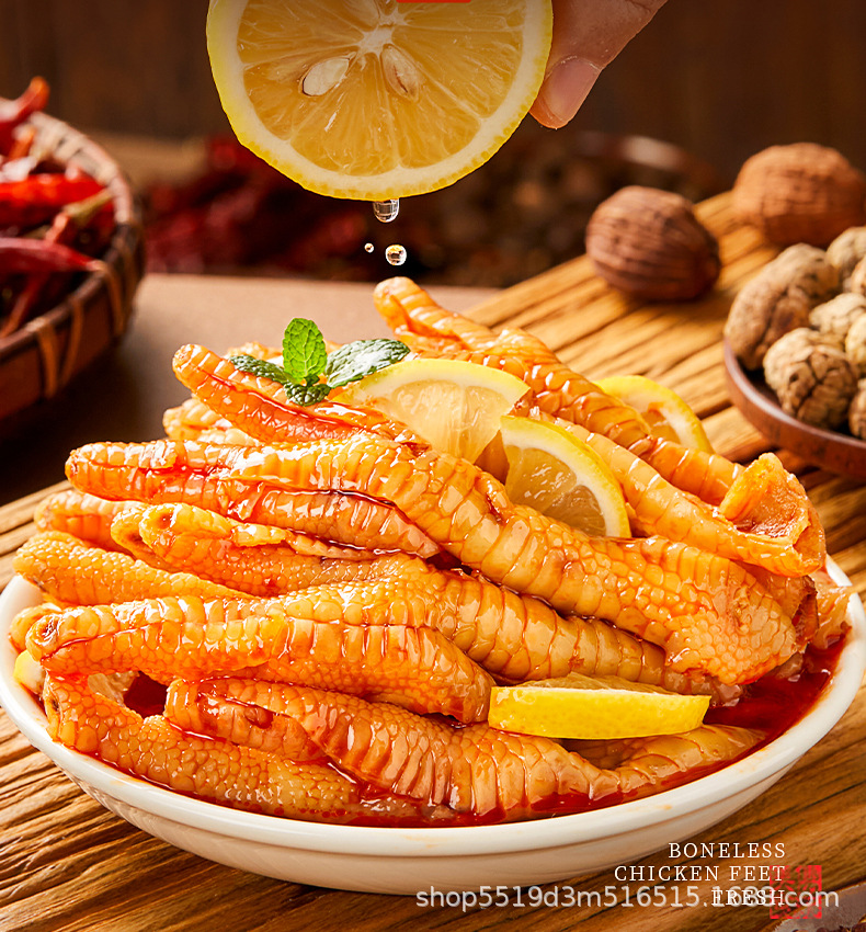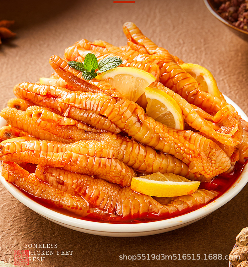 Yuan Fang 뼈없는 치킨 발톱 작은 패키지 그물 인기있는 인스턴트 오픈 백 스톨 시트르산 매운 치킨 클로 절인 와인과 야채 스낵스토어 가기