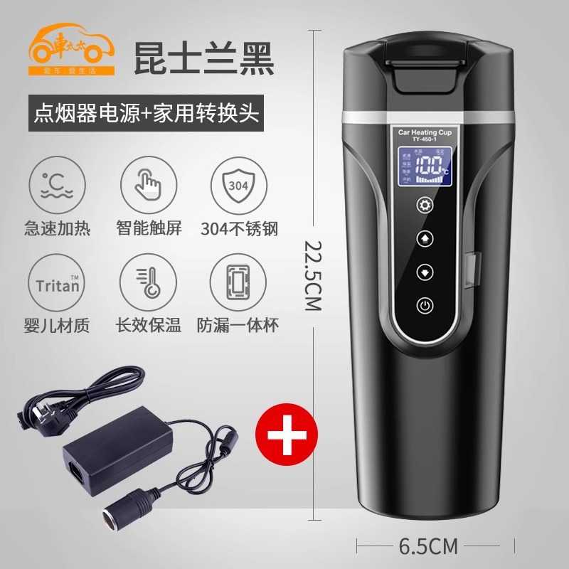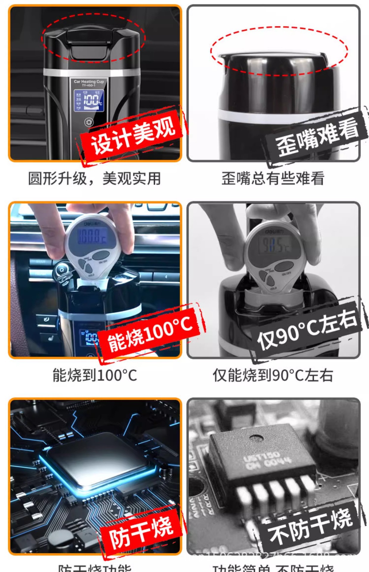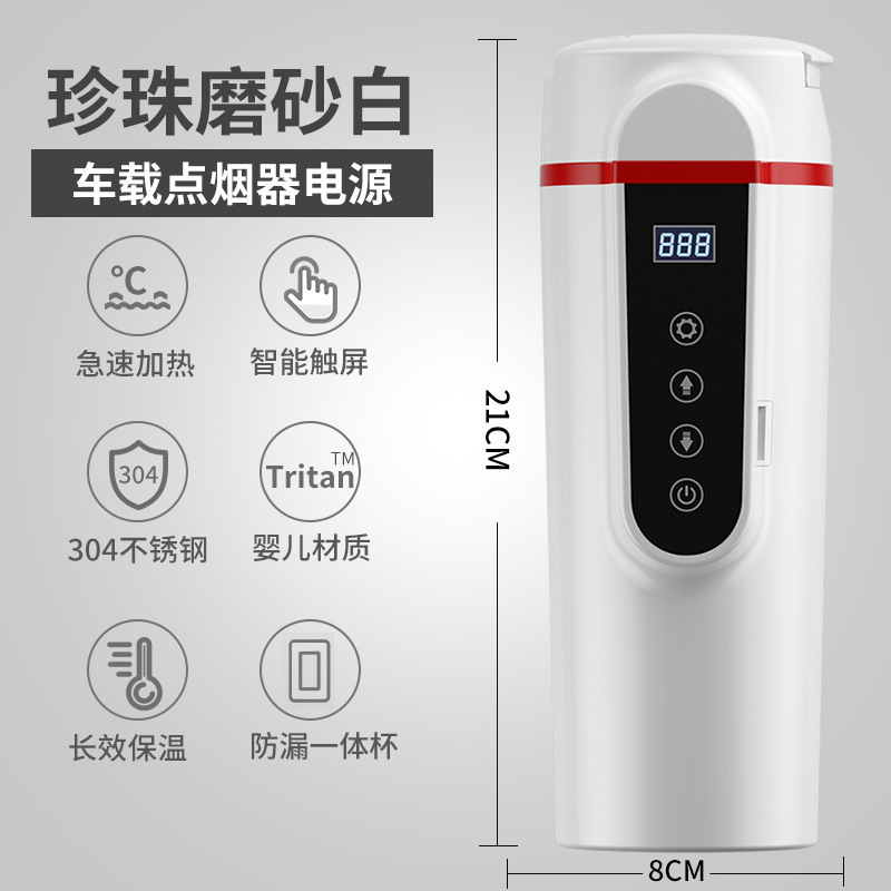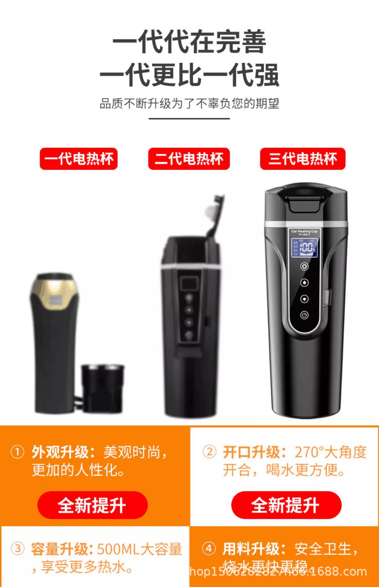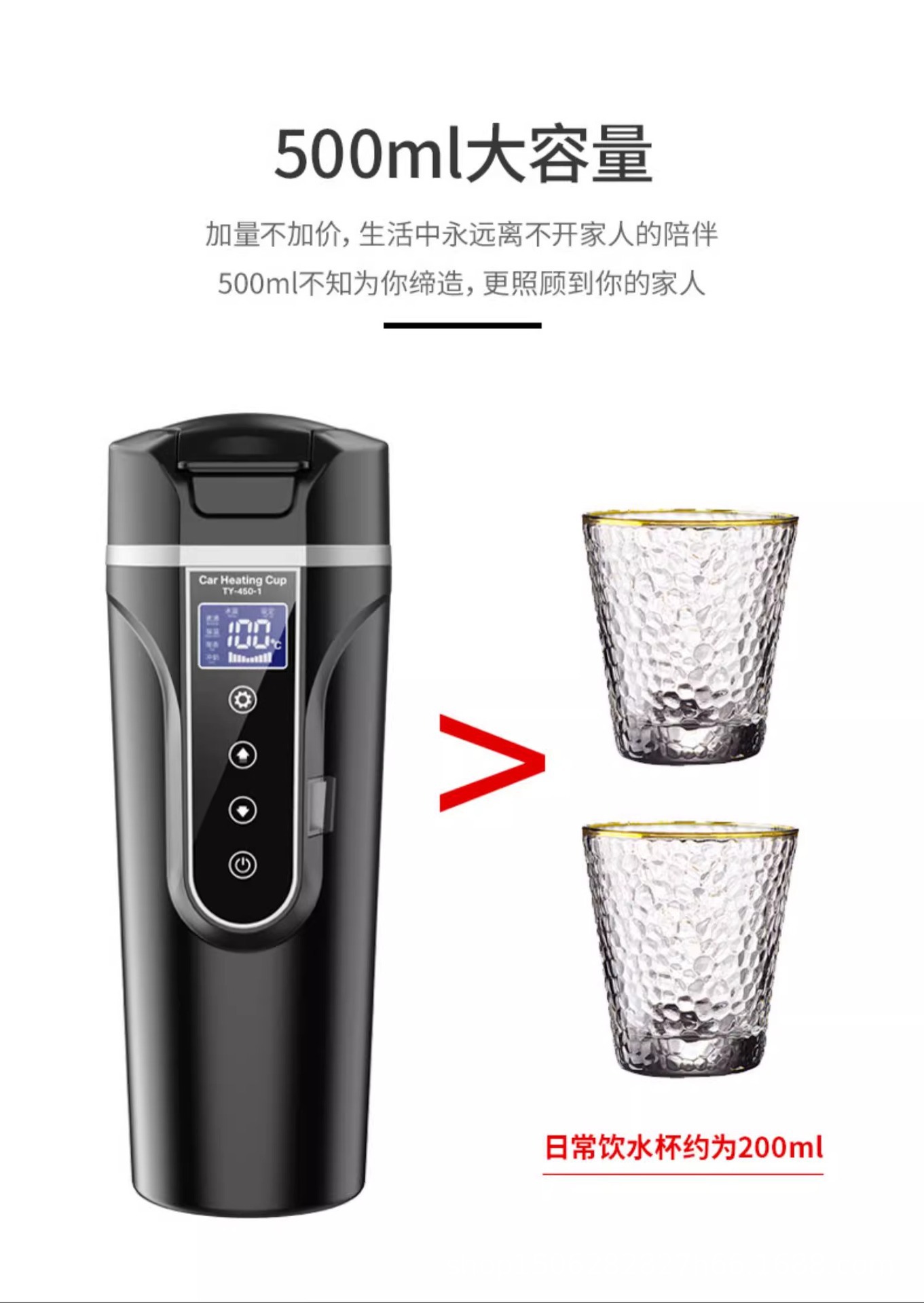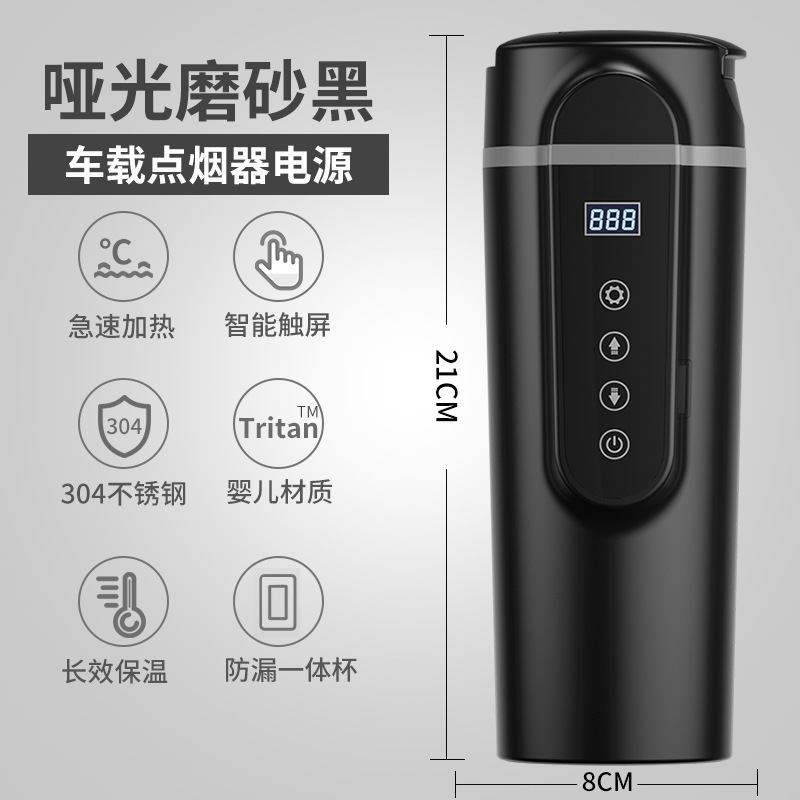 【新款智能车载电热杯】一体式防漏水设计不漏水断电也可保温5-7小时,可控恒温四大功能(煮沸、保温、沏茶、冲奶),智能识别12V/24V电压通用(轿车12V货车24V),智能降压解决有电流保护的车型不能使用问题,睿智黑和雅典白双色可选杯身手感极佳,杯盖可上翻270°让喝水更方便使用更安全,全新科技触摸有声按键。高清液晶显示屏,烧开自动报警停止加热,电源口位于杯身中间侧面完美解决老款放杯架电源线拥挤占空间的难题,底部防滑设计,水杯配带茶漏,还可选配车家两用款让您在家及酒店宾馆也能享受健康干净的开水哦!