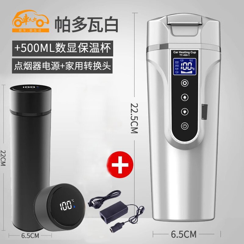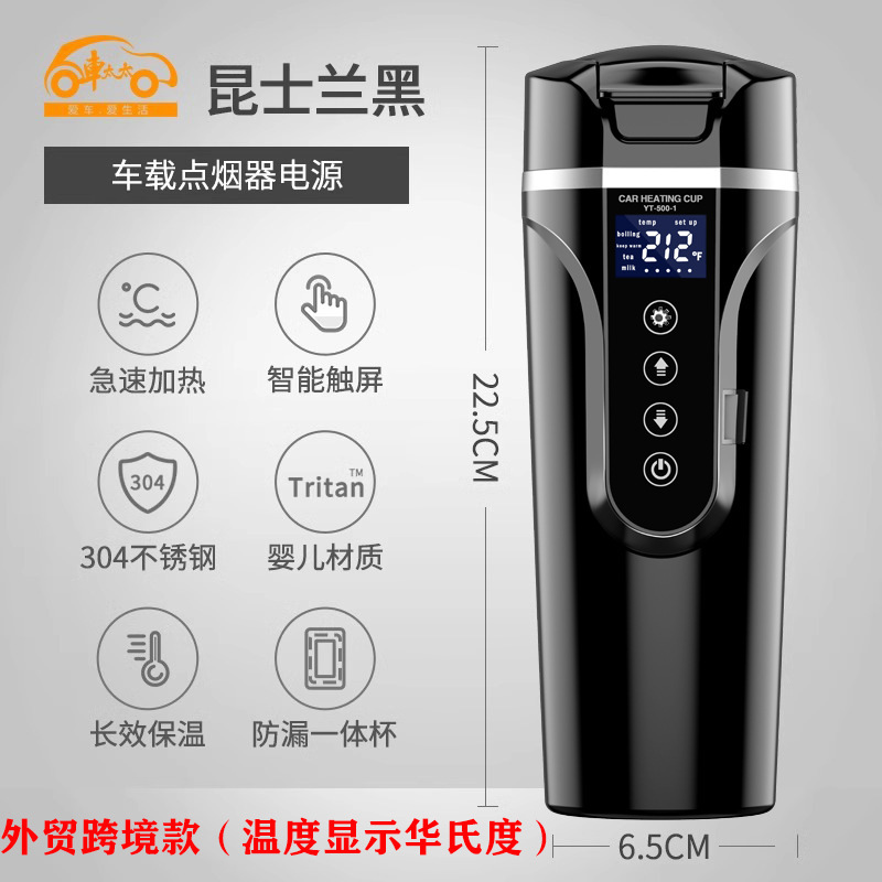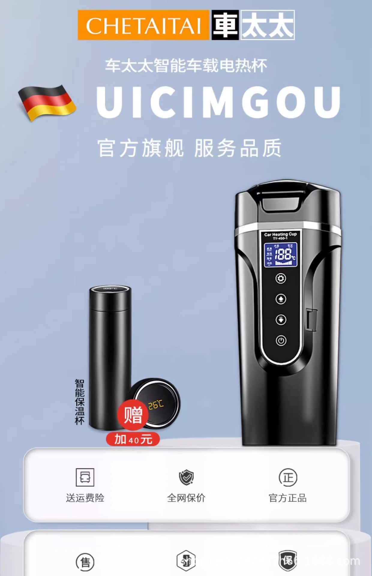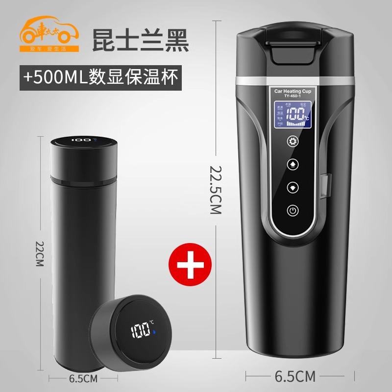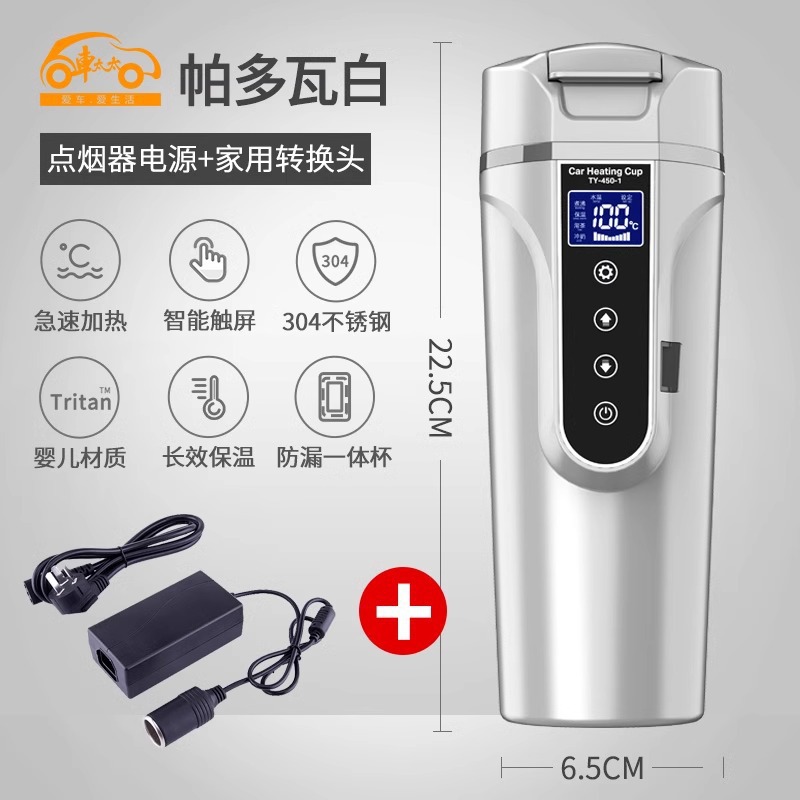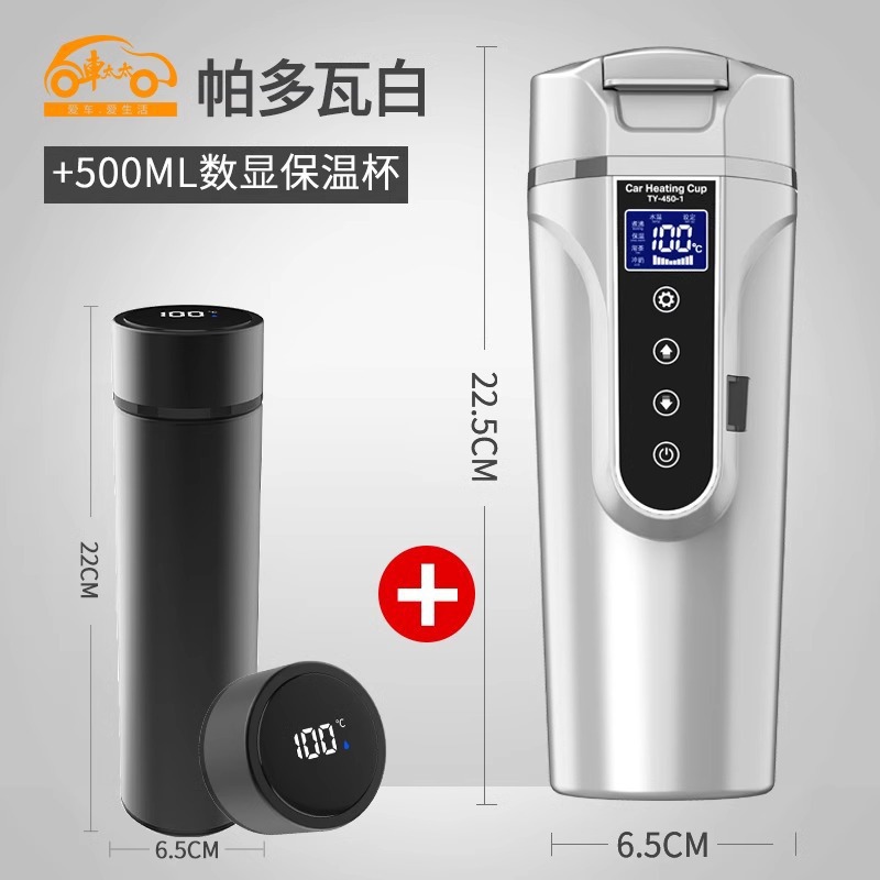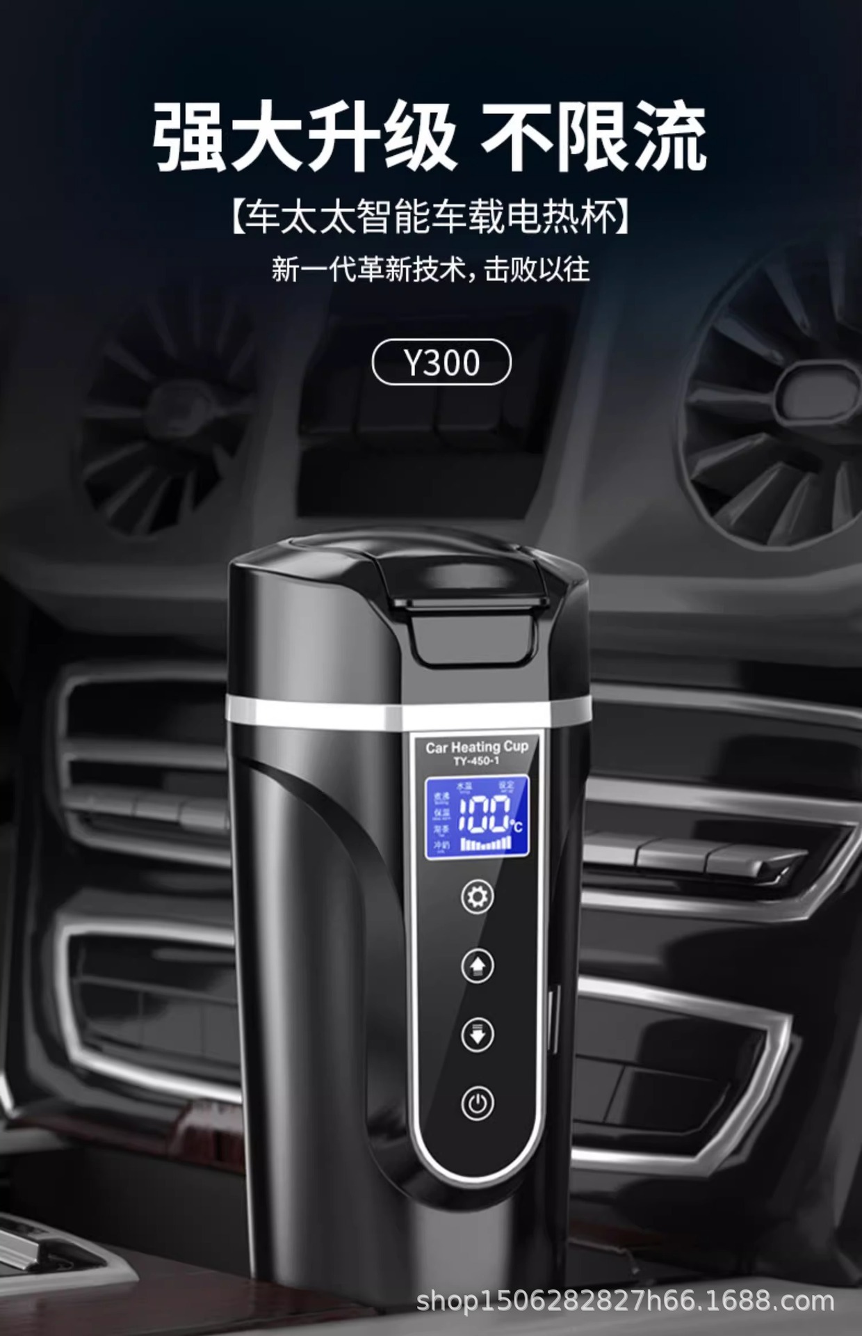 【新款智能车载电热杯】一体式防漏水设计不漏水断电也可保温5-7小时,可控恒温四大功能(煮沸、保温、沏茶、冲奶),智能识别12V/24V电压通用(轿车12V货车24V),智能降压解决有电流保护的车型不能使用问题,睿智黑和雅典白双色可选杯身手感极佳,杯盖可上翻270°让喝水更方便使用更安全,全新科技触摸有声按键。高清液晶显示屏,烧开自动报警停止加热,电源口位于杯身中间侧面完美解决老款放杯架电源线拥挤占空间的难题,底部防滑设计,水杯配带茶漏,还可选配车家两用款让您在家及酒店宾馆也能享受健康干净的开水哦!