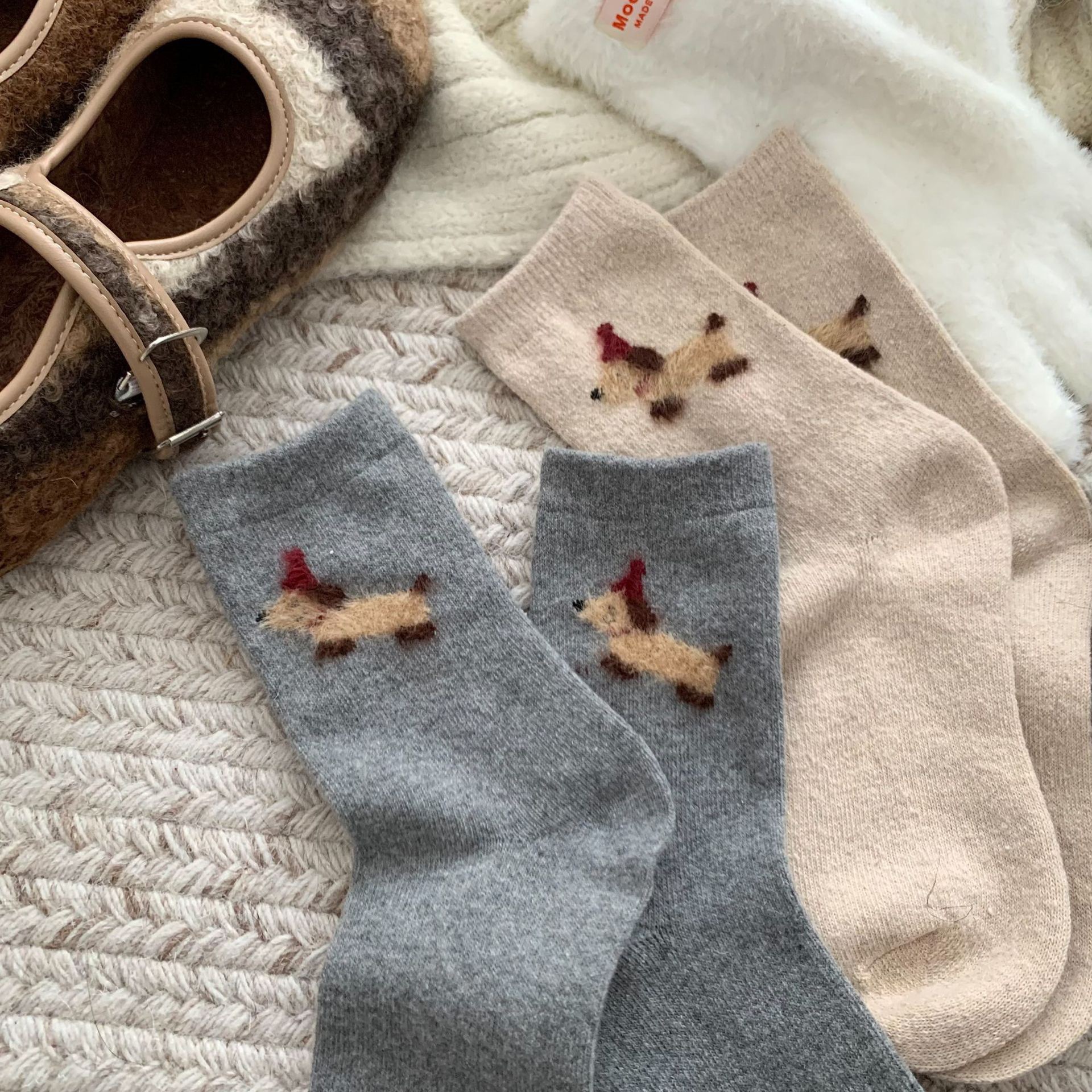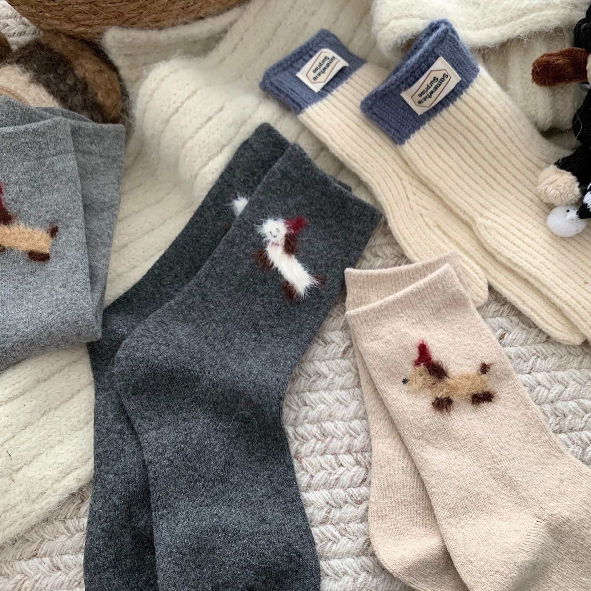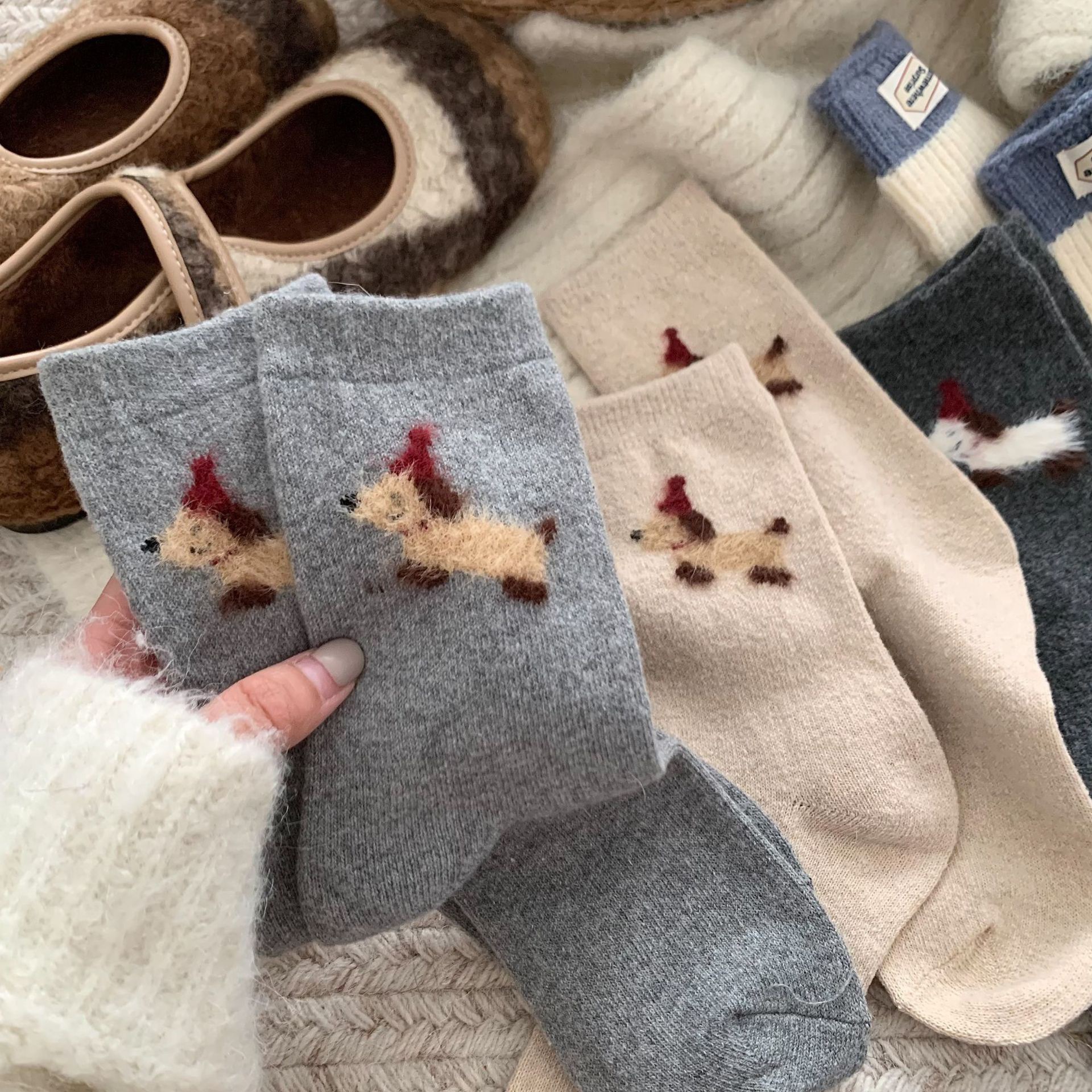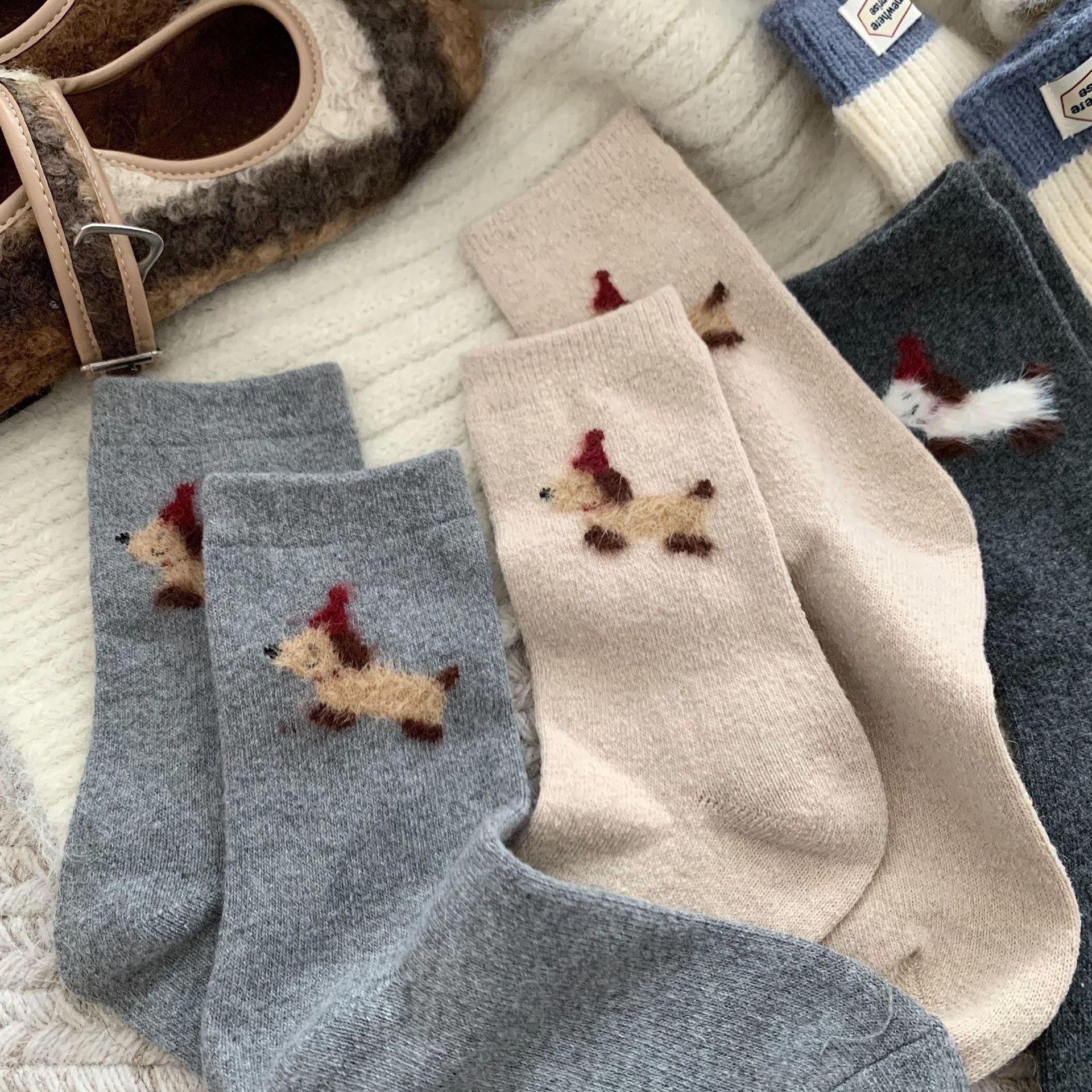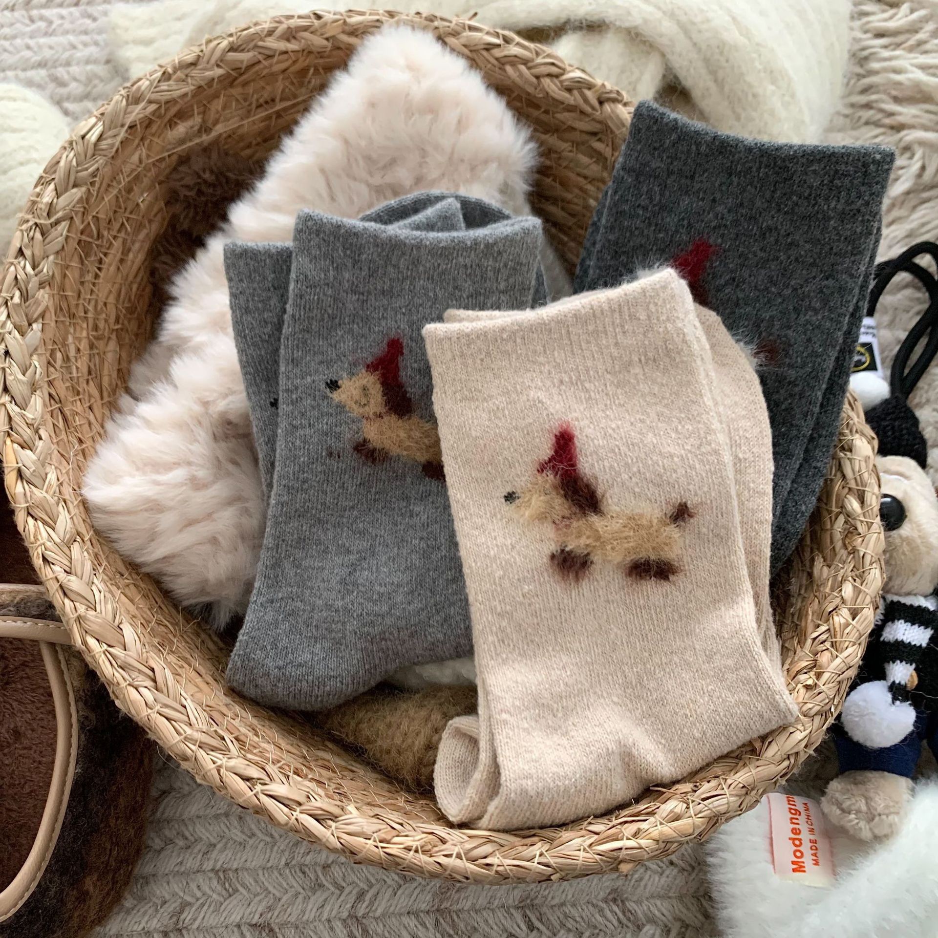 가을과 겨울 새로운 스타일 양말 여성의 두꺼운 양모 중간 길이 양말 Ins 트렌디 한 올매치 귀여운 만화 강아지 양말 따뜻한 양말