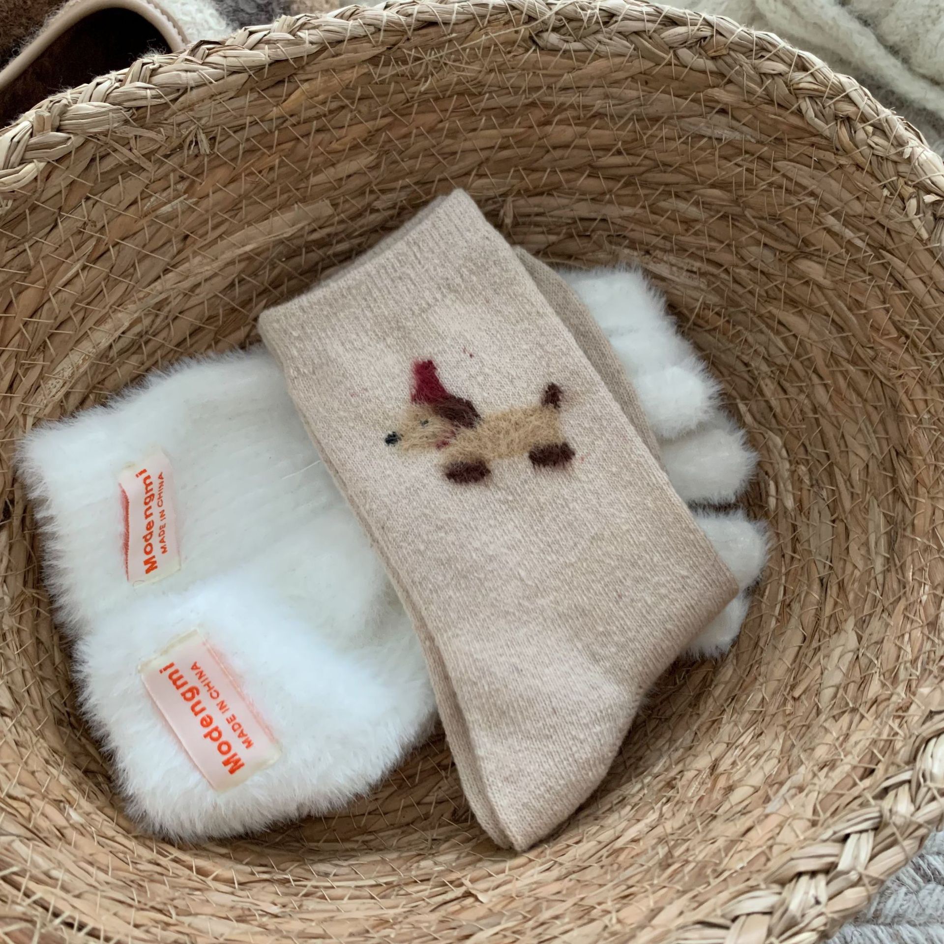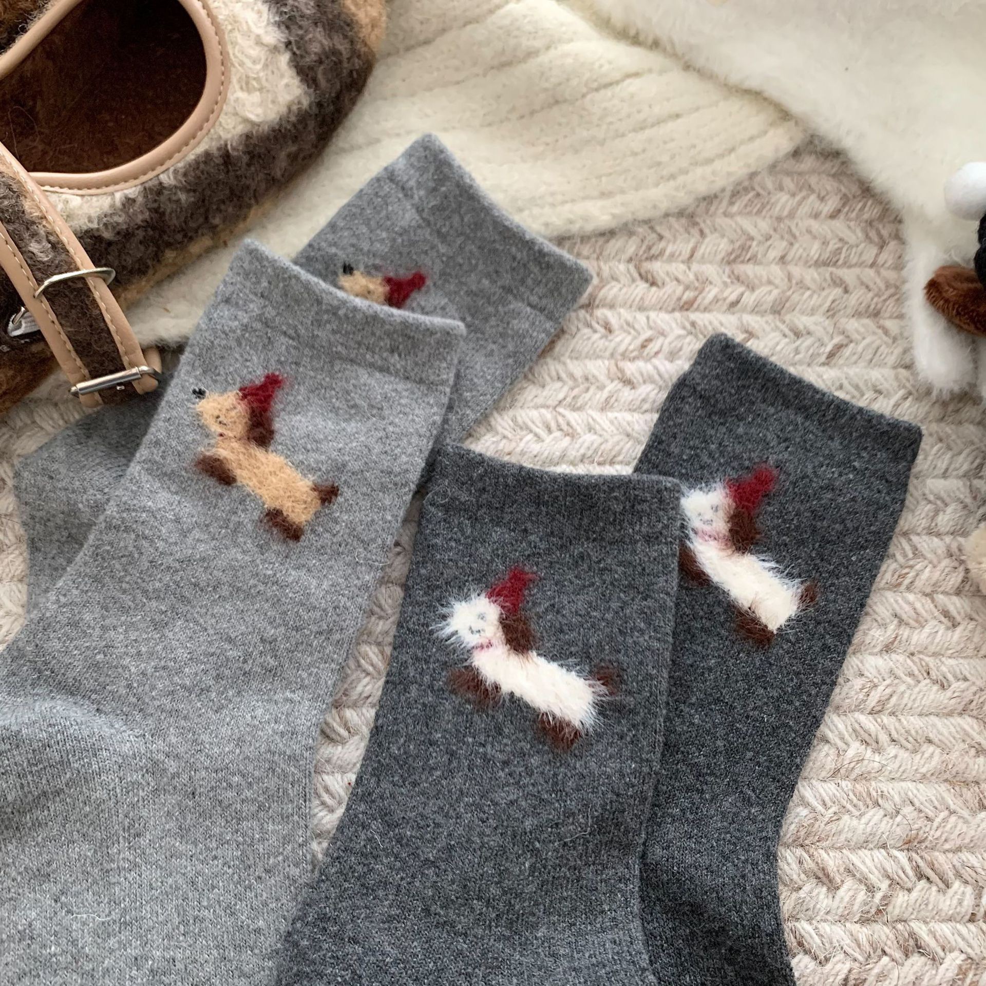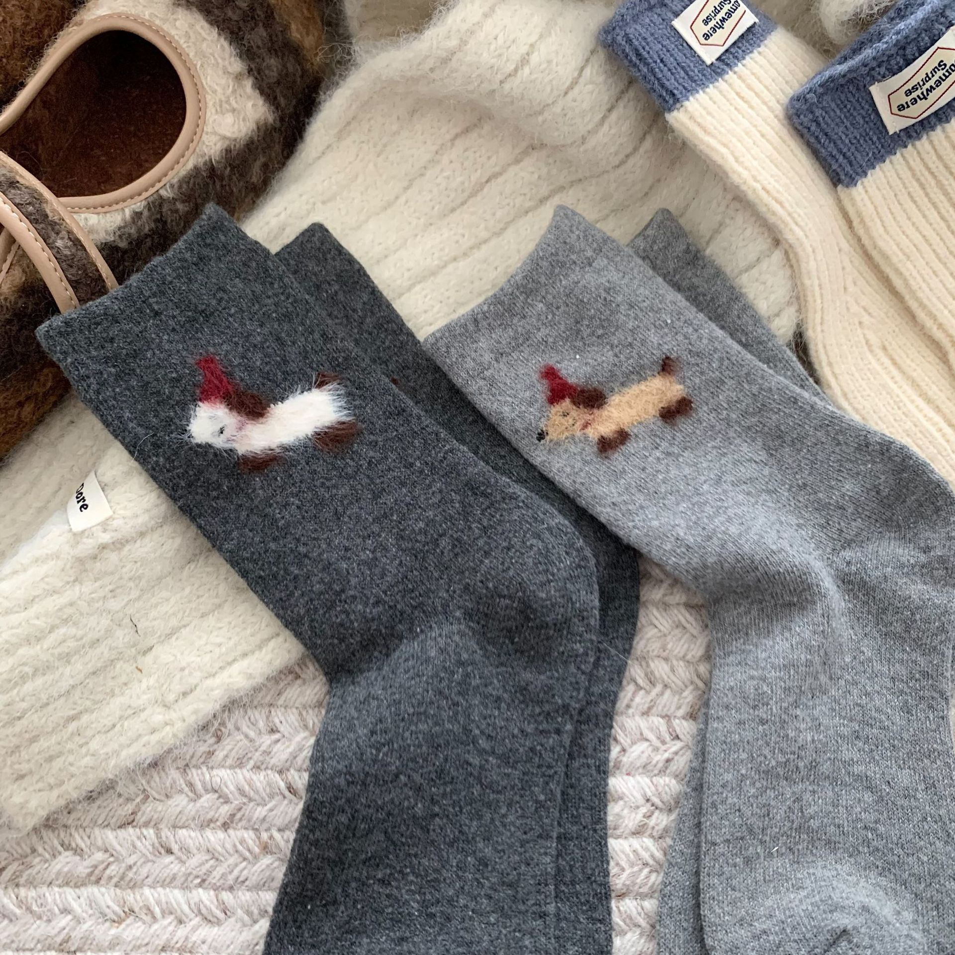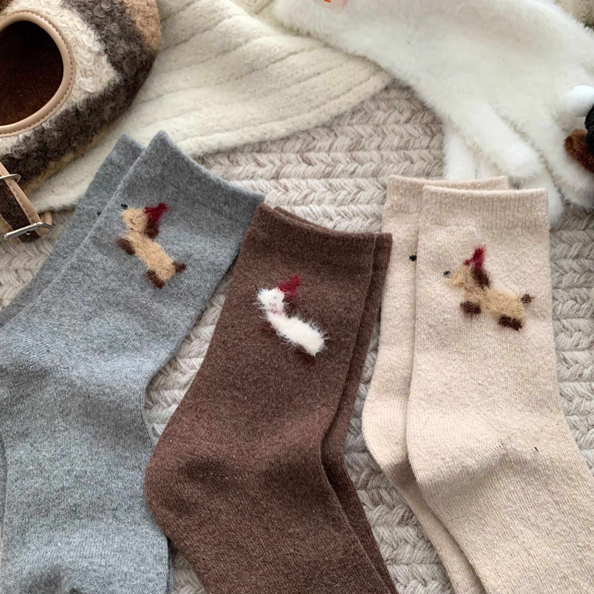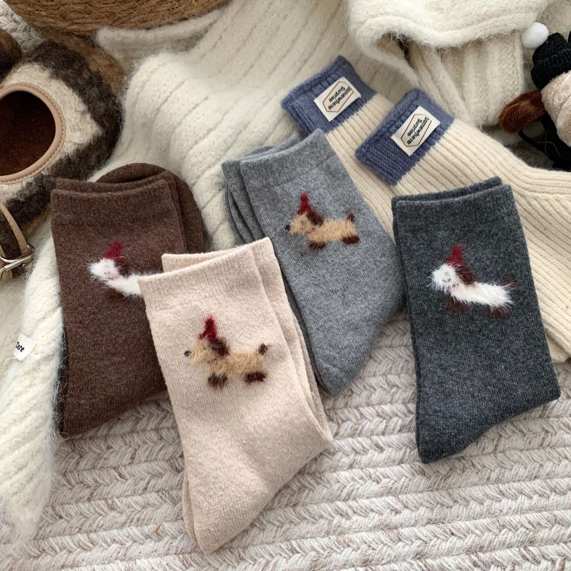 가을과 겨울 새로운 스타일 양말 여성의 두꺼운 양모 중간 길이 양말 Ins 트렌디 한 올매치 귀여운 만화 강아지 양말 따뜻한 양말