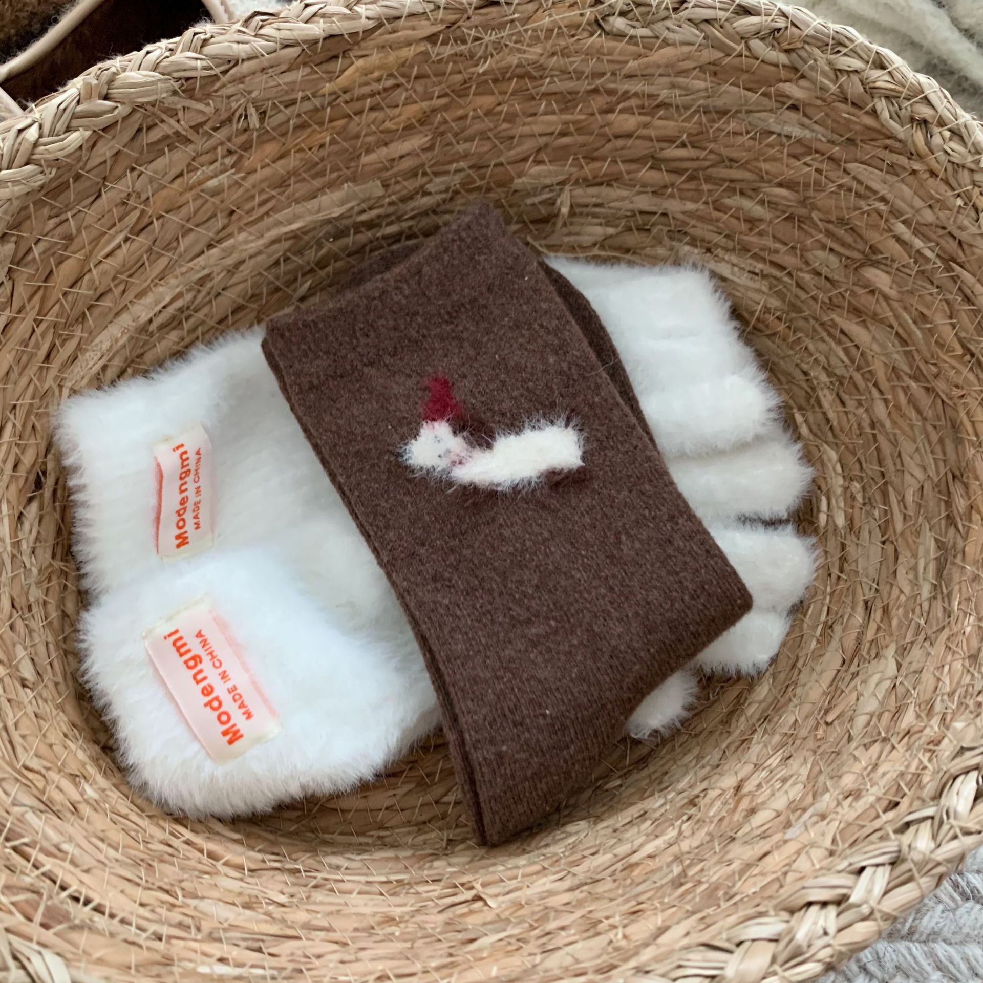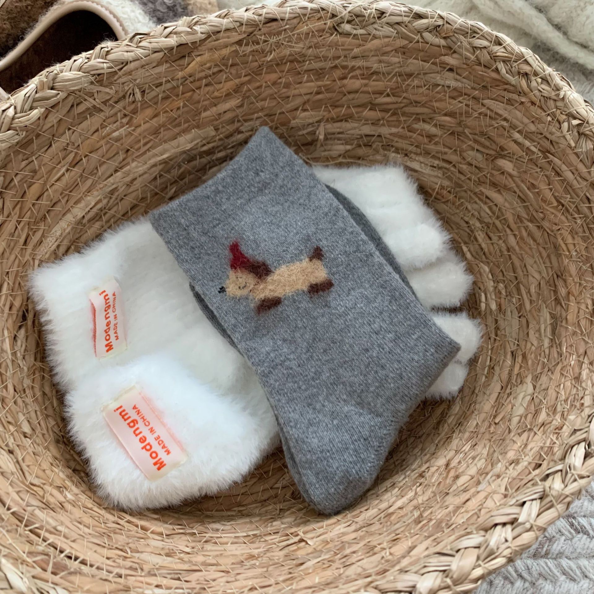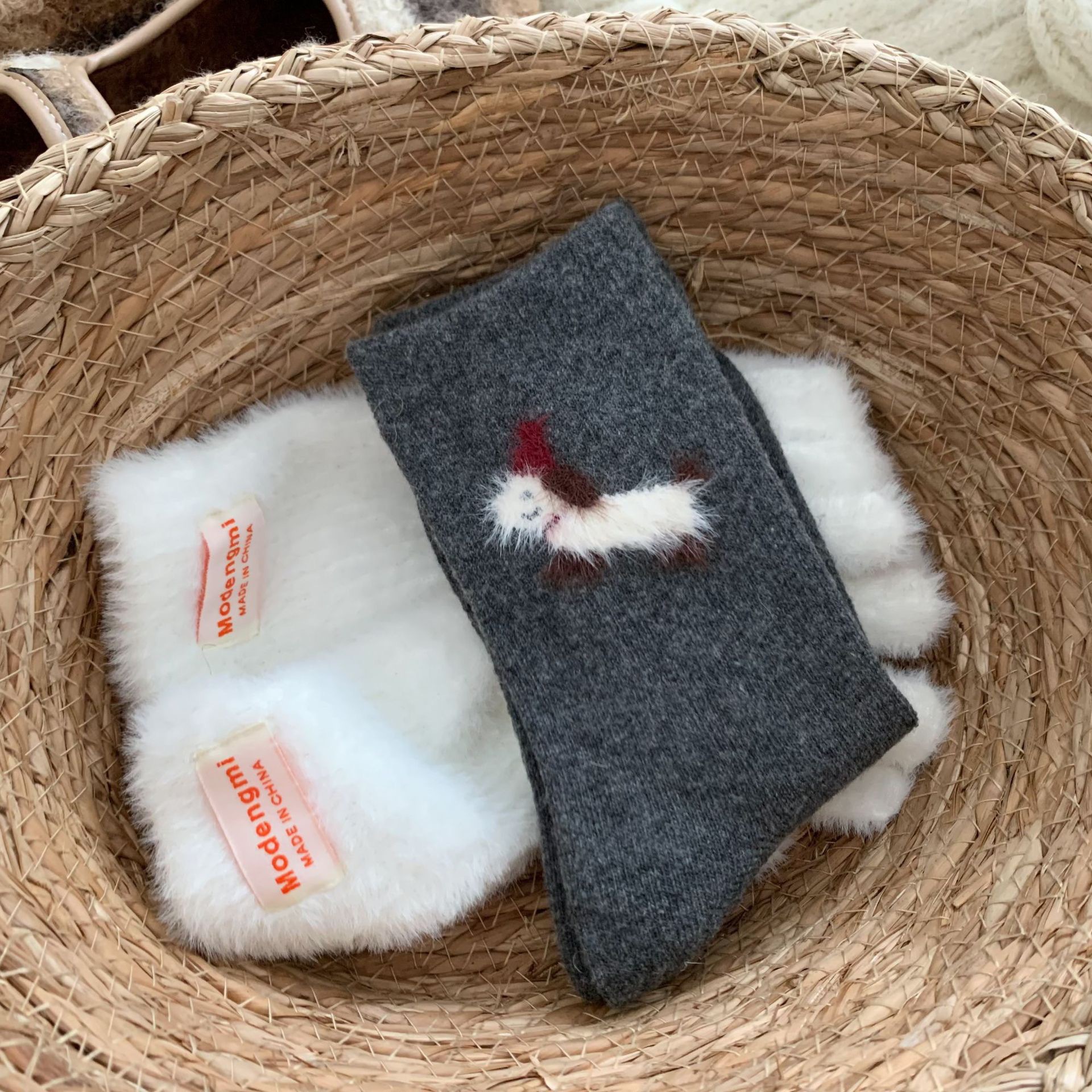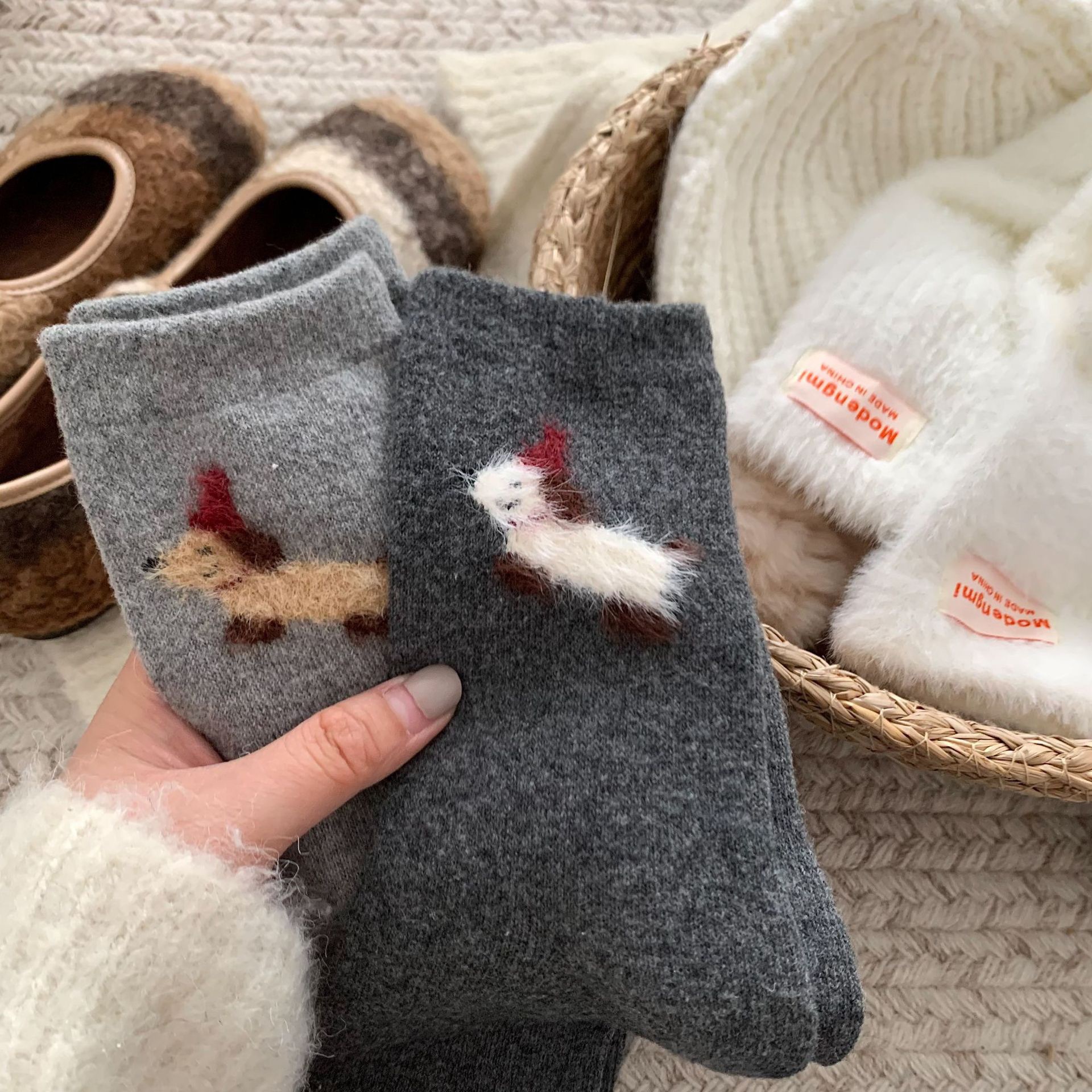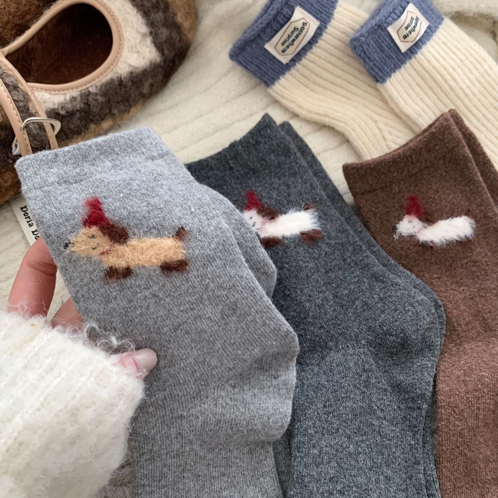가을과 겨울 새로운 스타일 양말 여성의 두꺼운 양모 중간 길이 양말 Ins 트렌디 한 올매치 귀여운 만화 강아지 양말 따뜻한 양말