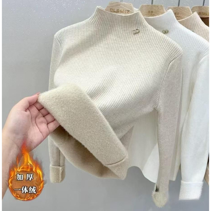 기모 두꺼운 원피스 반터틀넥 스웨터 여성의 가을과 겨울 2024 새로운 니트 내베이스 셔츠 탑