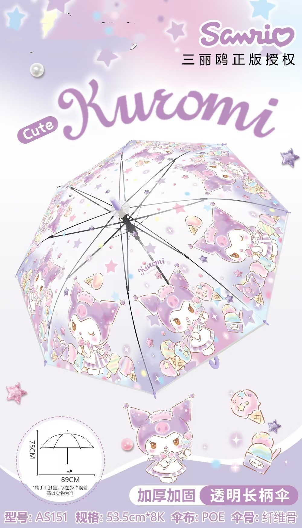 정품 산리오 우산 어린이 친환경 우산 귀여운 만화 쿠로미 스트레이트 롱 핸들 자동 투명 우산