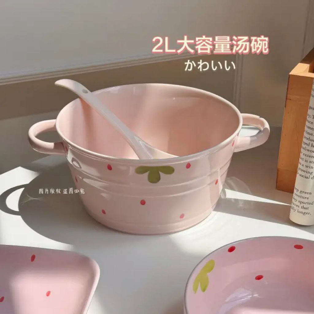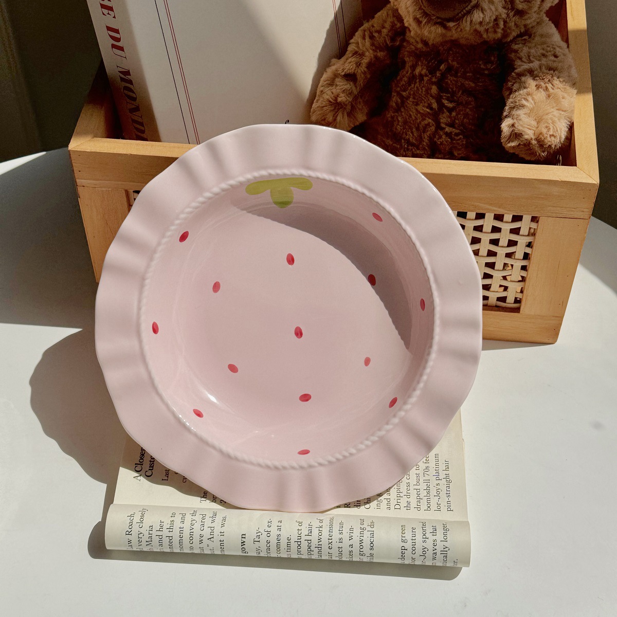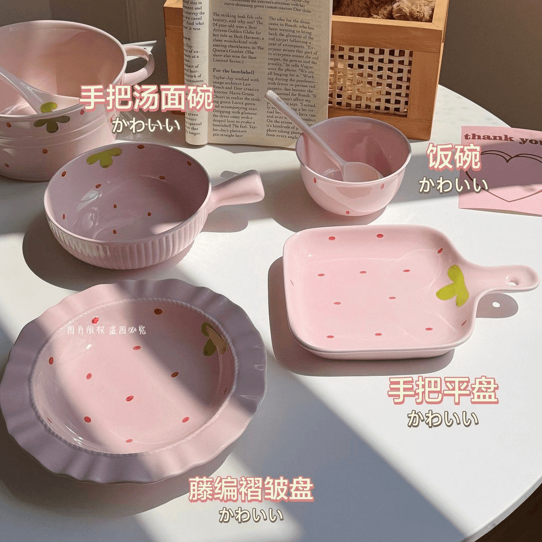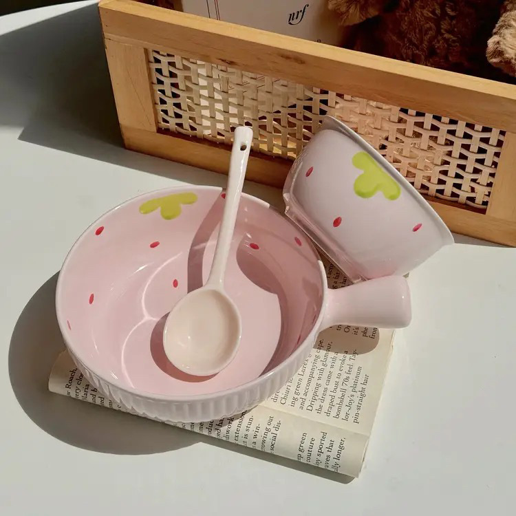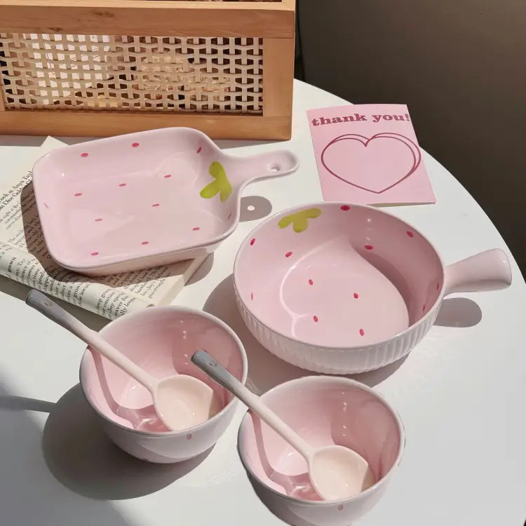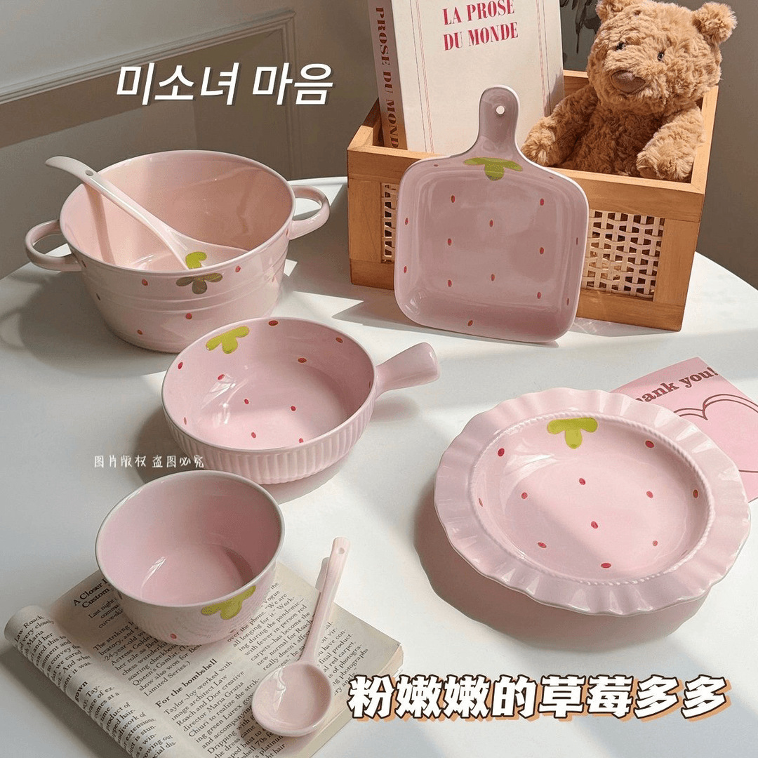 Ins 스타일 딸기 세라믹 요리 가정용 손잡이 요리 불안정한 깔끔한 그릇 2024 높은 색상 가치 식기 식기 세트