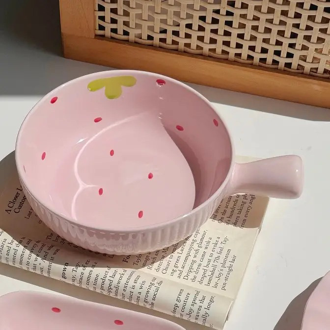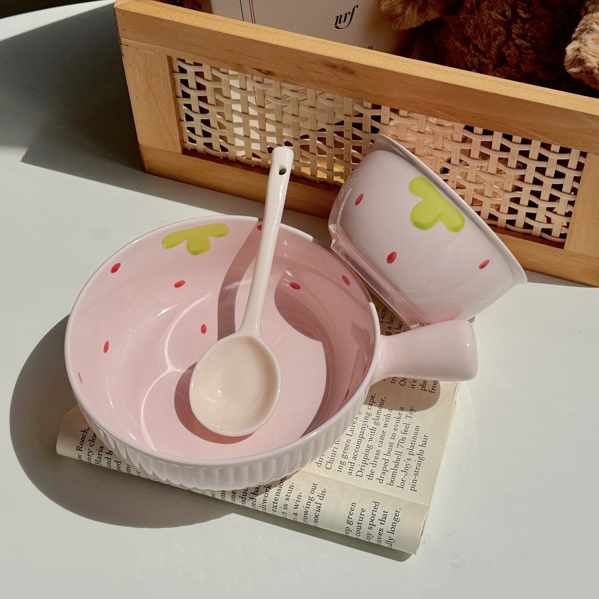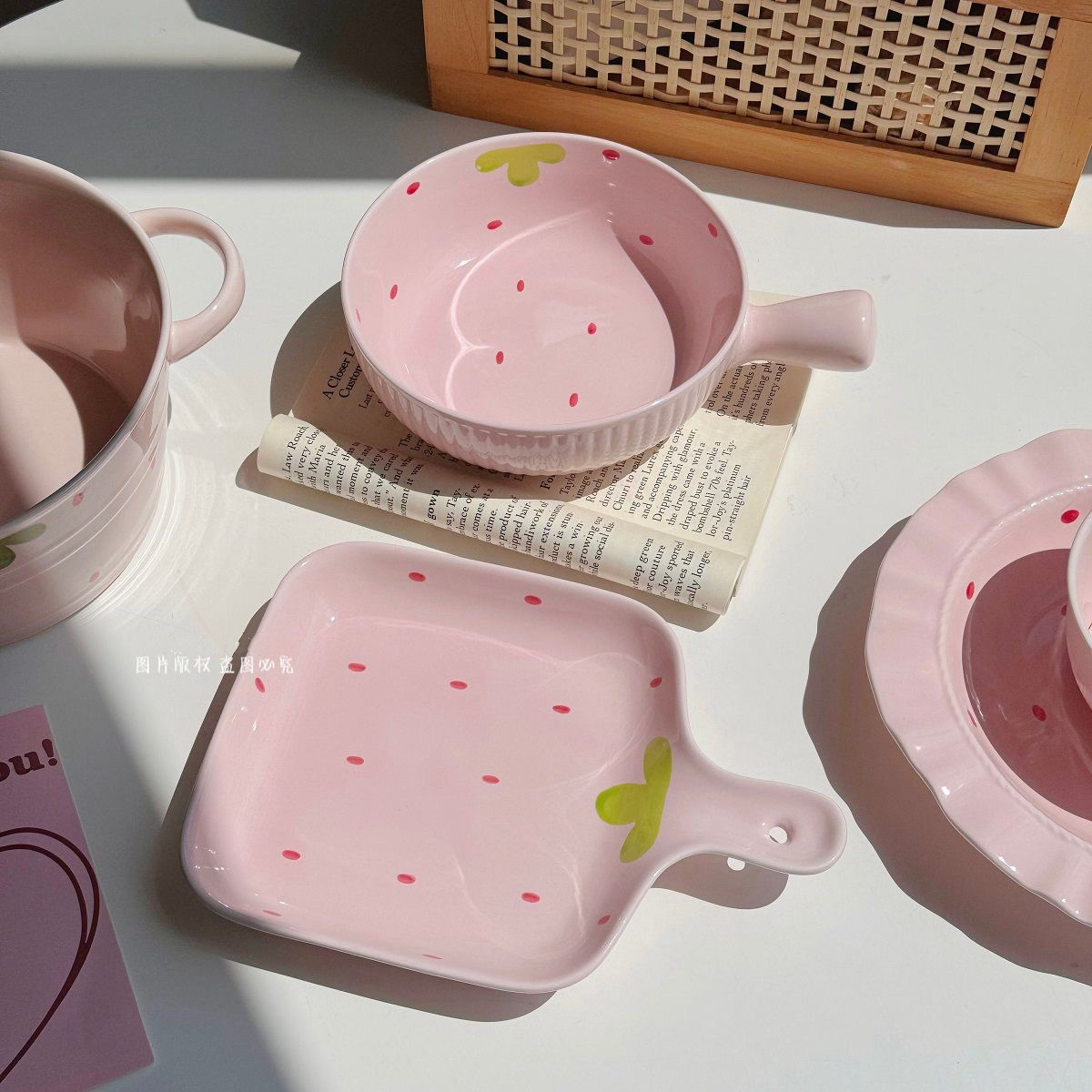 Ins 스타일 딸기 세라믹 요리 가정용 손잡이 요리 불안정한 깔끔한 그릇 2024 높은 색상 가치 식기 식기 세트스토어 가기