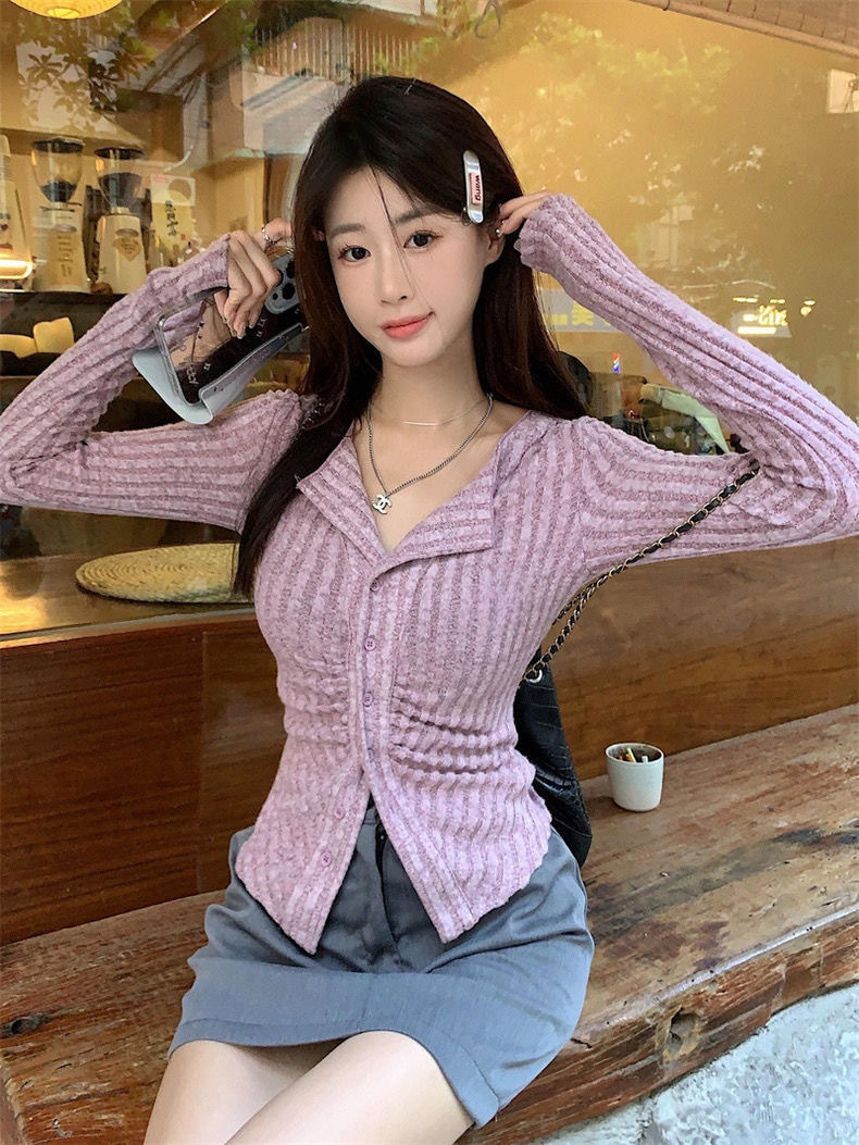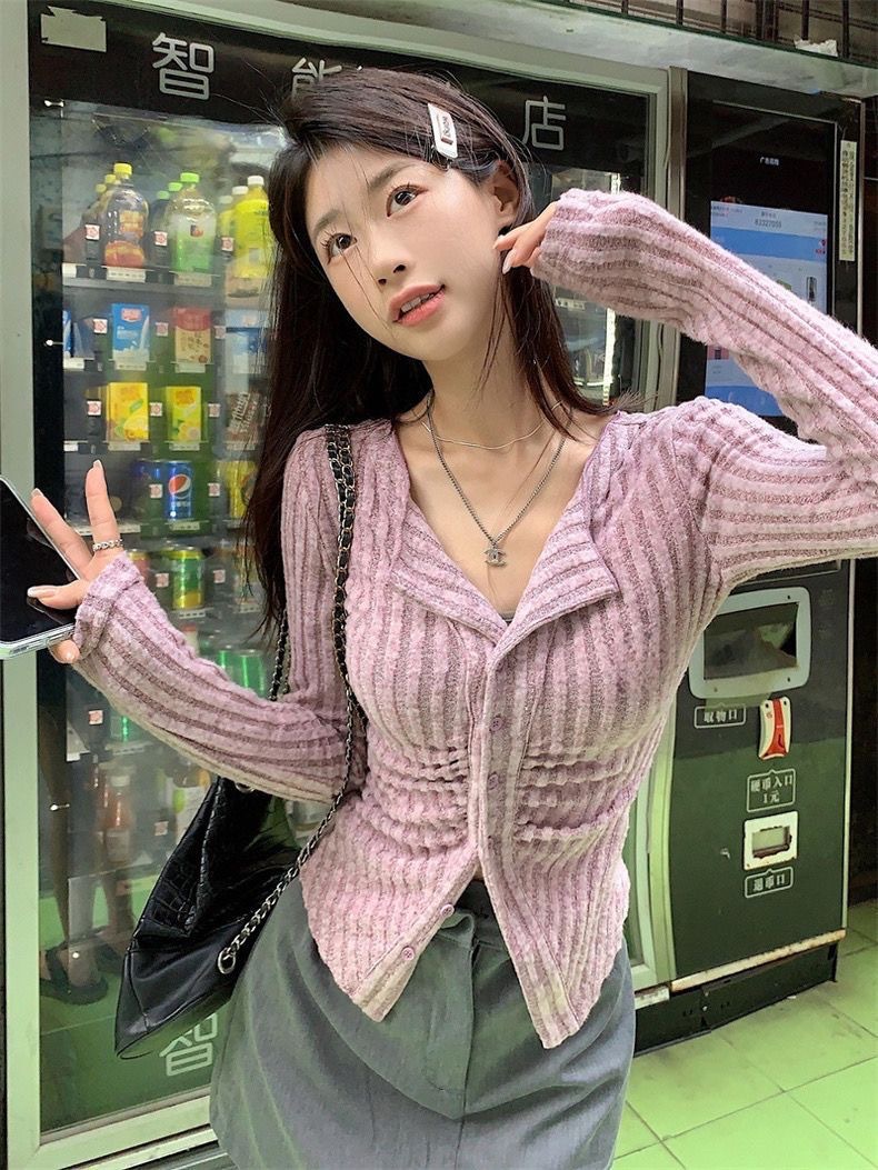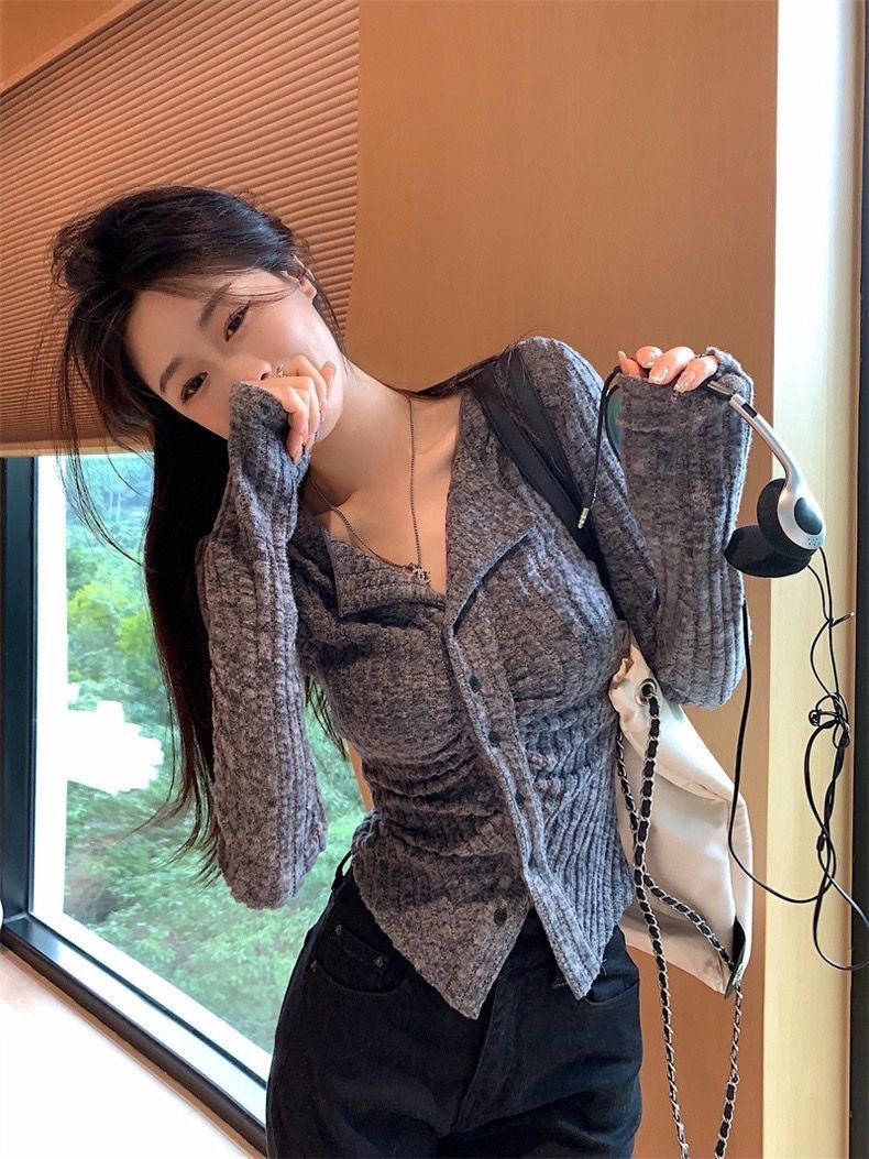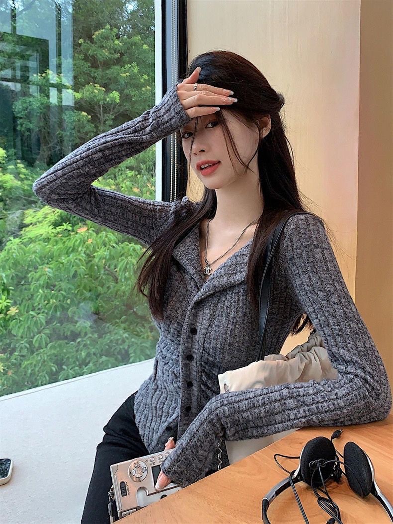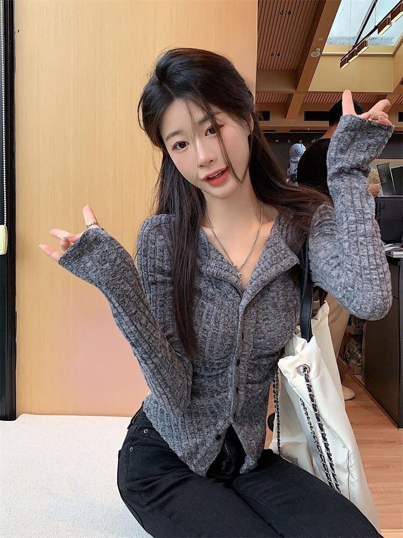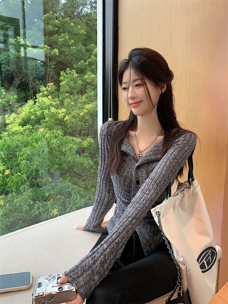 달콤하고 매운 회색 긴팔 스웨터 여성의 봄과 가을 한국 스타일 새로운 패션 슬림 핏 디자인 틈새 싱글 브레스트 탑스토어 가기
