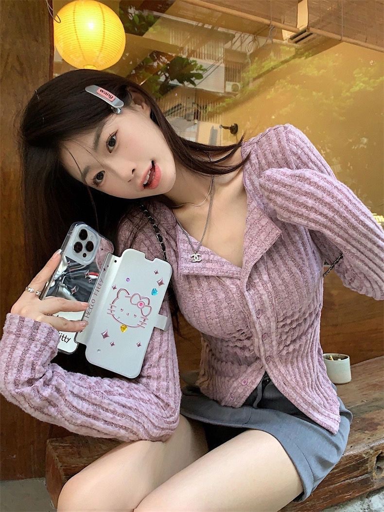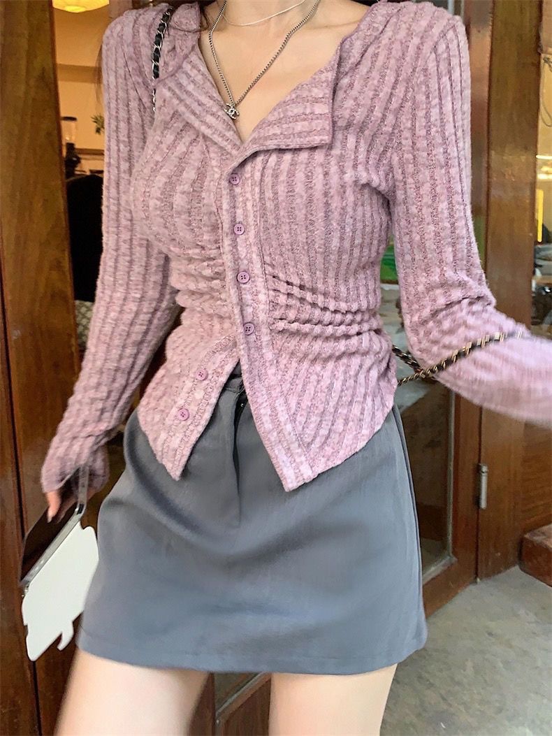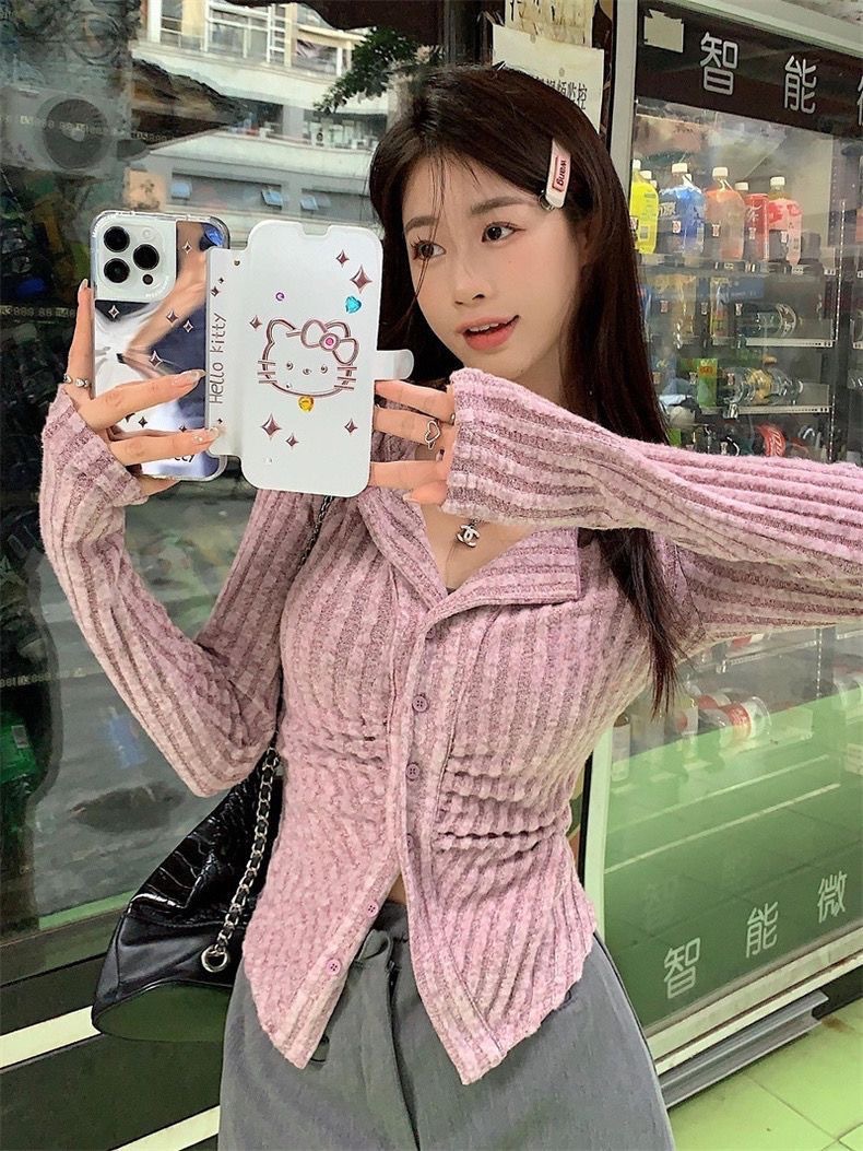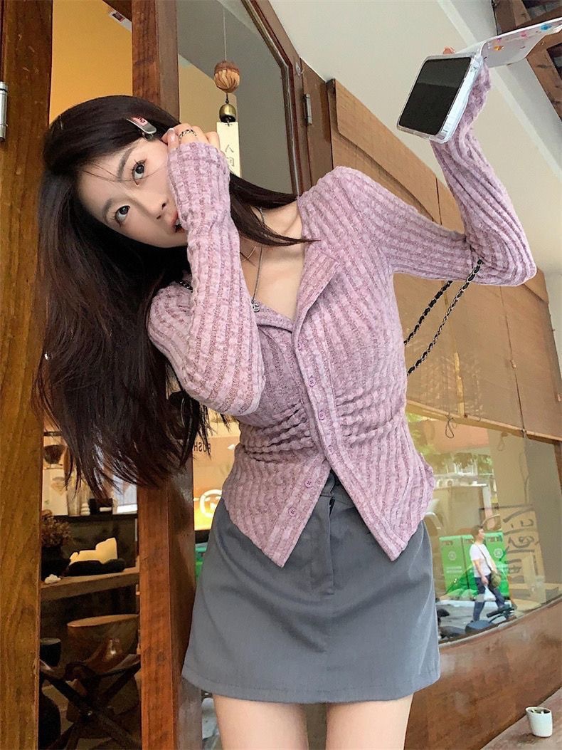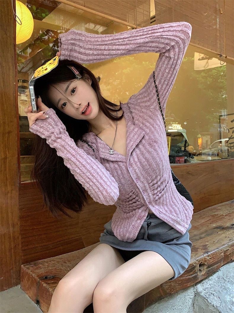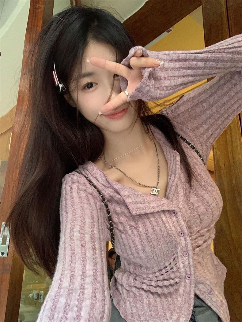달콤하고 매운 회색 긴팔 스웨터 여성의 봄과 가을 한국 스타일 새로운 패션 슬림 핏 디자인 틈새 싱글 브레스트 탑스토어 가기