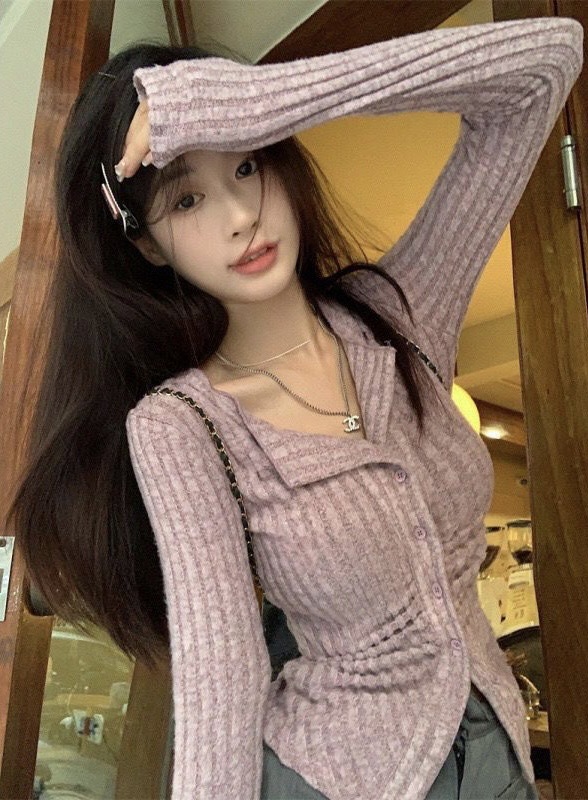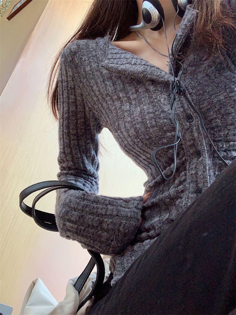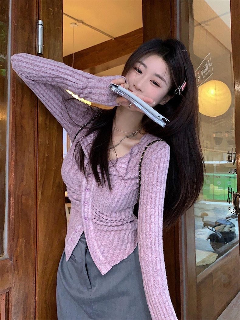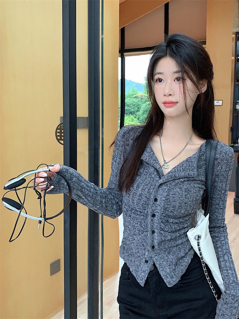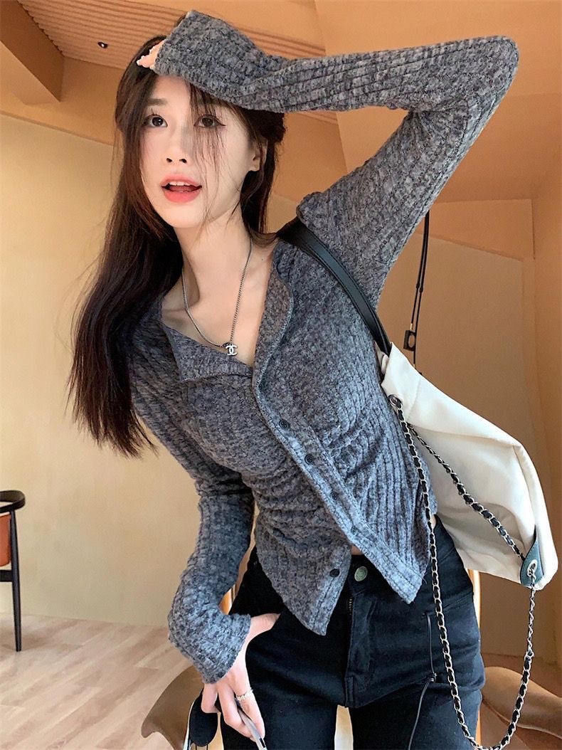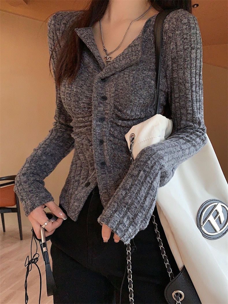 달콤하고 매운 회색 긴팔 스웨터 여성의 봄과 가을 한국 스타일 새로운 패션 슬림 핏 디자인 틈새 싱글 브레스트 탑