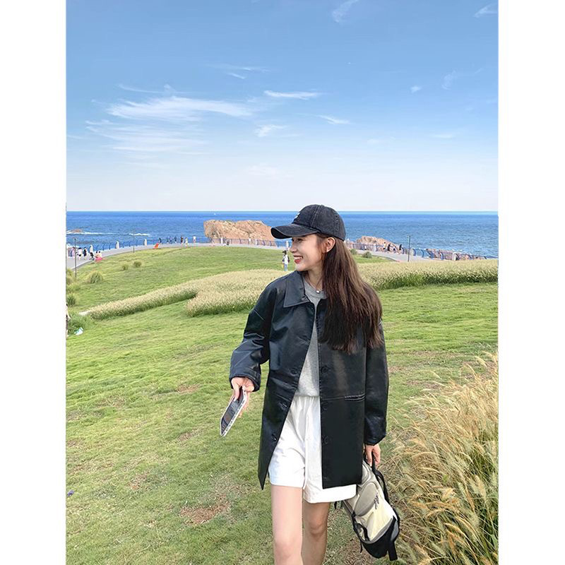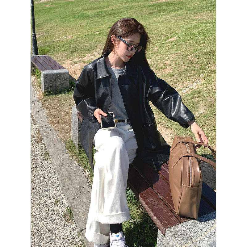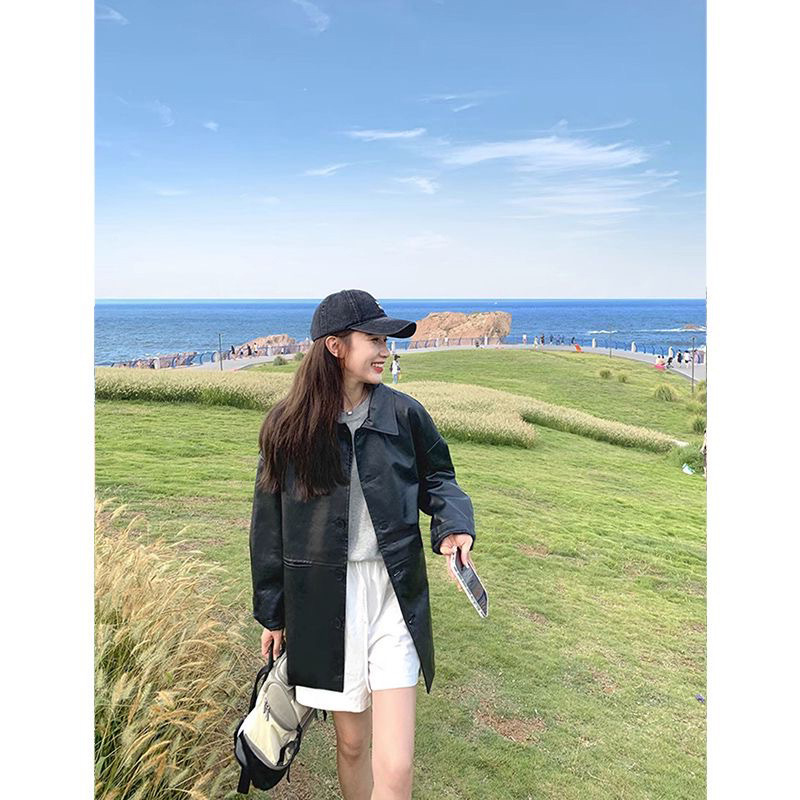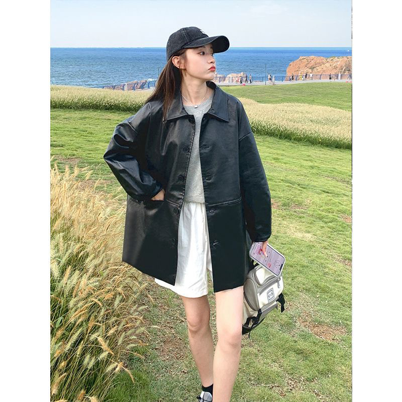 블랙 가죽 자켓 여성의 봄과 가을 2024 새로운 홍콩 스타일 빈티지 BF 유행 옷깃 캐주얼 올 매치 PU 가죽 자켓스토어 가기