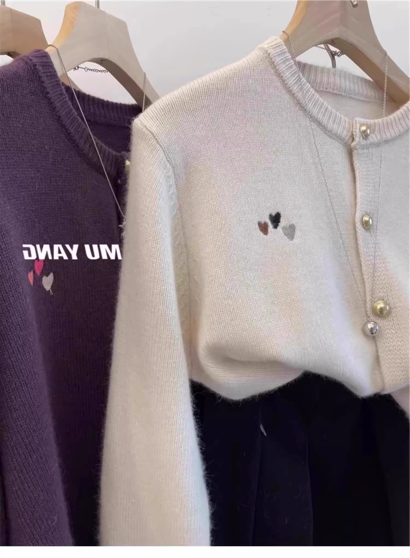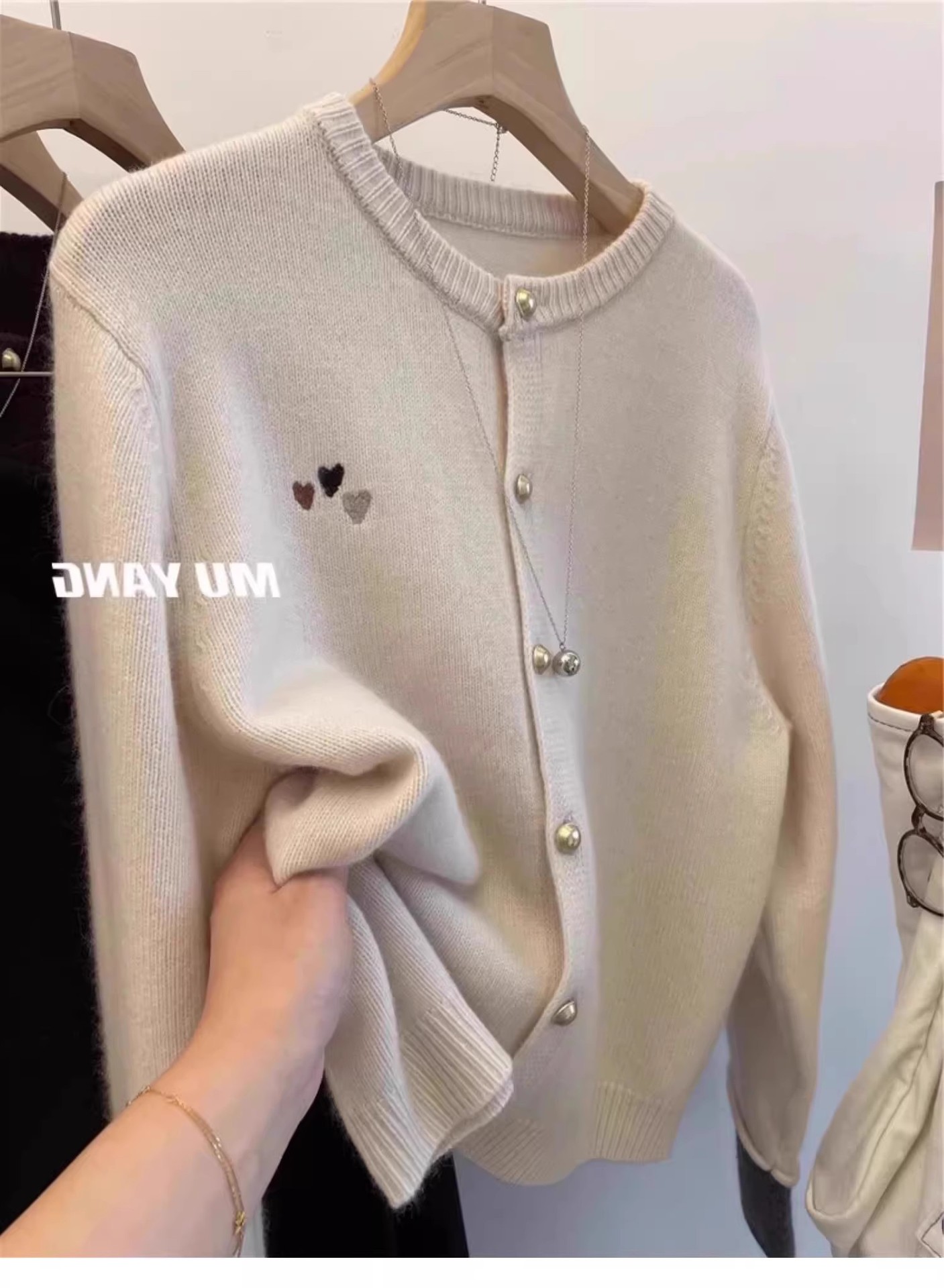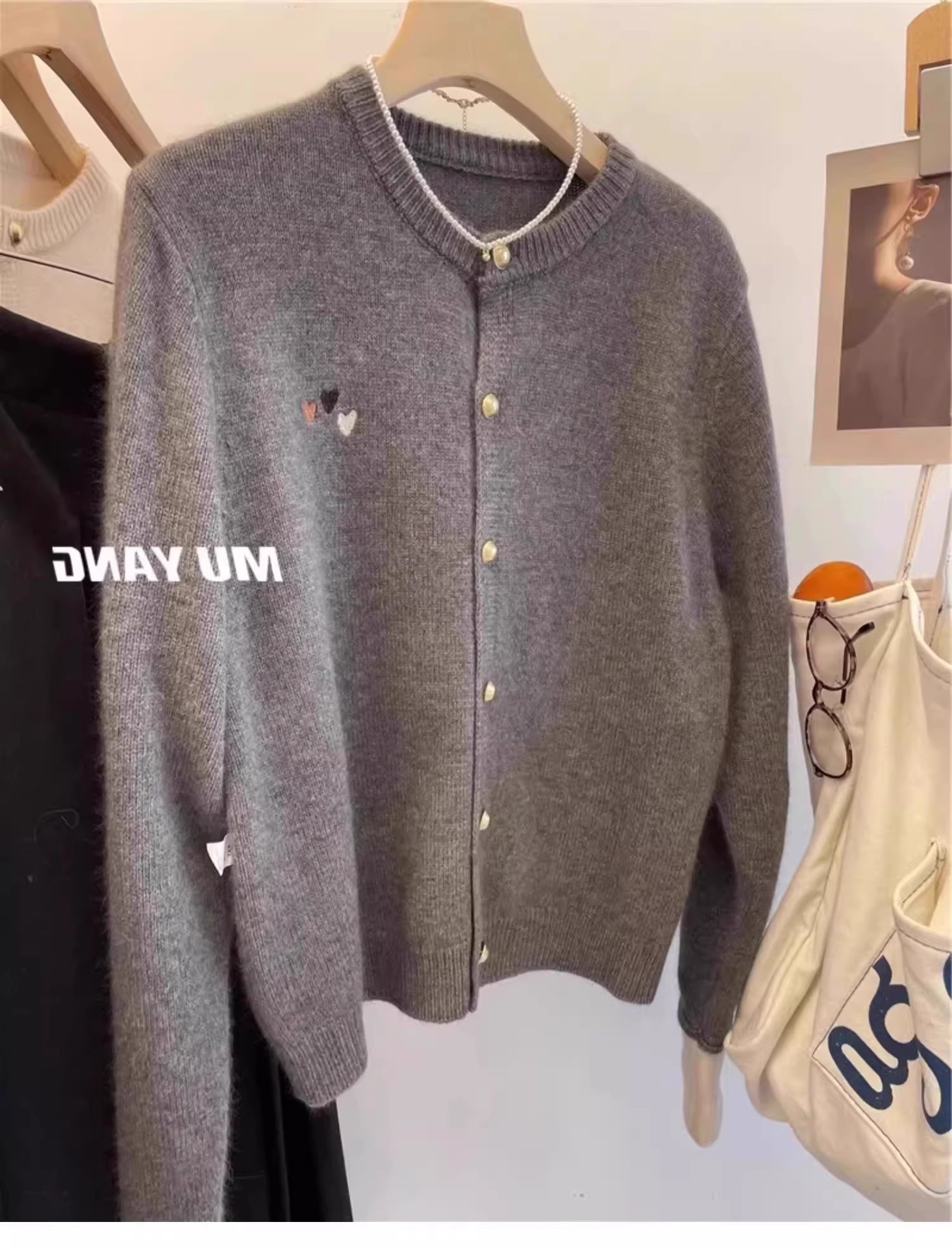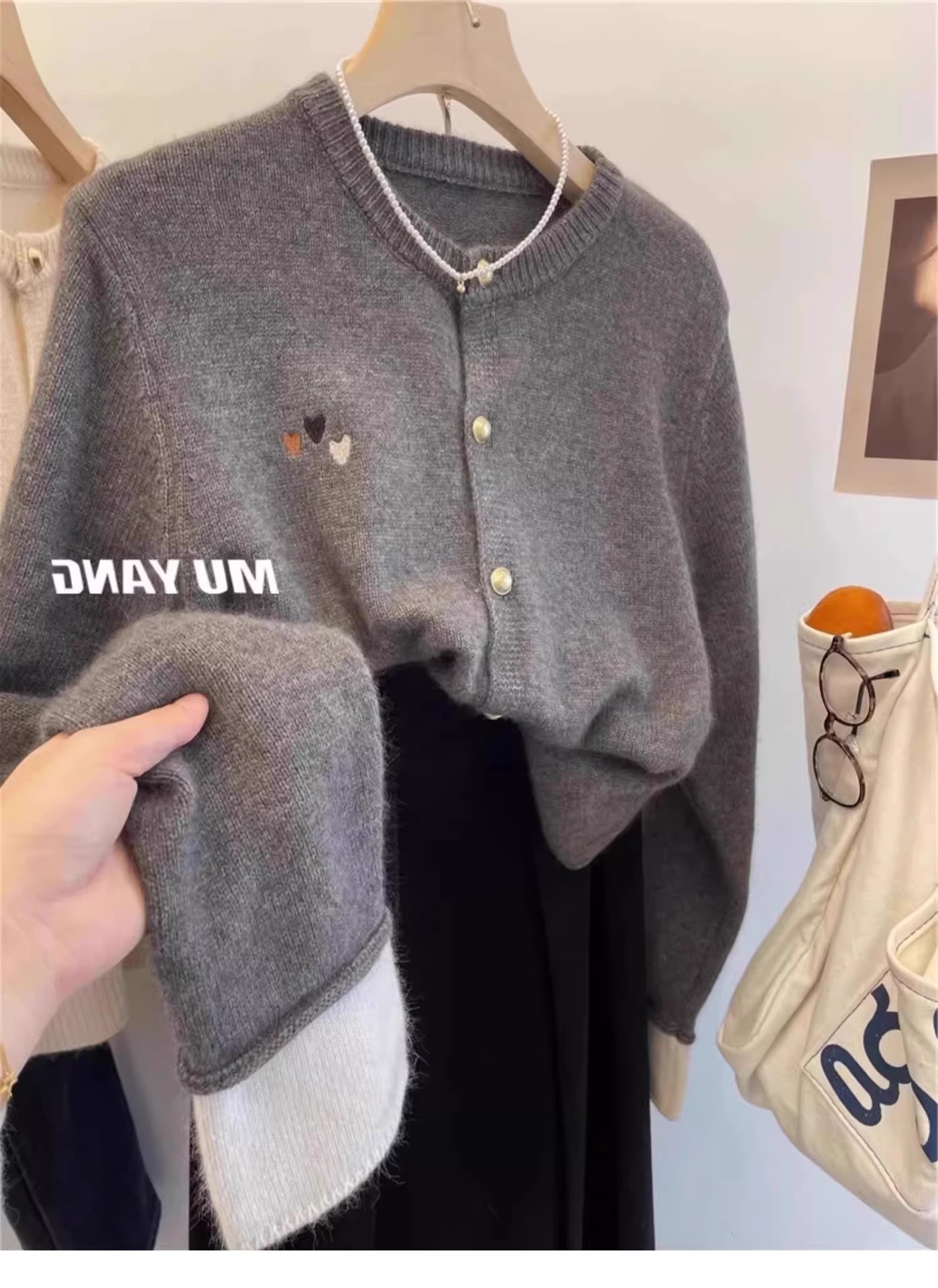 한국 스타일 사랑 자수 둥근 목 니트 카디건 여자 가을 겨울 느슨한 올매치 니트 스웨터 베이스 코트 캐시미어