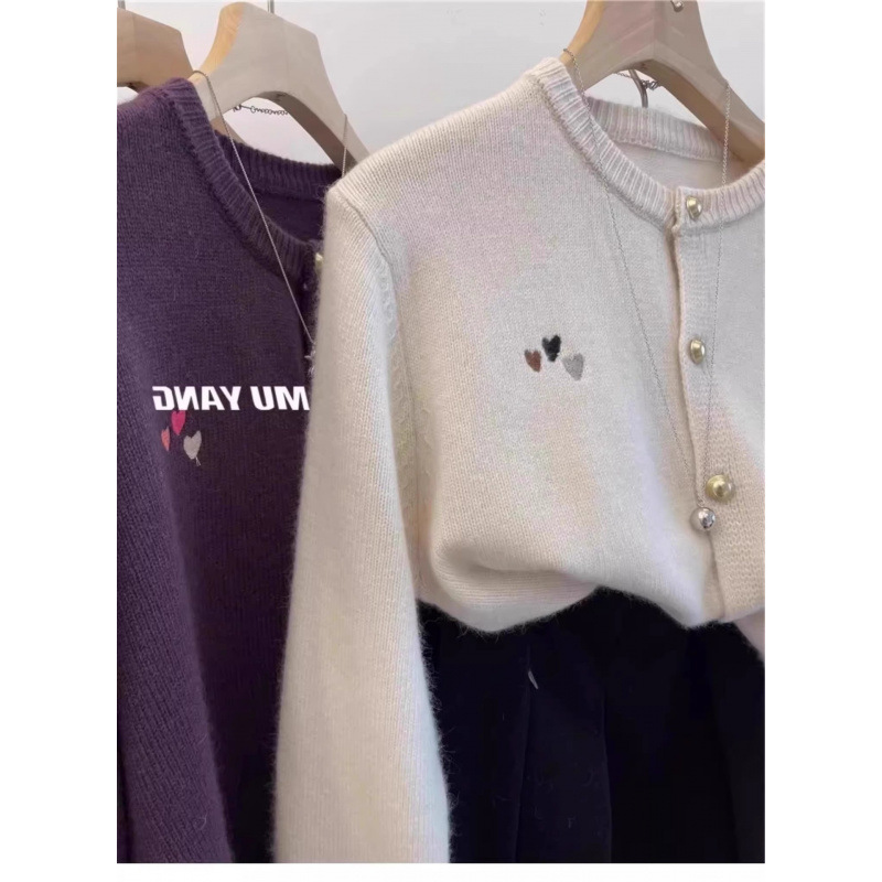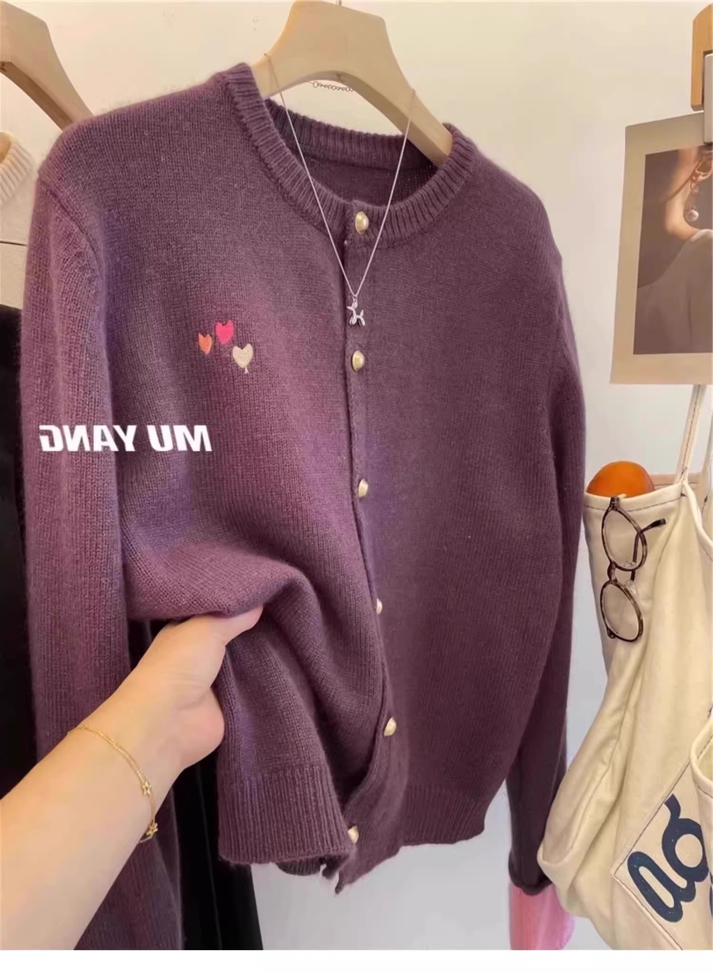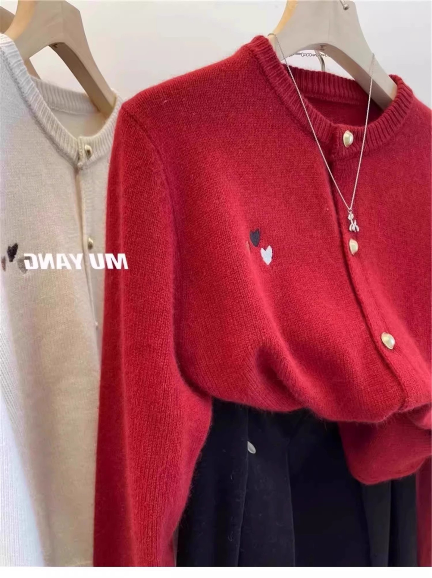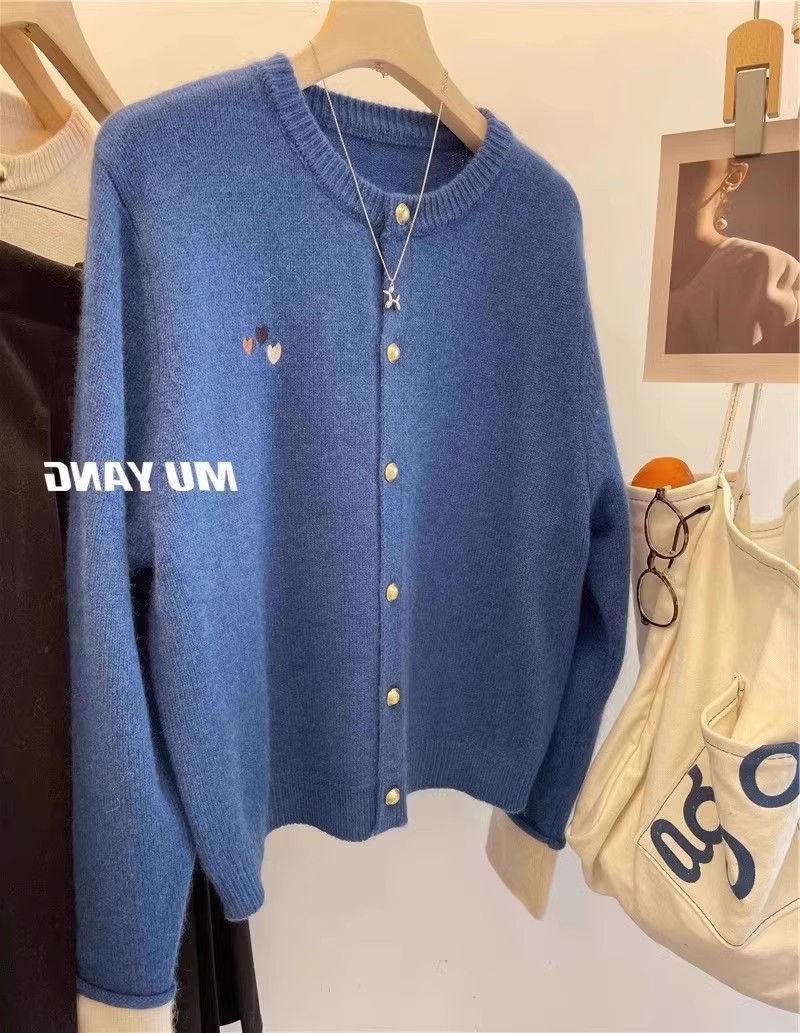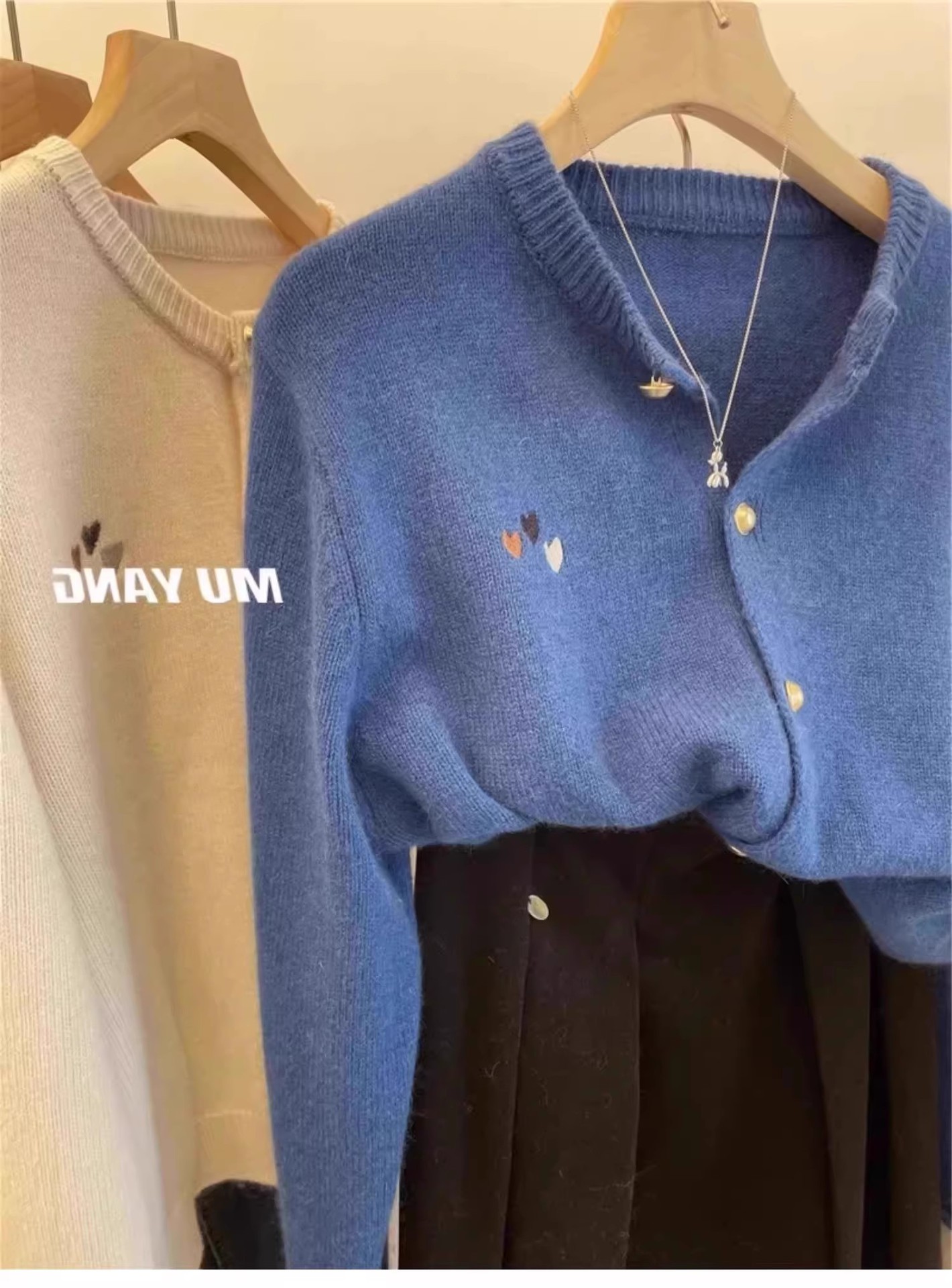 한국 스타일 사랑 자수 둥근 목 니트 카디건 여자 가을 겨울 느슨한 올매치 니트 스웨터 베이스 코트 캐시미어